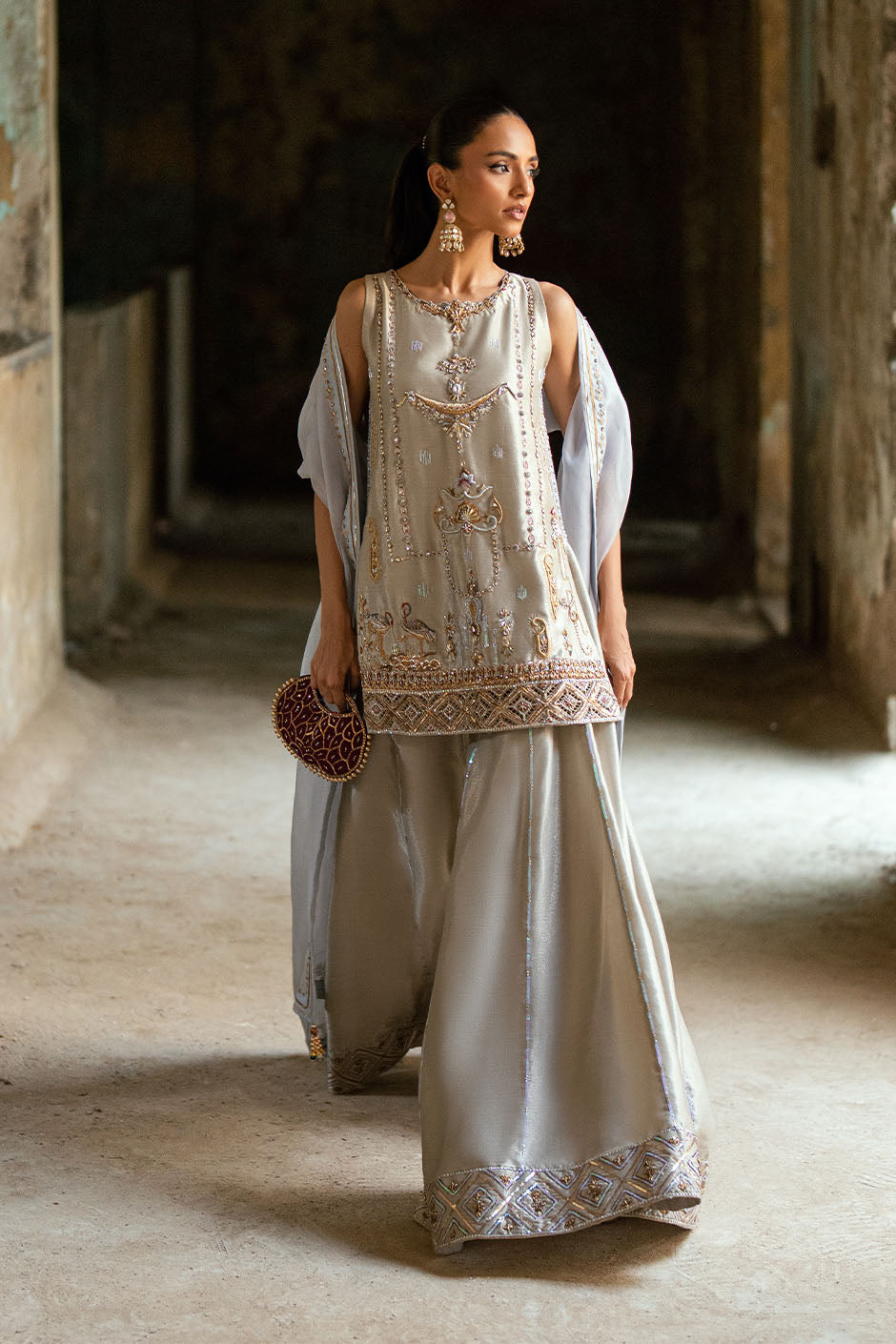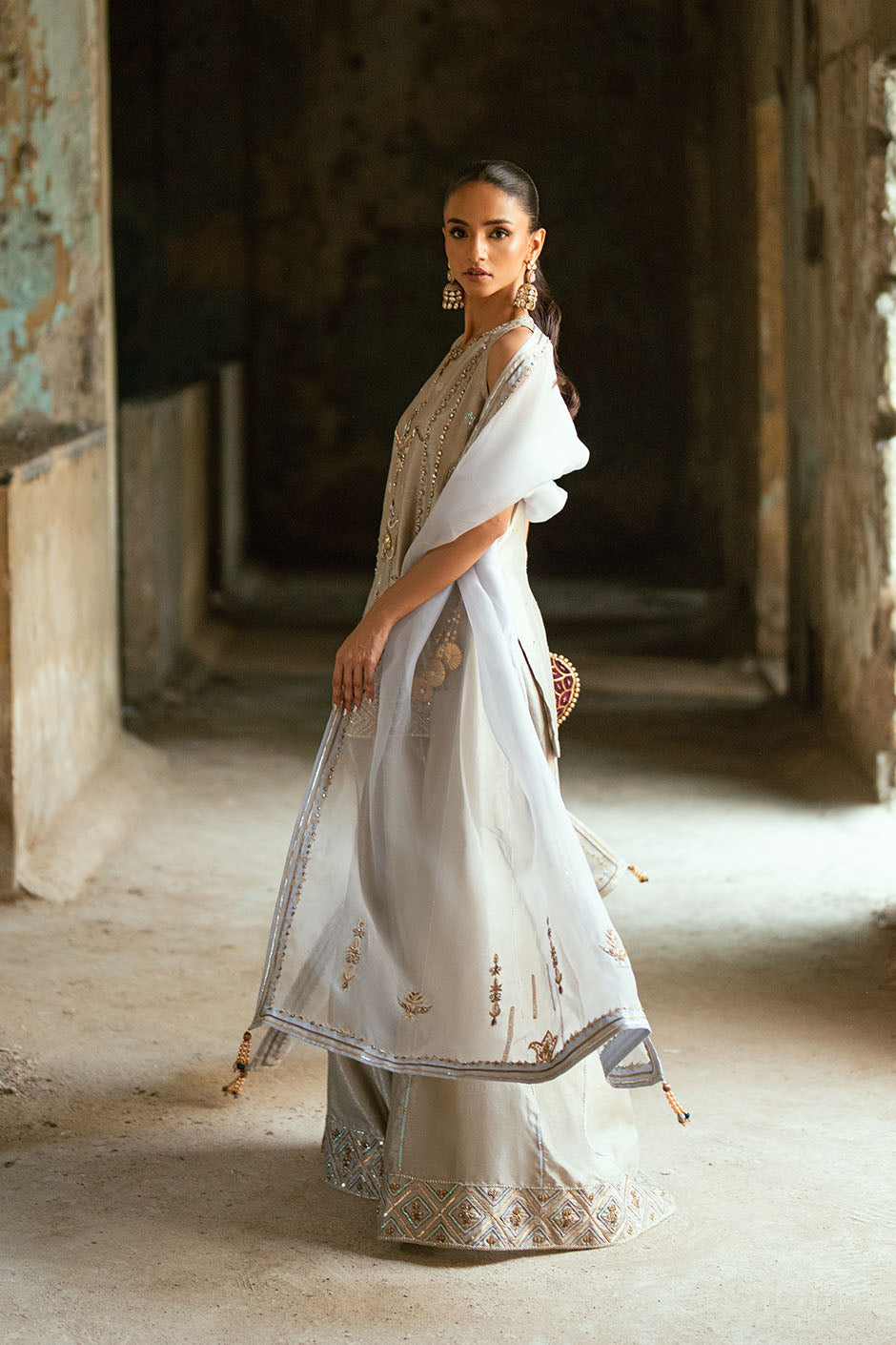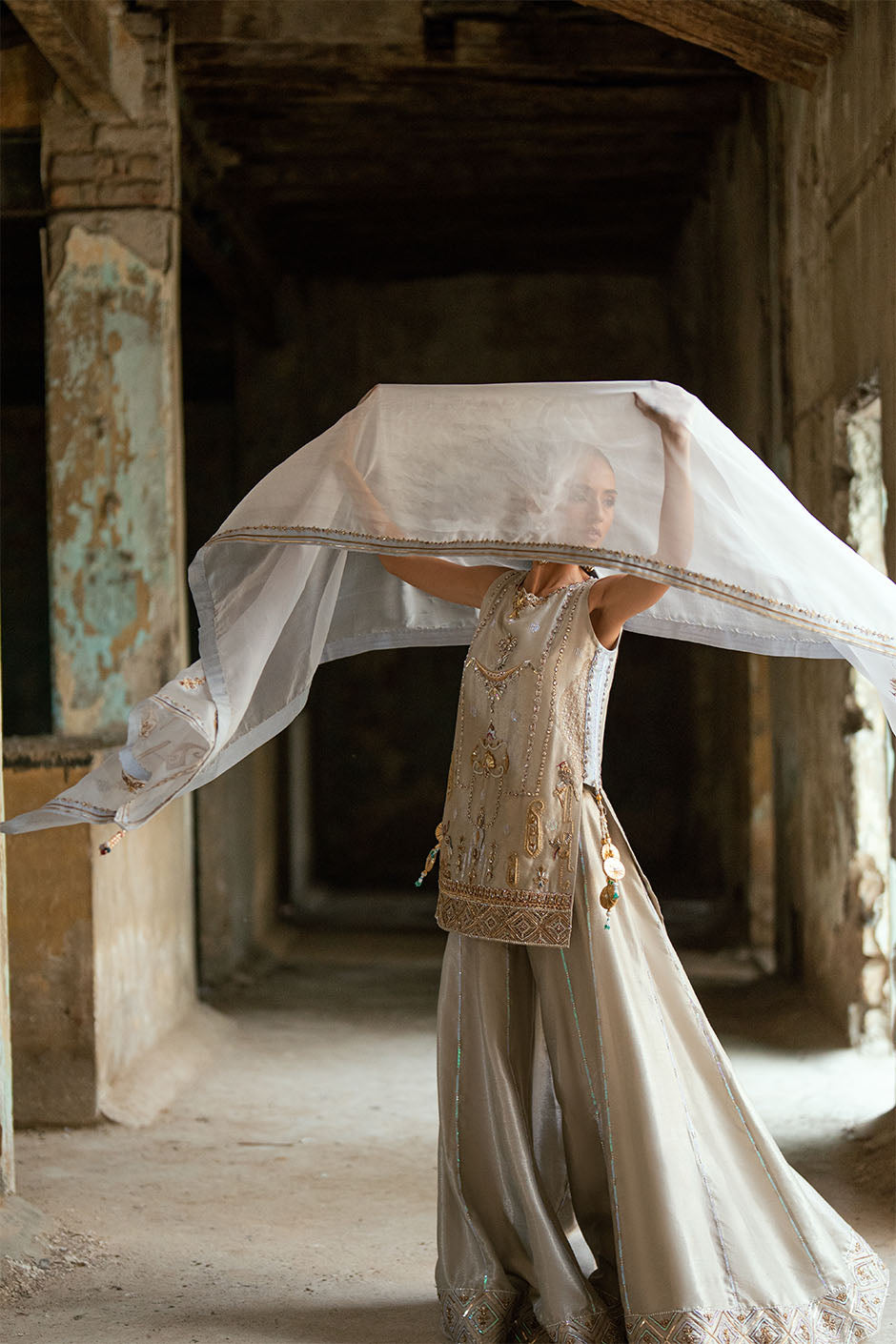 This luminous Lama Stripes set blends tradition and modernity structured shoulders, and asymmetrical hem. Handworked with Kamdaani Marrori, Cora, and Dabka, it pairs perfectly with cropped trousers and a delicate 3-yard organza dupatta for a refined, contemporary look.