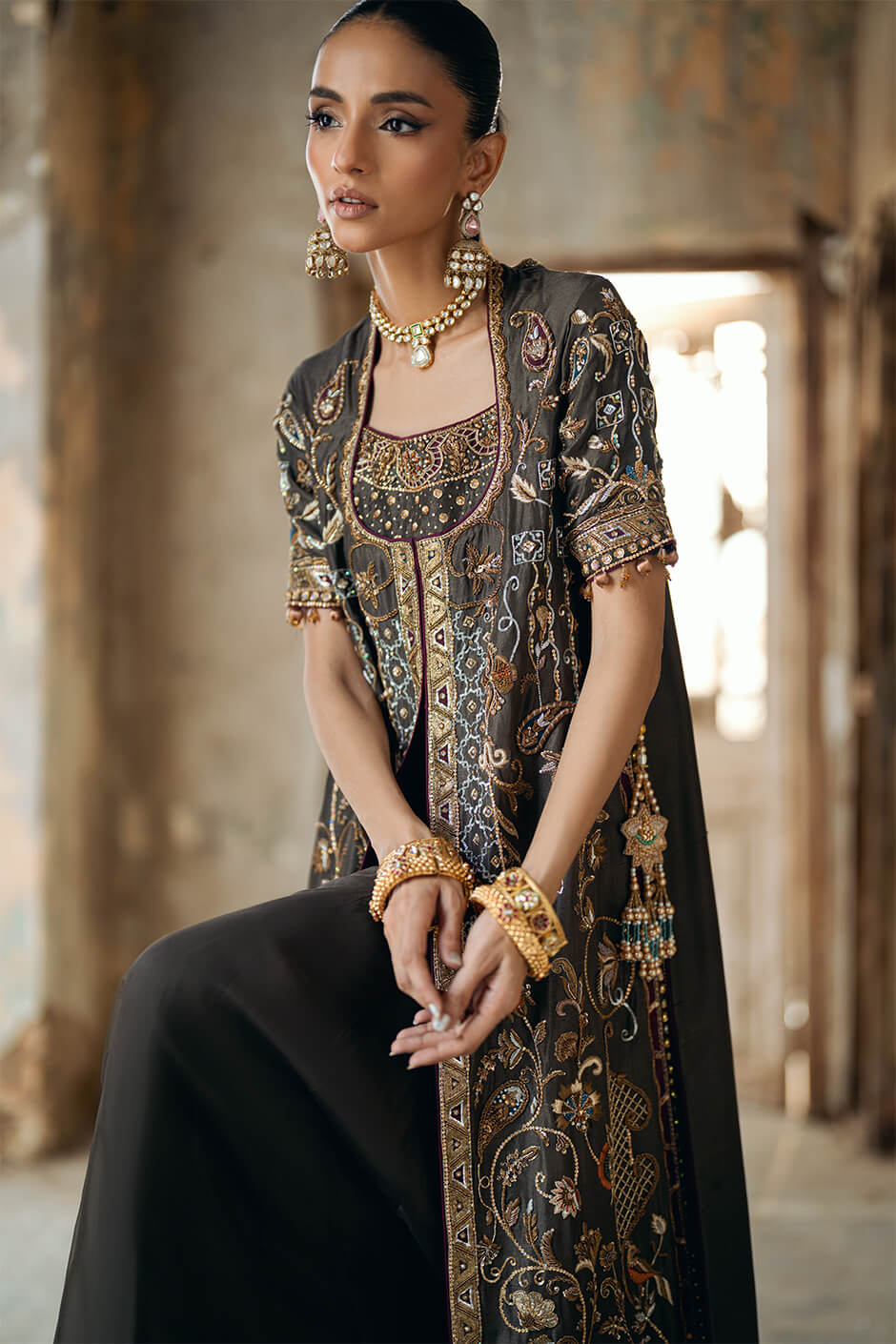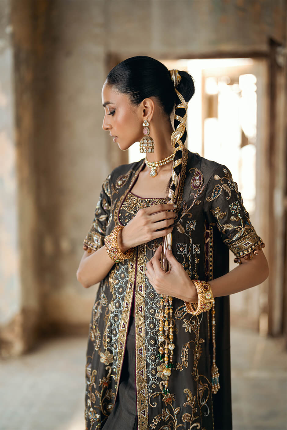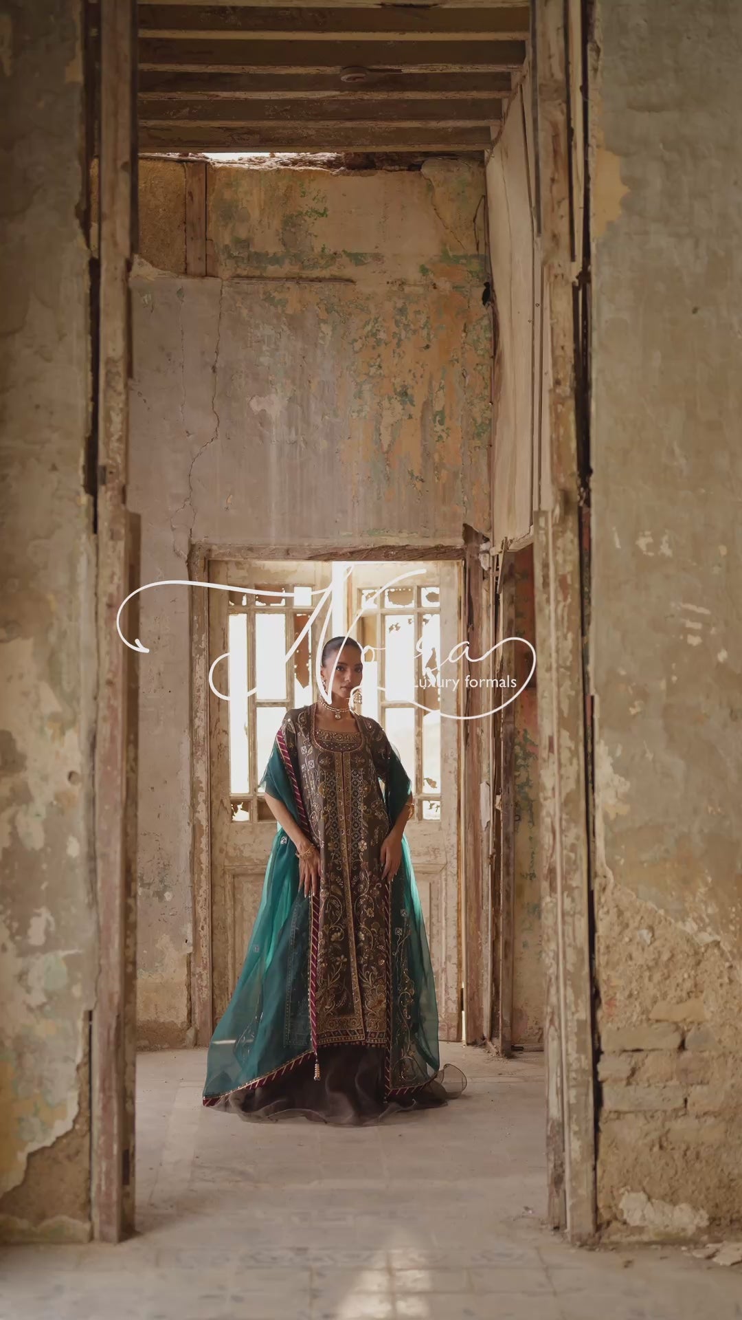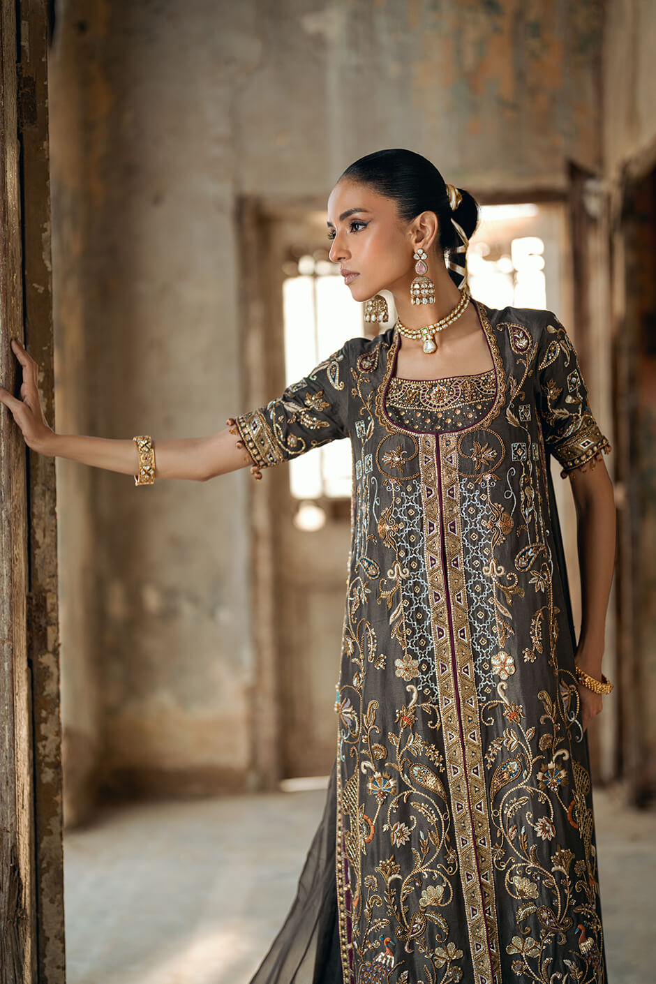 This stunning ensemble features an olive jacket crafted from pure 80-gram raw silk, intricately adorned with gota, cora dabka, pitta work, resham work, and exquisite appliqué work.Paired with this beautiful jacket is a flowing sharara made from pure organza.The dupatta, also crafted from pure organza and measuring 3 yards in length, features intricate gota work, hand embellishments, and embroidery on its borders.