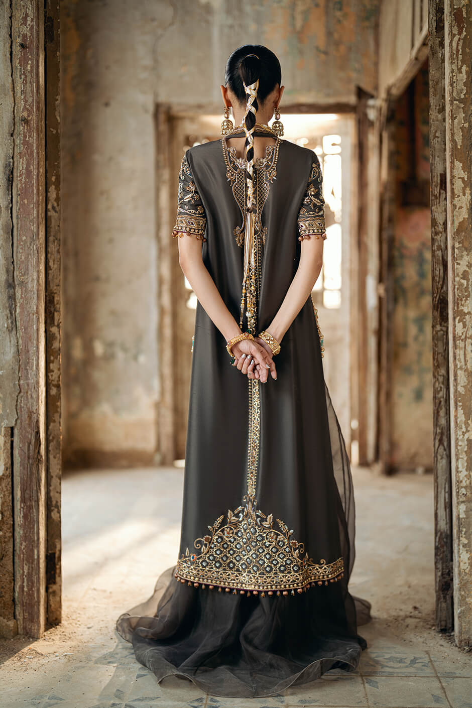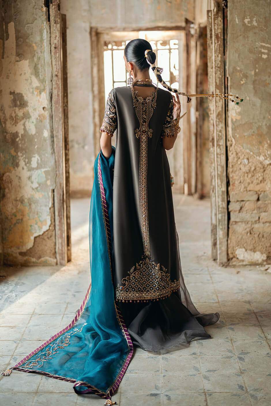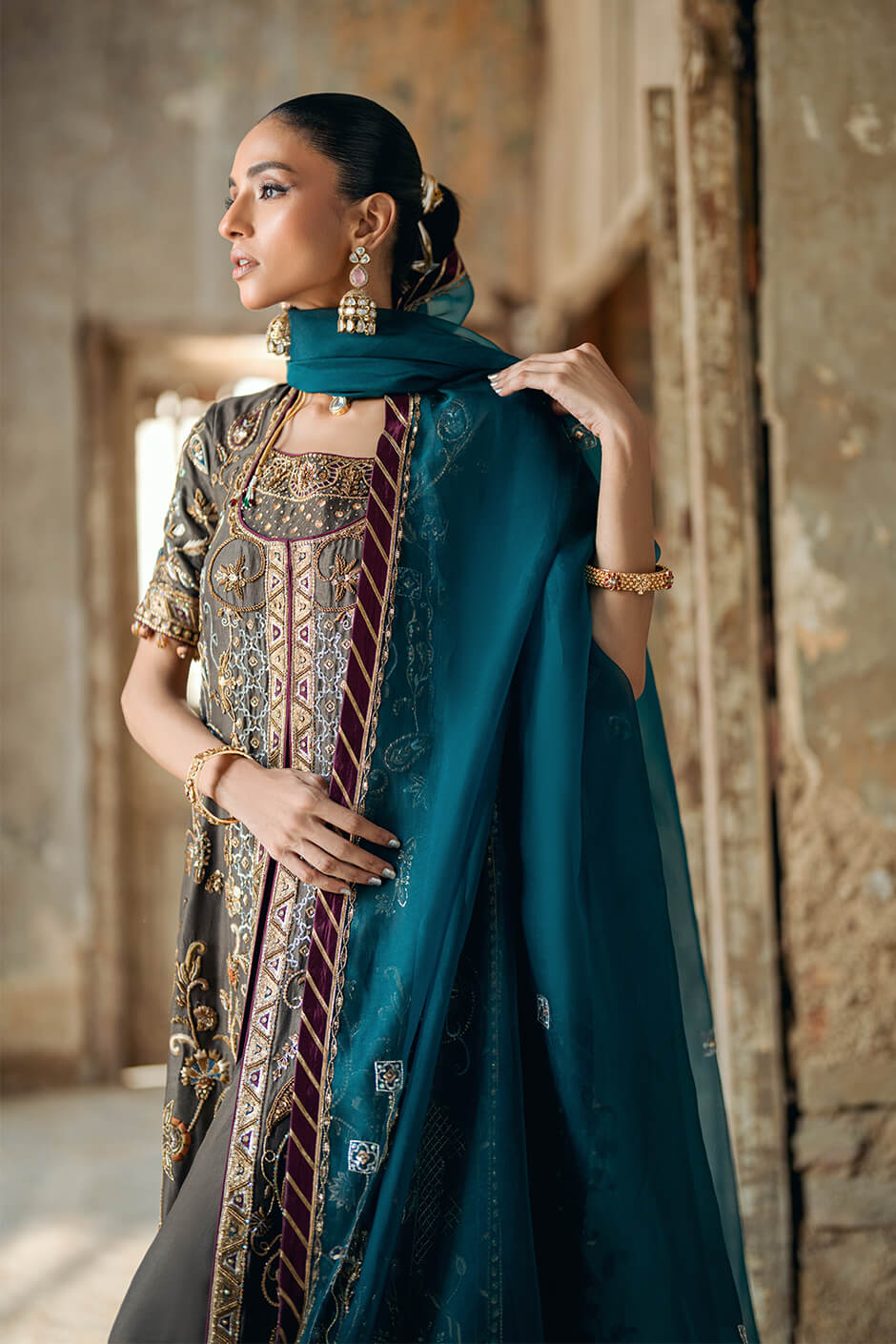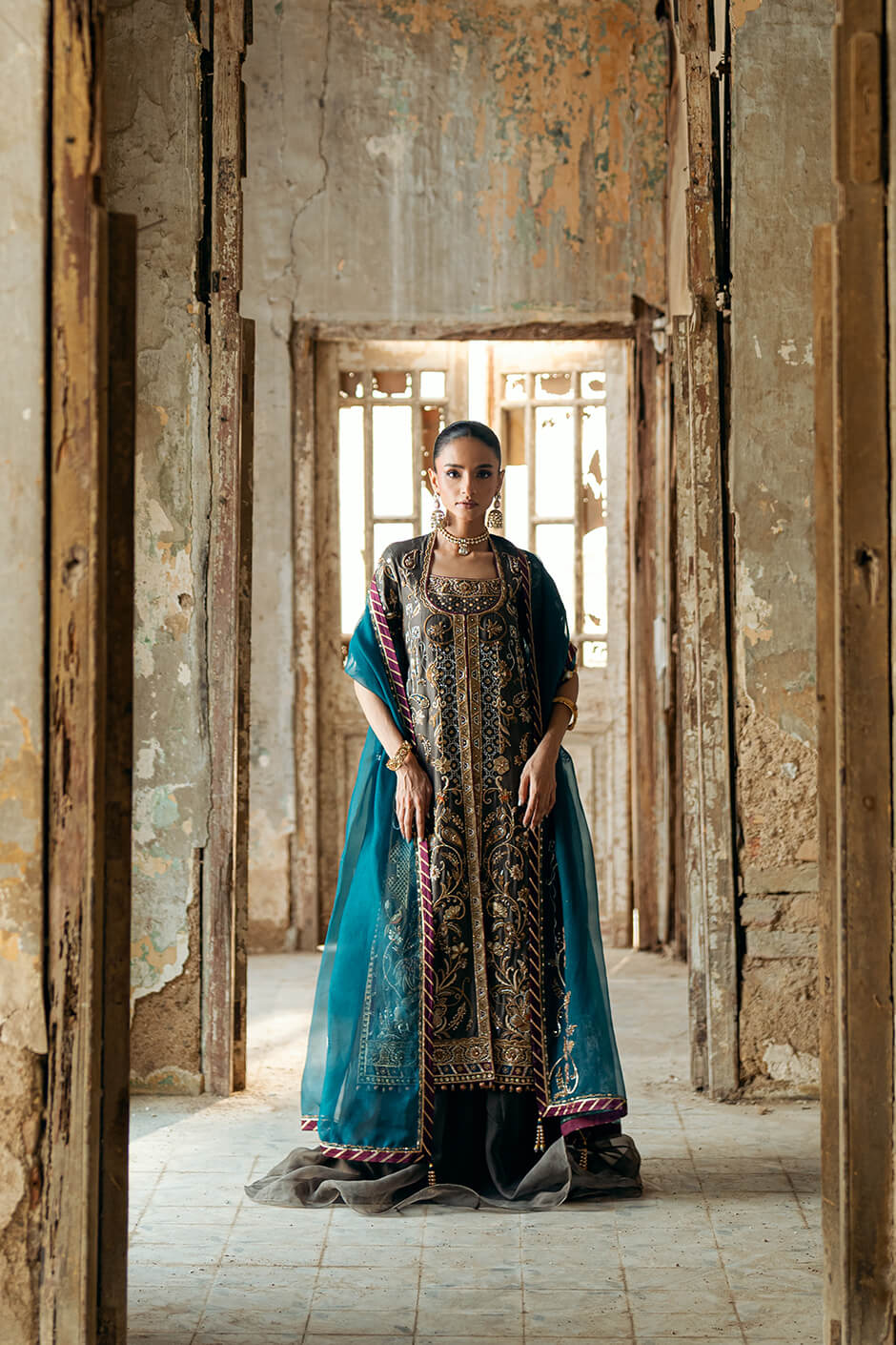 This stunning ensemble features an olive jacket crafted from pure 80-gram raw silk, intricately adorned with gota, cora dabka, pitta work, resham work, and exquisite appliqué work.Paired with this beautiful jacket is a flowing sharara made from pure organza.The dupatta, also crafted from pure organza and measuring 3 yards in length, features intricate gota work, hand embellishments, and embroidery on its borders.