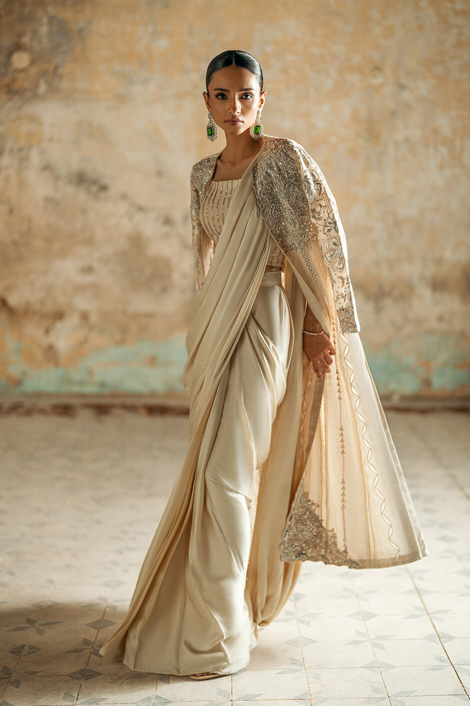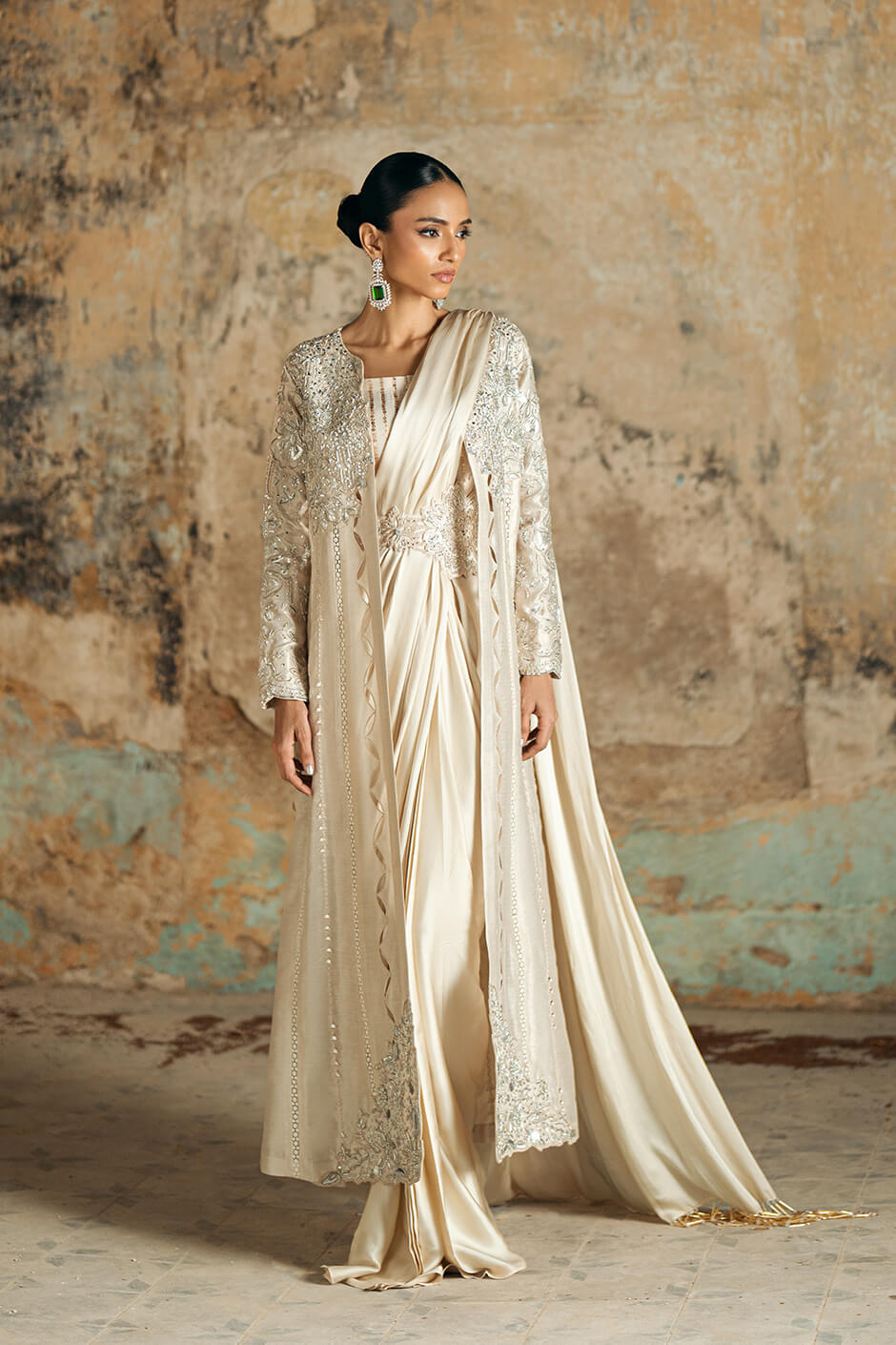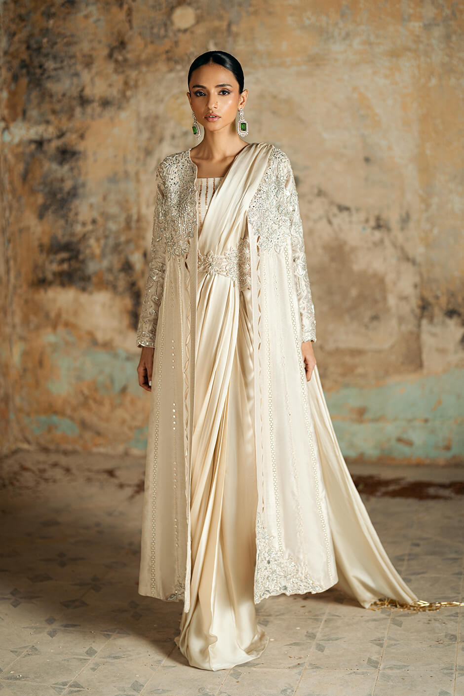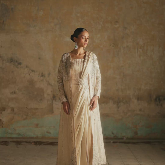 This stunning ensemble features a jacket crafted from pure striped lawn fabric, intricately adorned with kora dabka, pearls, sequence work, and delicate cutwork. A hint of mirror work adds a touch of elegance. Paired with this exquisite jacket is a flowing saree made from pure shamooz fabric, exuding refinement and sophistication.