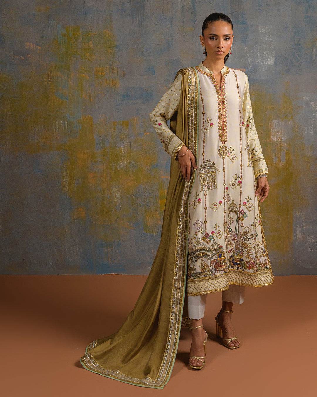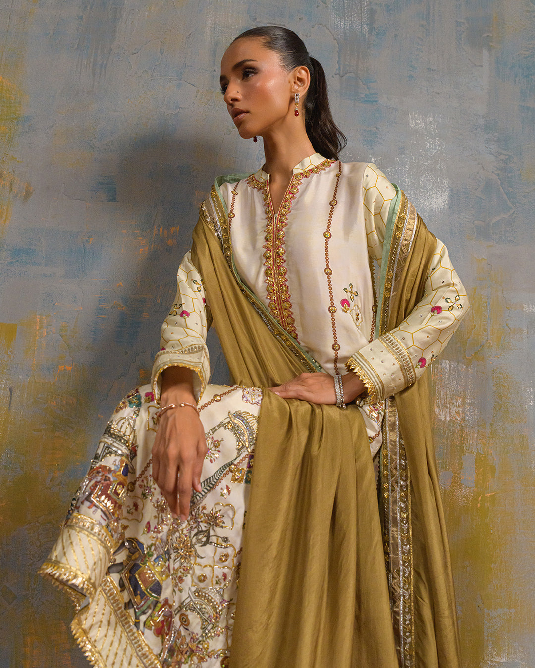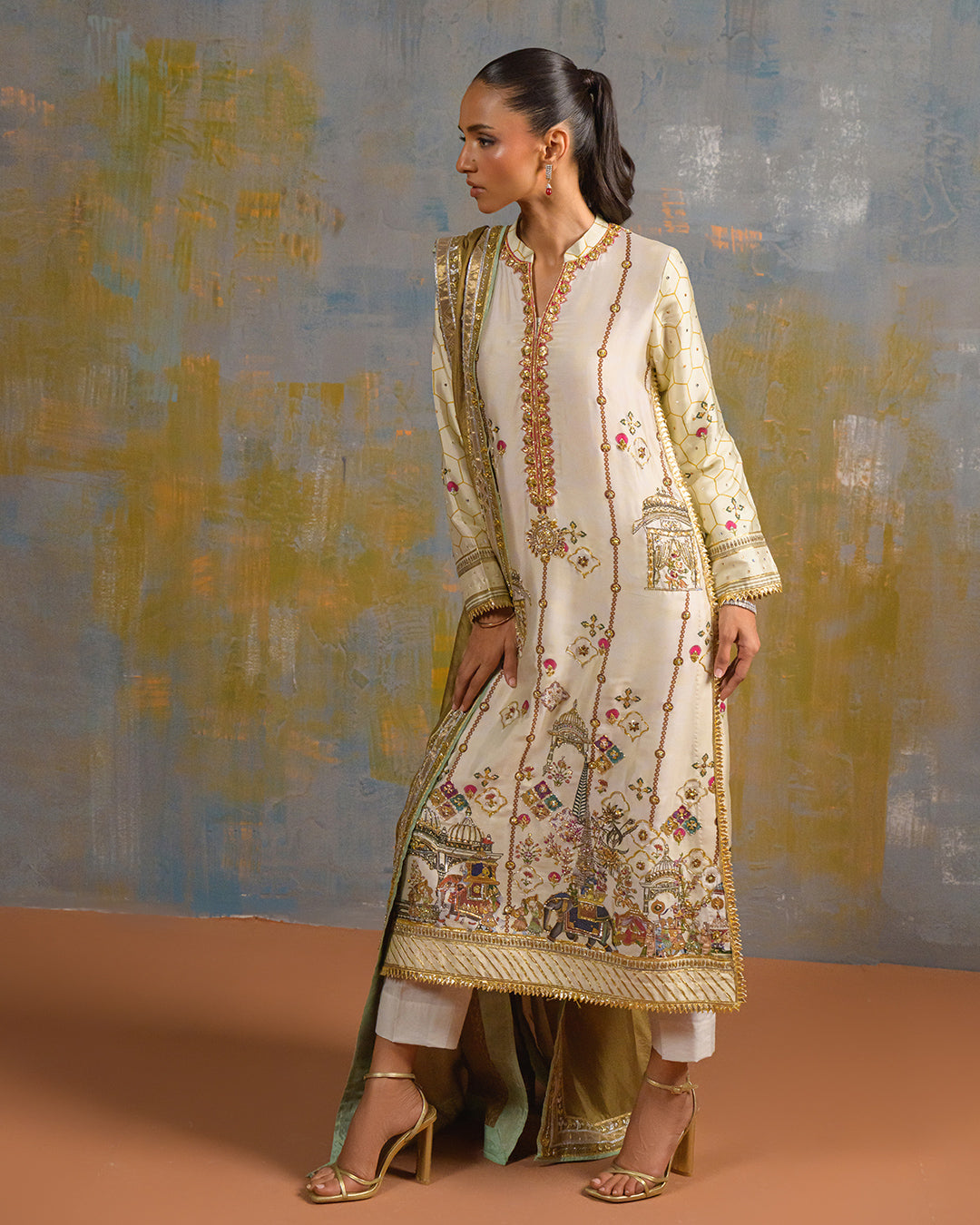 Printed long shirt in luxurious pure butter silk with khaddi silk pants. Adorned with hand-touching embroidery, gota work, and sequins.
