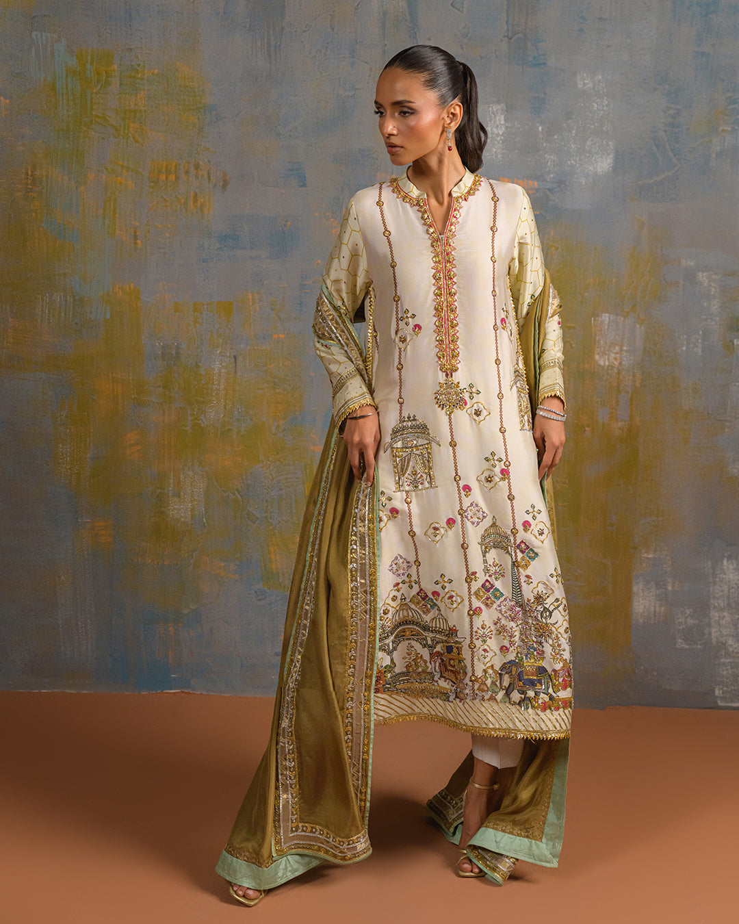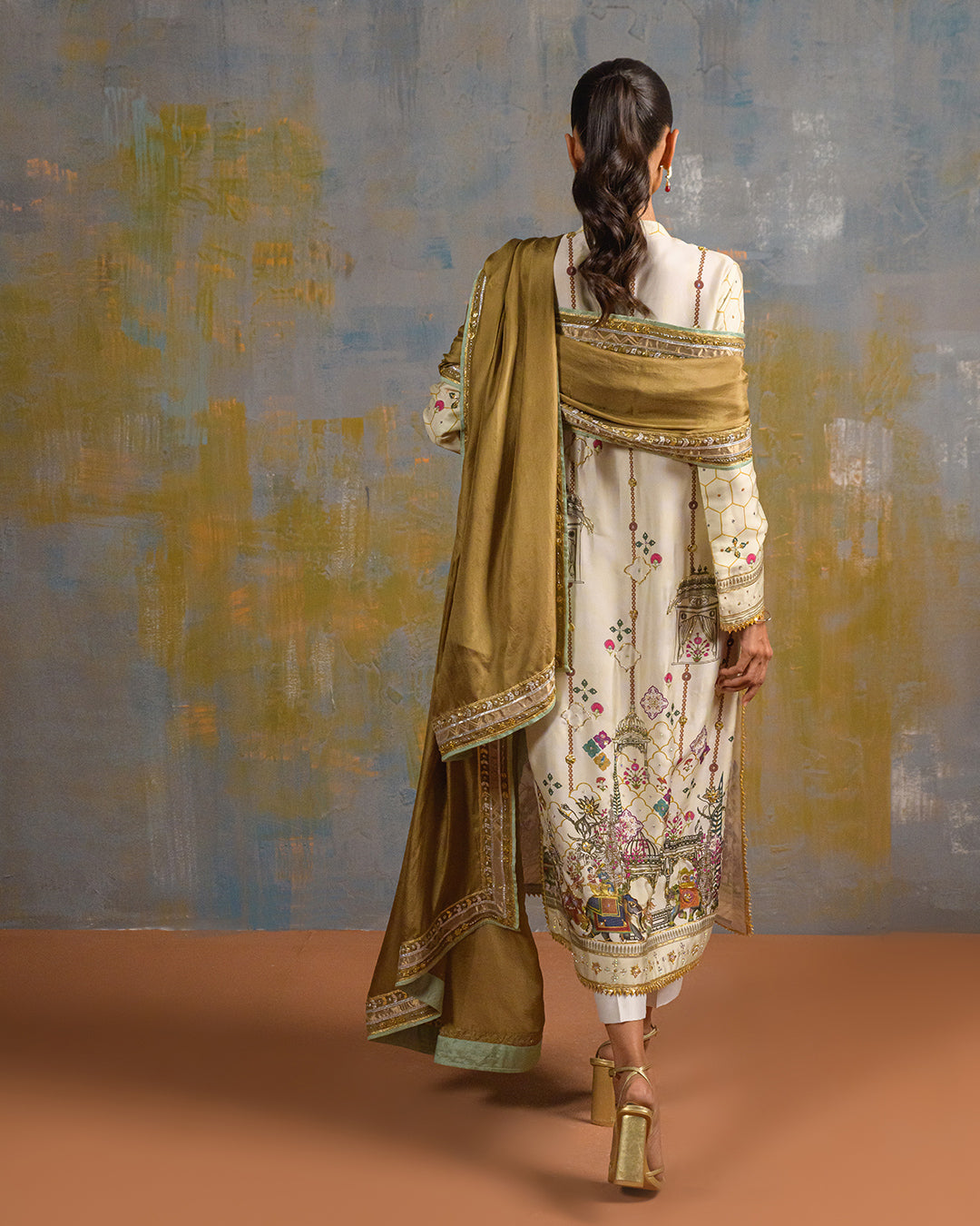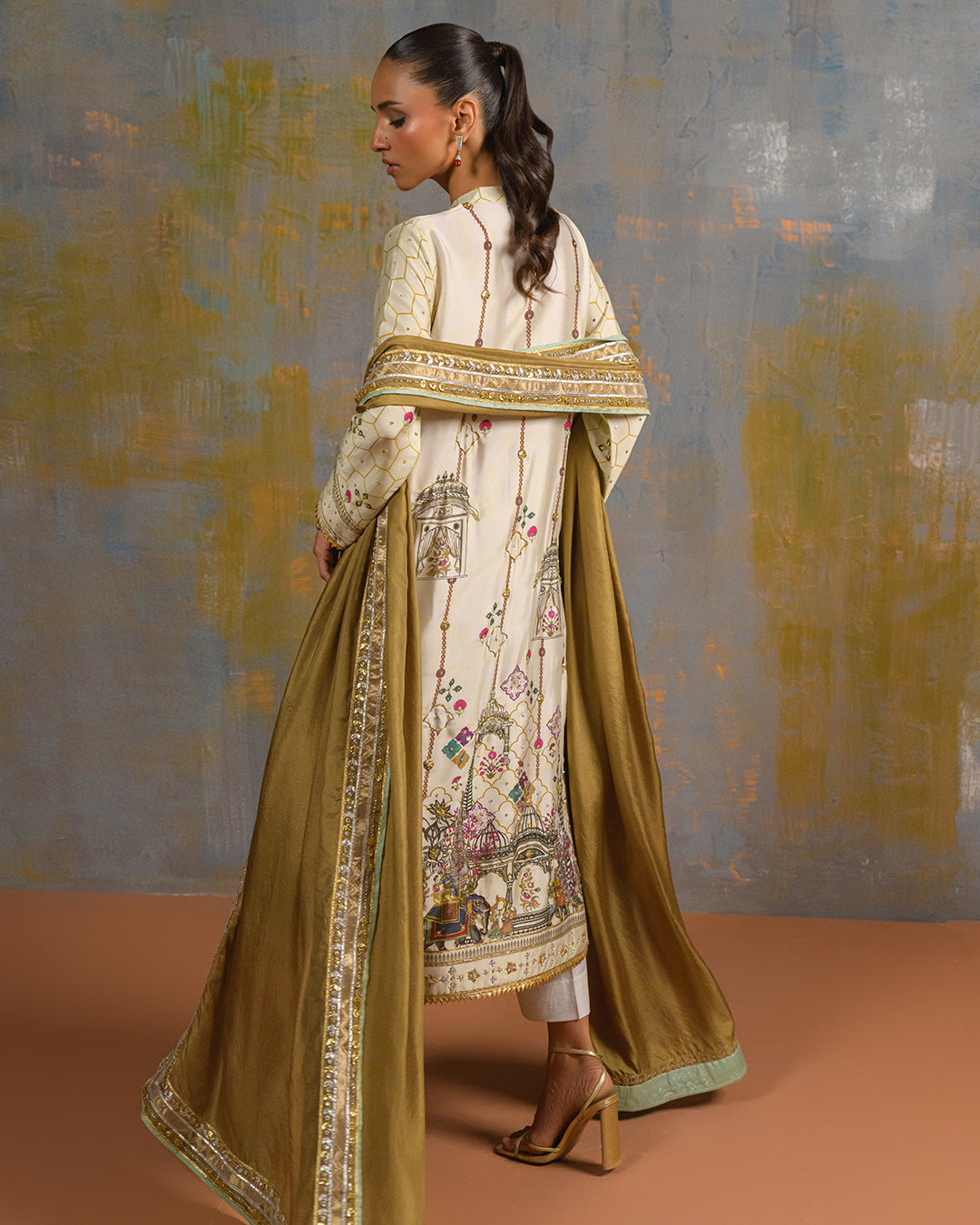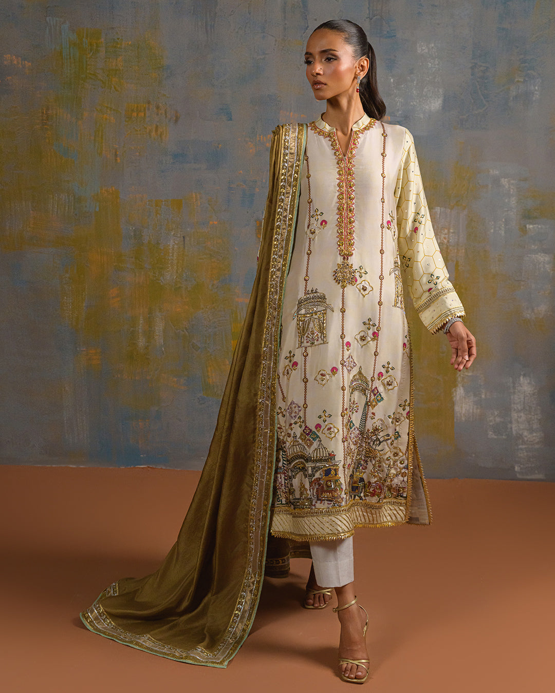 Printed long shirt in luxurious pure butter silk with khaddi silk pants. Adorned with hand-touching embroidery, gota work, and sequins.