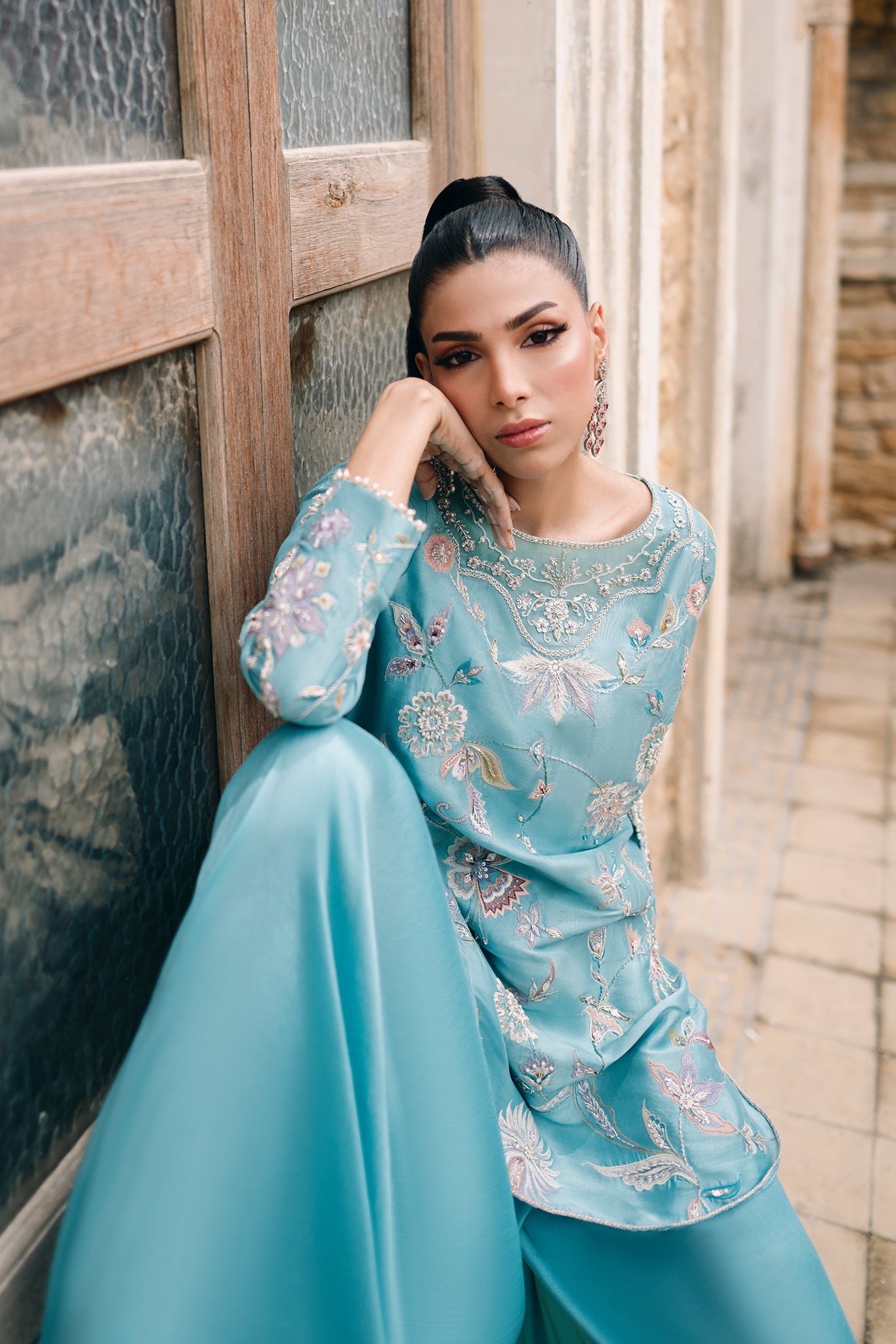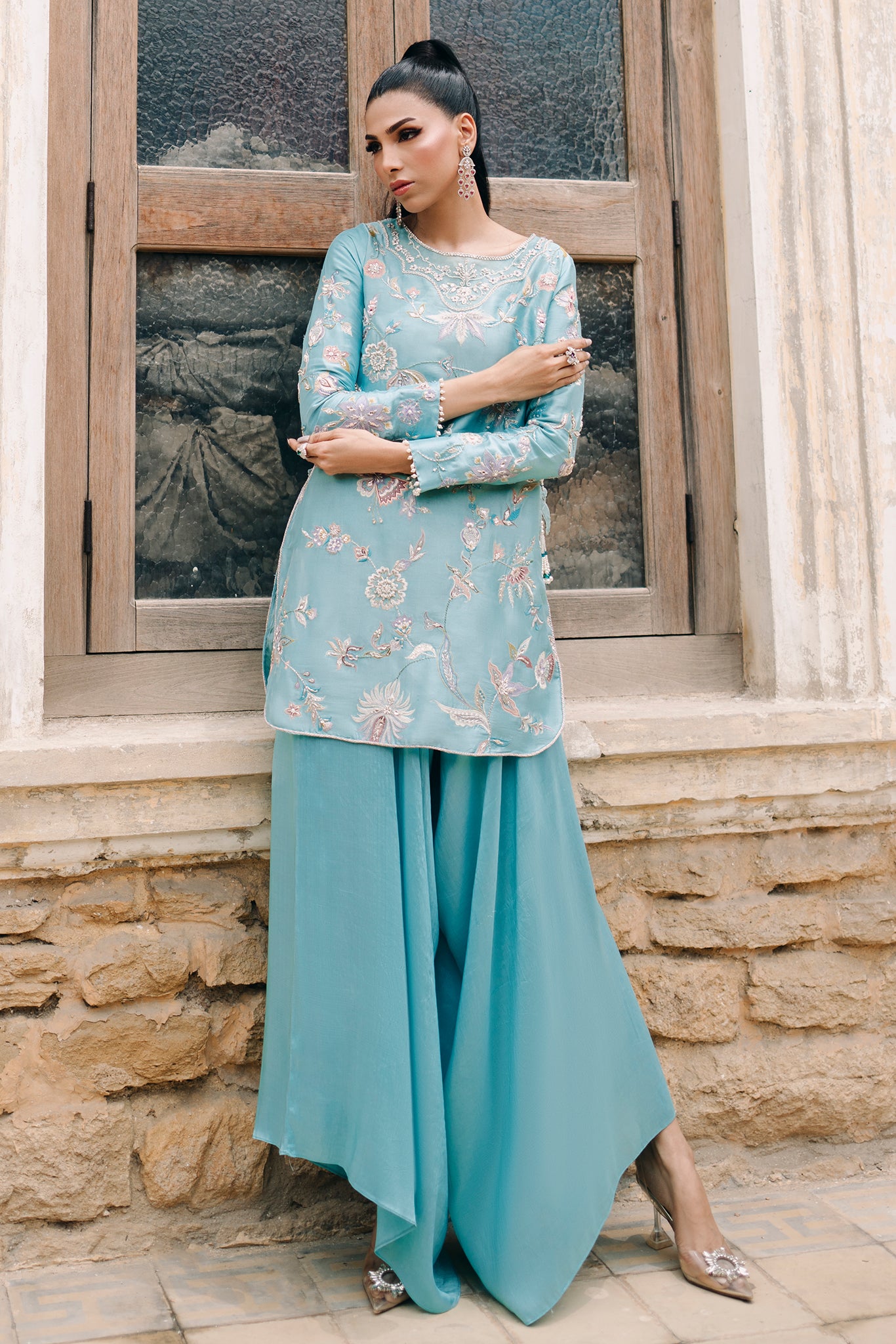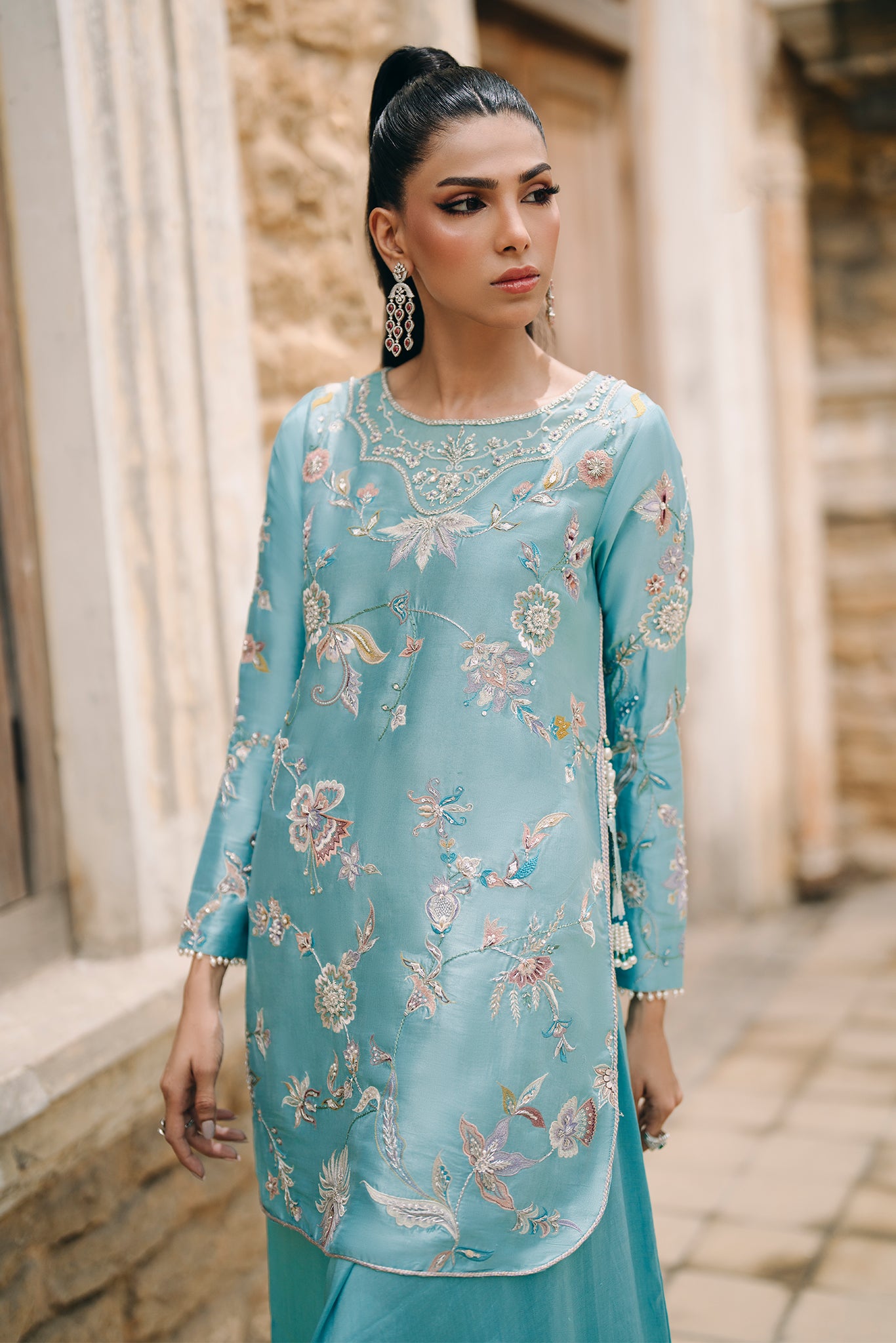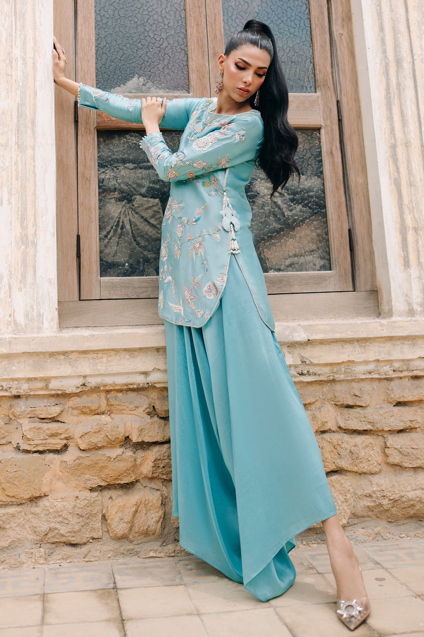 Mia epitomizes chic elegance with its pure butter silk shirt in a captivating shade of turquoise. Adorned with exquisite pastel resham embroideries, the shirt's allure is further enhanced by a hand-embellished neckline and peacock tassels that dangle with sophistication. Paired with box pants that inject a modern, stylish edge, making this outfit a perfect choice for a bride’s sister or friend who wishes to captivate and stand out in a crowd.