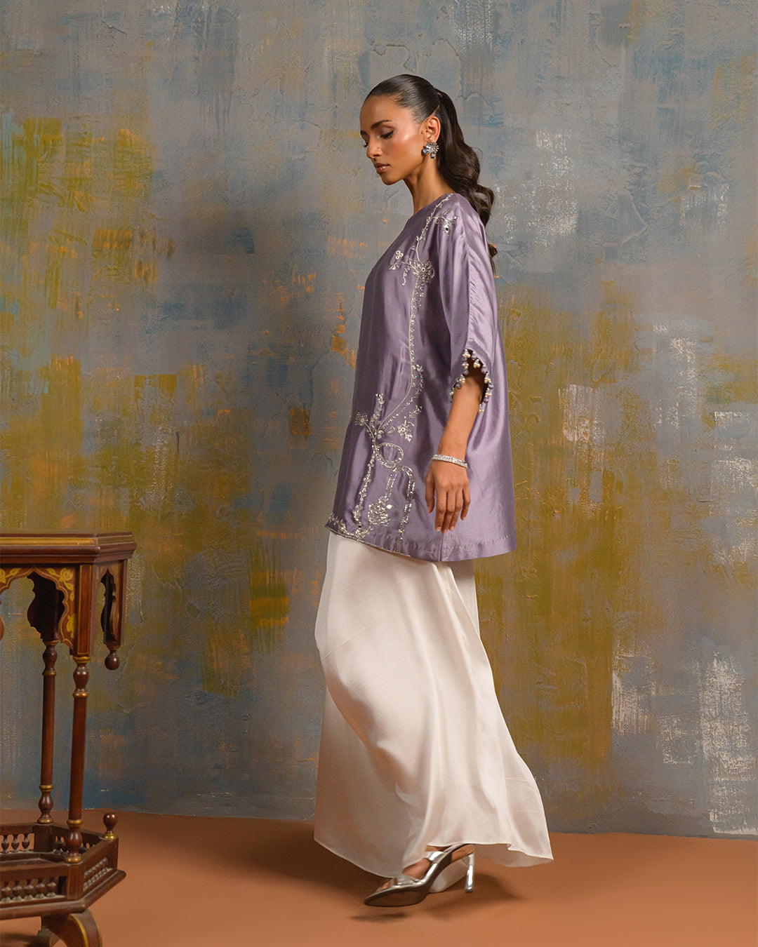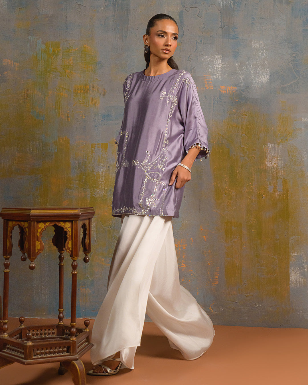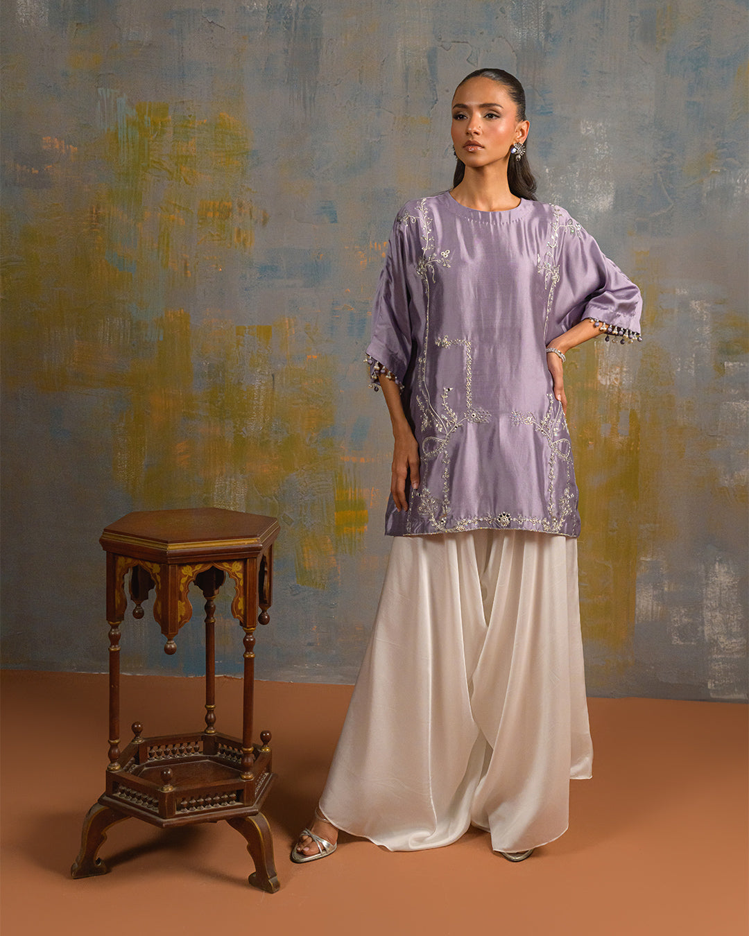This exquisite ensemble features a pure butter silk shirt and box pants, intricately embellished with delicate cora embroidery, sparkling sequins, and meticulous handwork. The sleeves are finished with short tassels, adding a touch of elegance and sophistication.