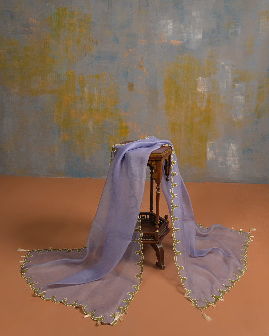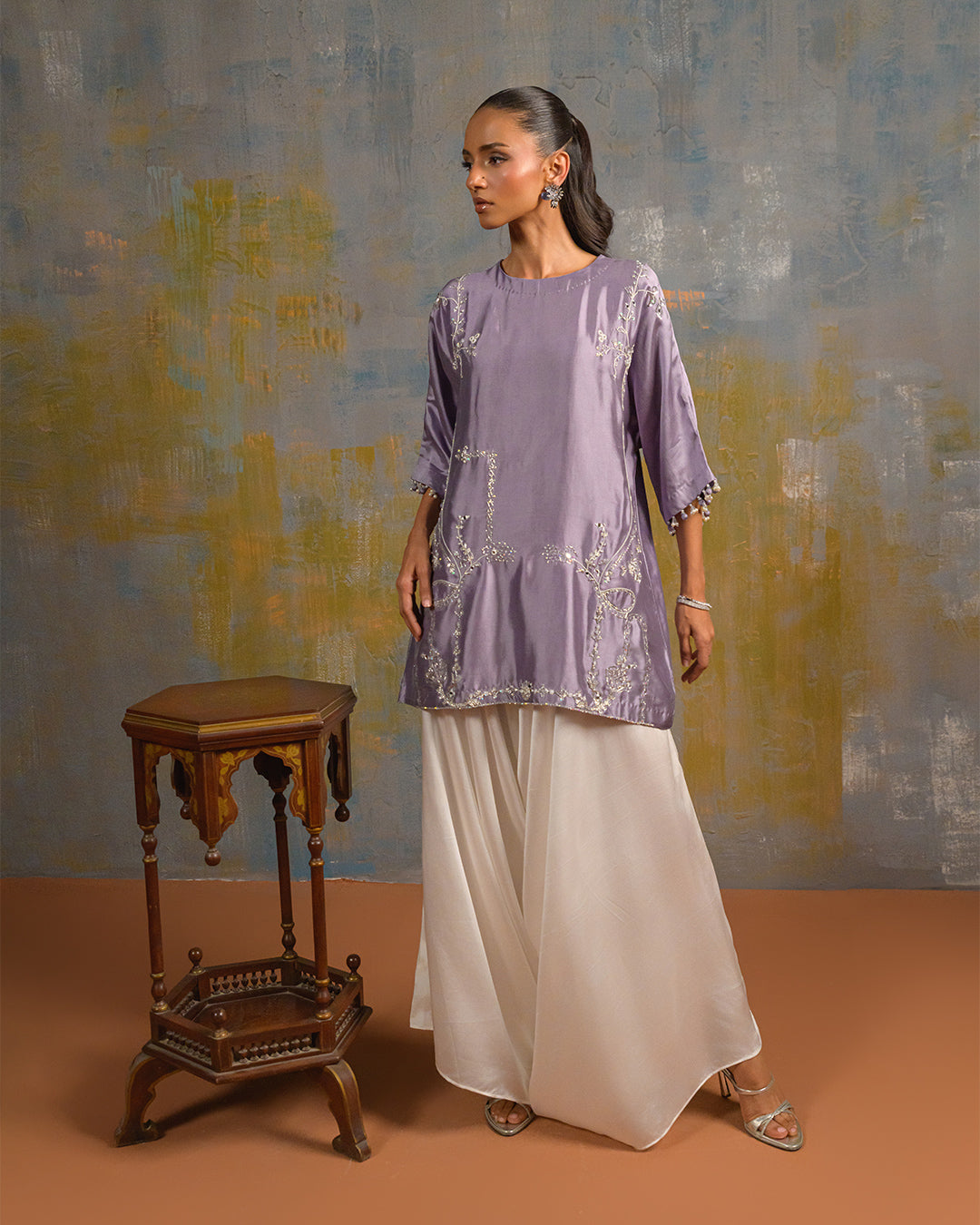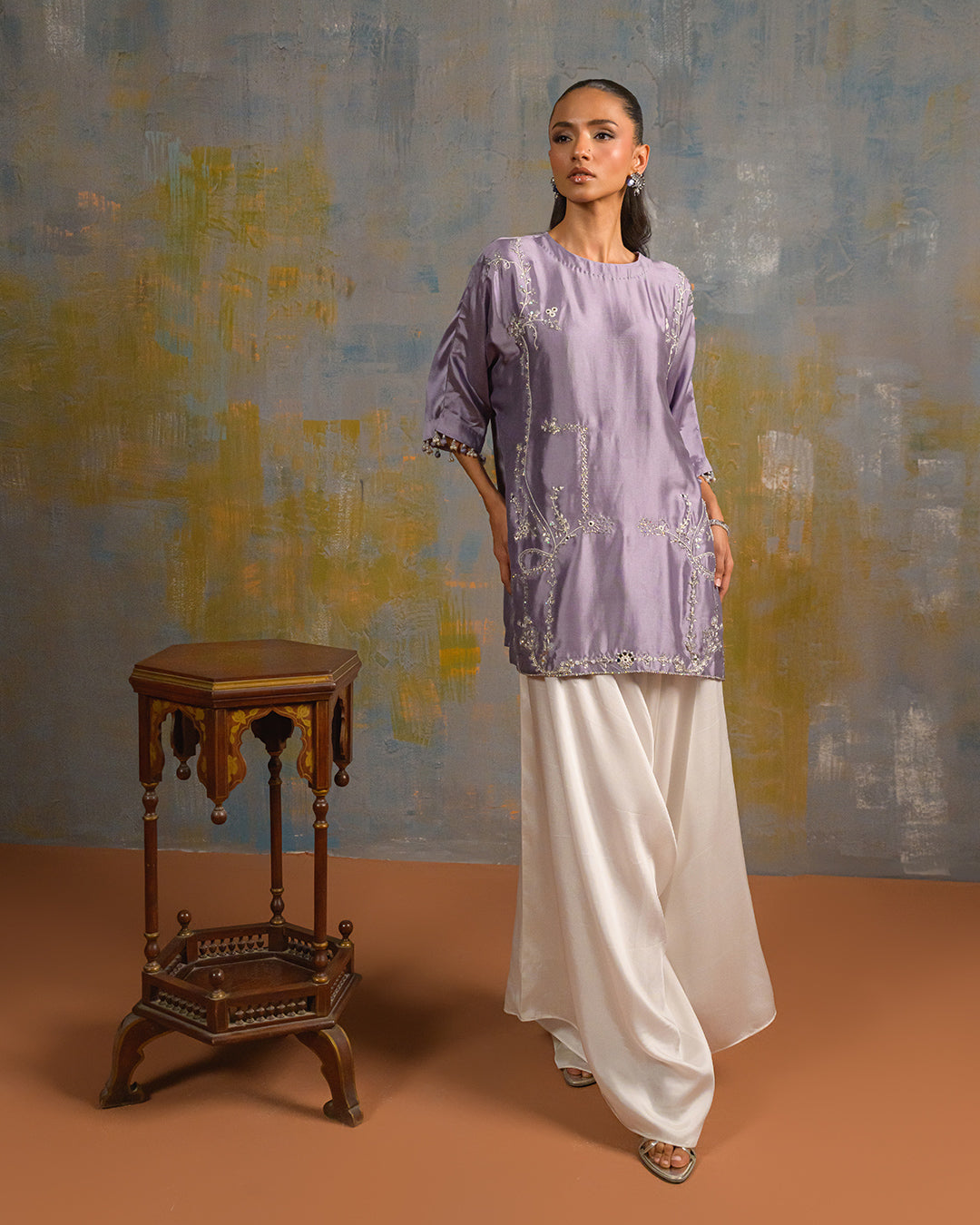This exquisite ensemble features a pure butter silk shirt and box pants, intricately embellished with delicate cora embroidery, sparkling sequins, and meticulous handwork. The sleeves are finished with short tassels, adding a touch of elegance and sophistication.
