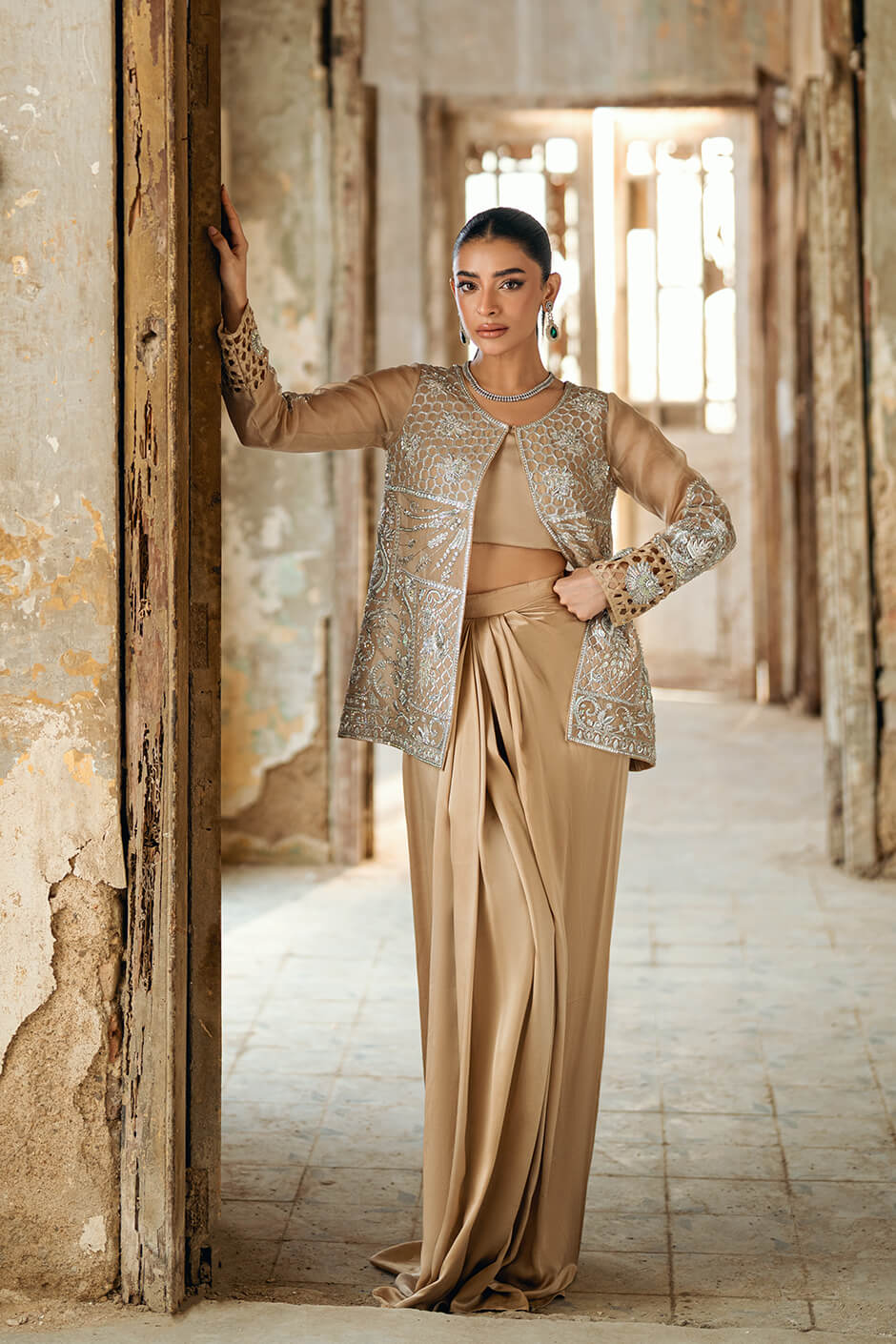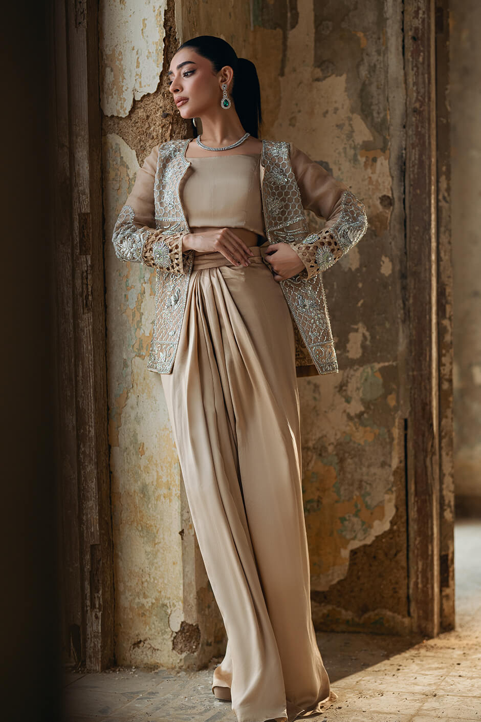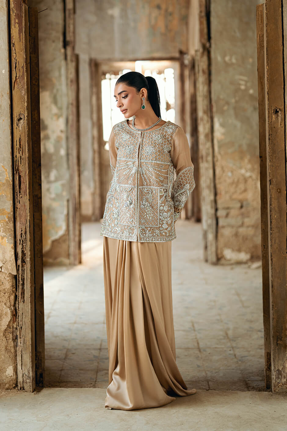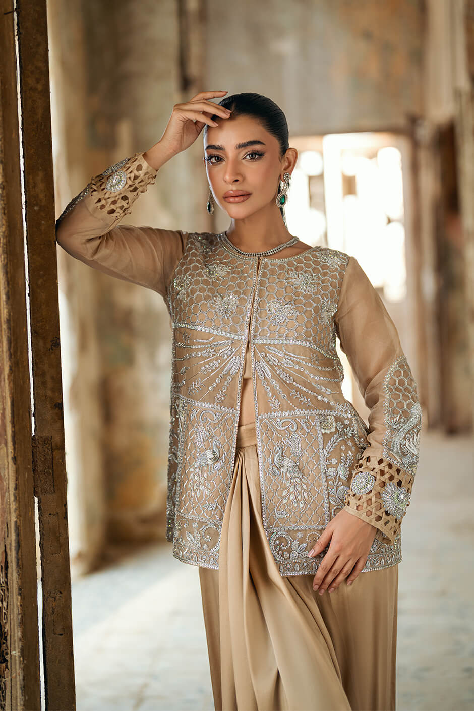 This captivating ensemble showcases a pure organza jacket, meticulously handembroidered with silver kora and dabka, enhanced by delicate sequins and shimmering Swarovski stones for a touch of opulence. Complementing the jacket is a graceful, pleated skirt crafted from pure shamooz fabric, radiating elegance and poise. Together, these pieces form a regal and sophisticated silhouette, ideal for unforgettable special occasions.