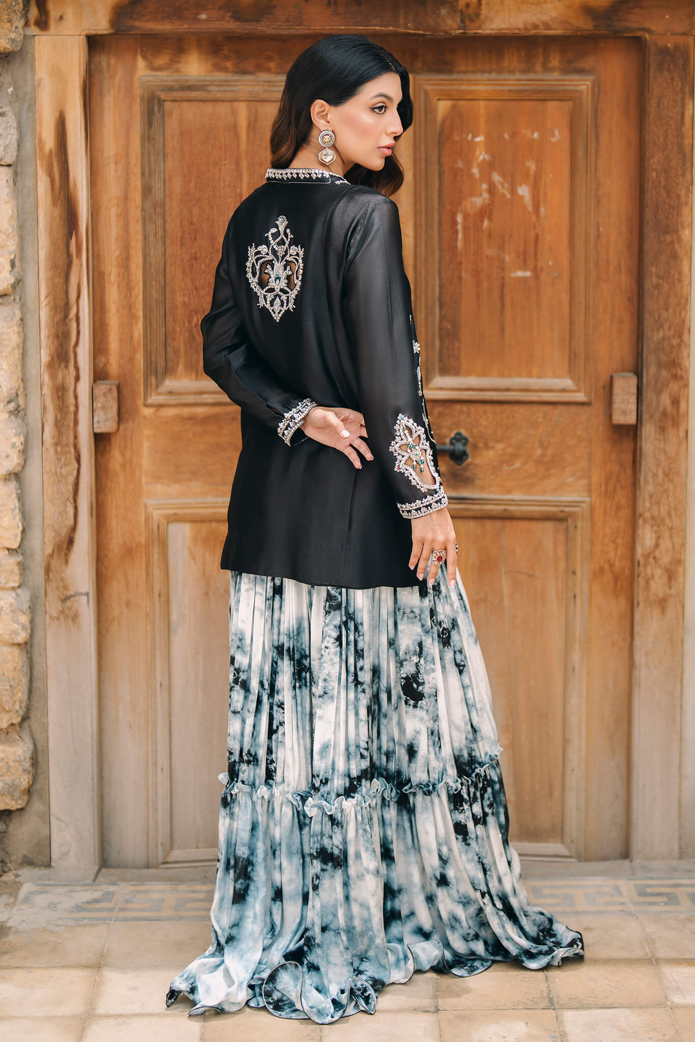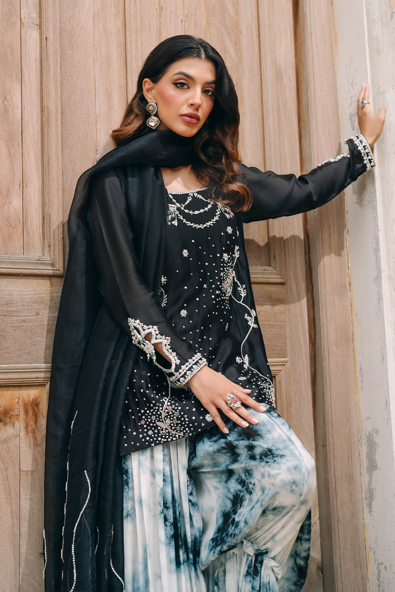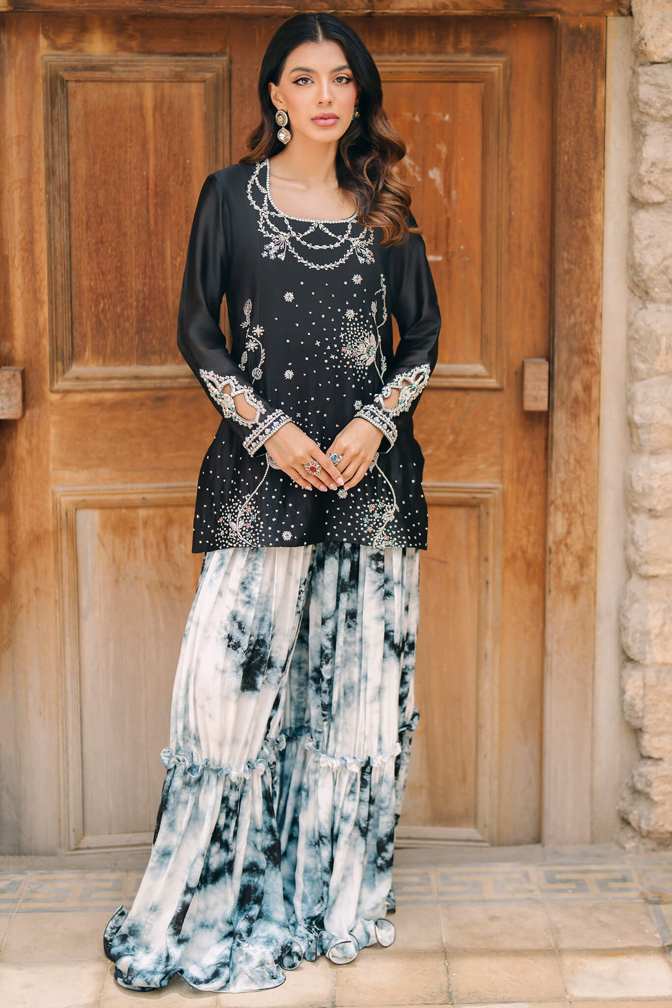 Elevate your style with this striking black outfit, paired with a modern tie-dye gharara that adds a vibrant edge. The shirt dazzles with intricate hand embellishments of kora dabka, zardozi, and a sequined spray, while the sleeves showcase exquisite cutwork details. Complementing the ensemble, a cascading dupatta with