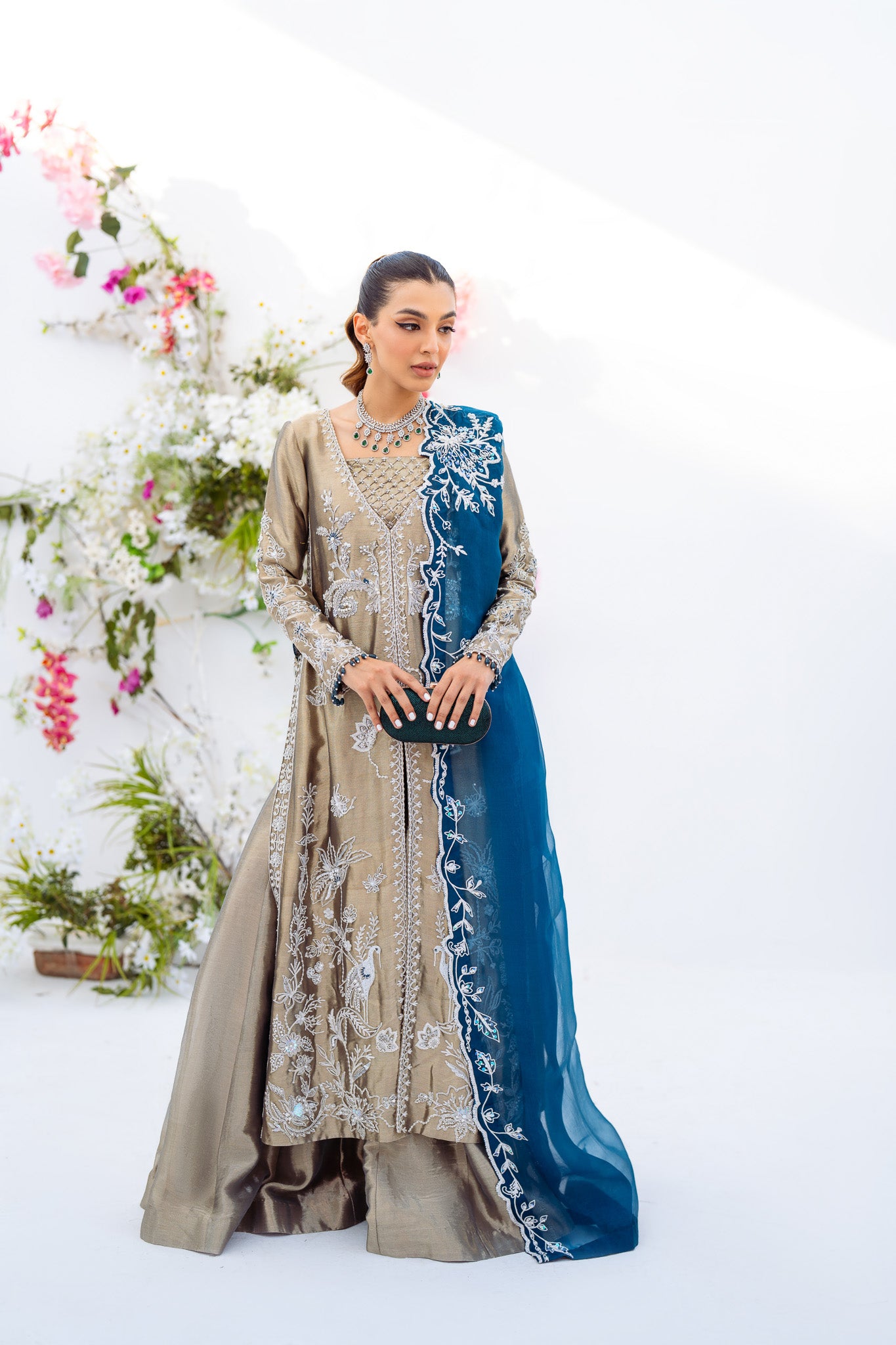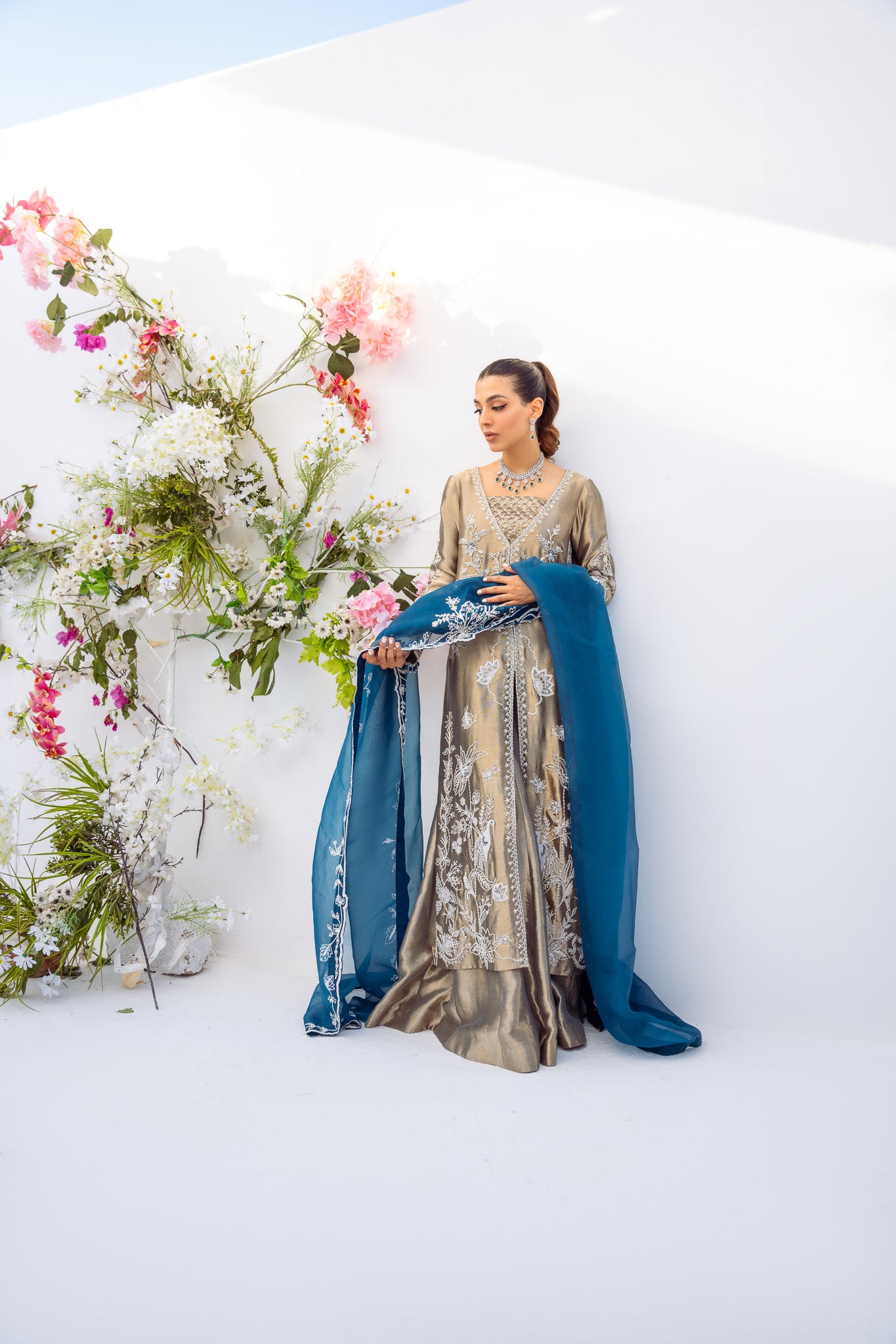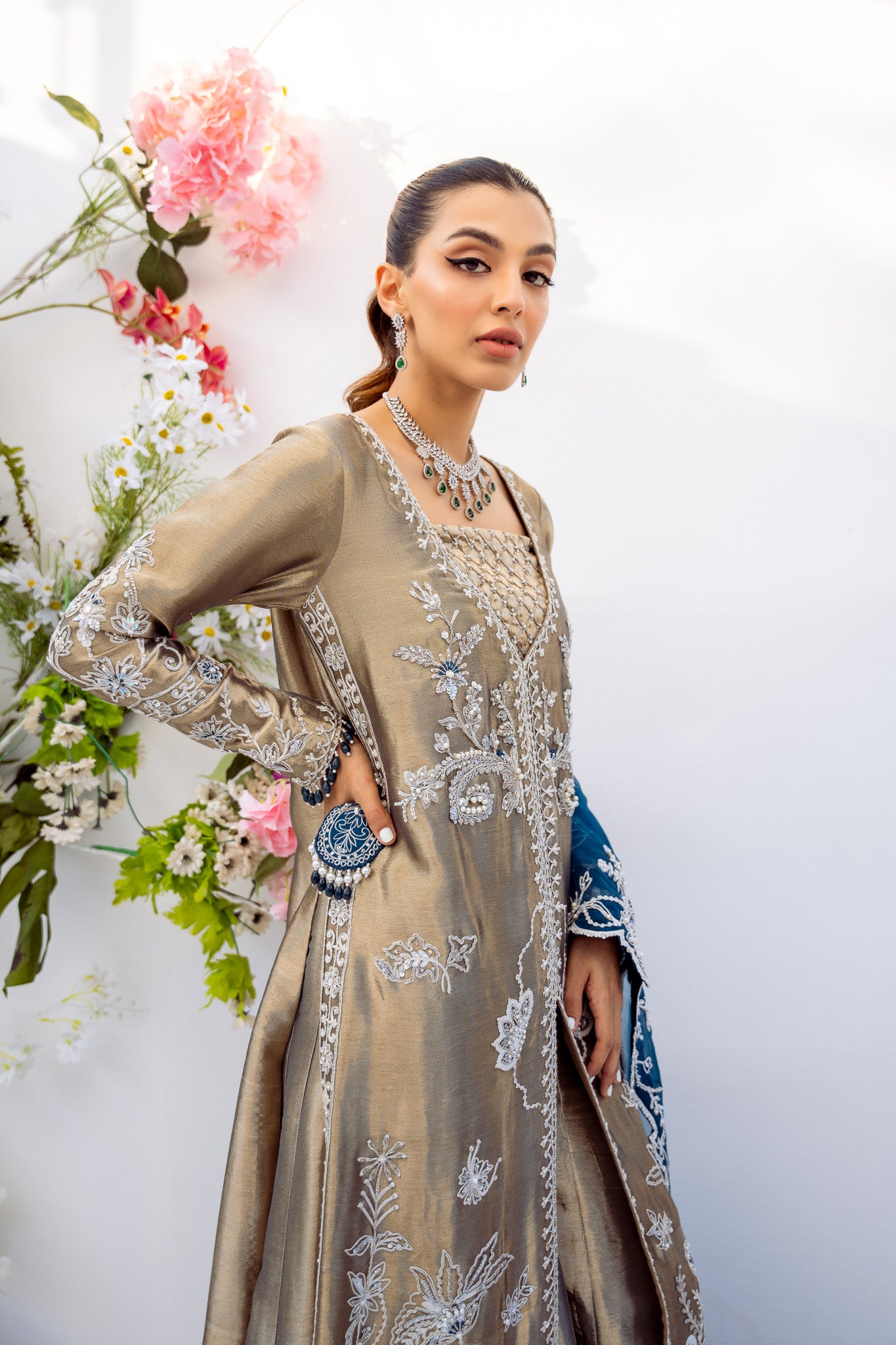 Introducing a captivating ensemble in a dramatic palette of gold and teal, sure to steal the spotlight this season. The exquisite jacket boasts an artistic pattern adorned with majestic birds meticulously crafted from zardozi, exuding opulence and sophistication. Paired harmoniously with tonal lama Dhaka pants, the ensemble achieves a seamless blend of elegance and comfort. Adding a striking contrast, the teal dupatta with beautiful borders completes the look with finesse, making this outfit an undeniable winner for any special occasion.