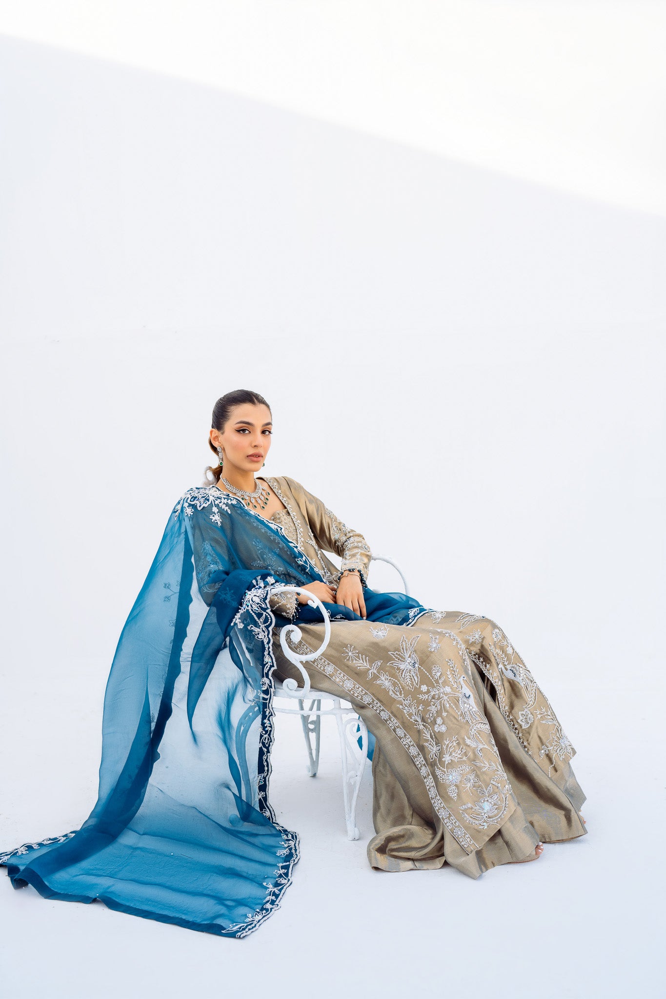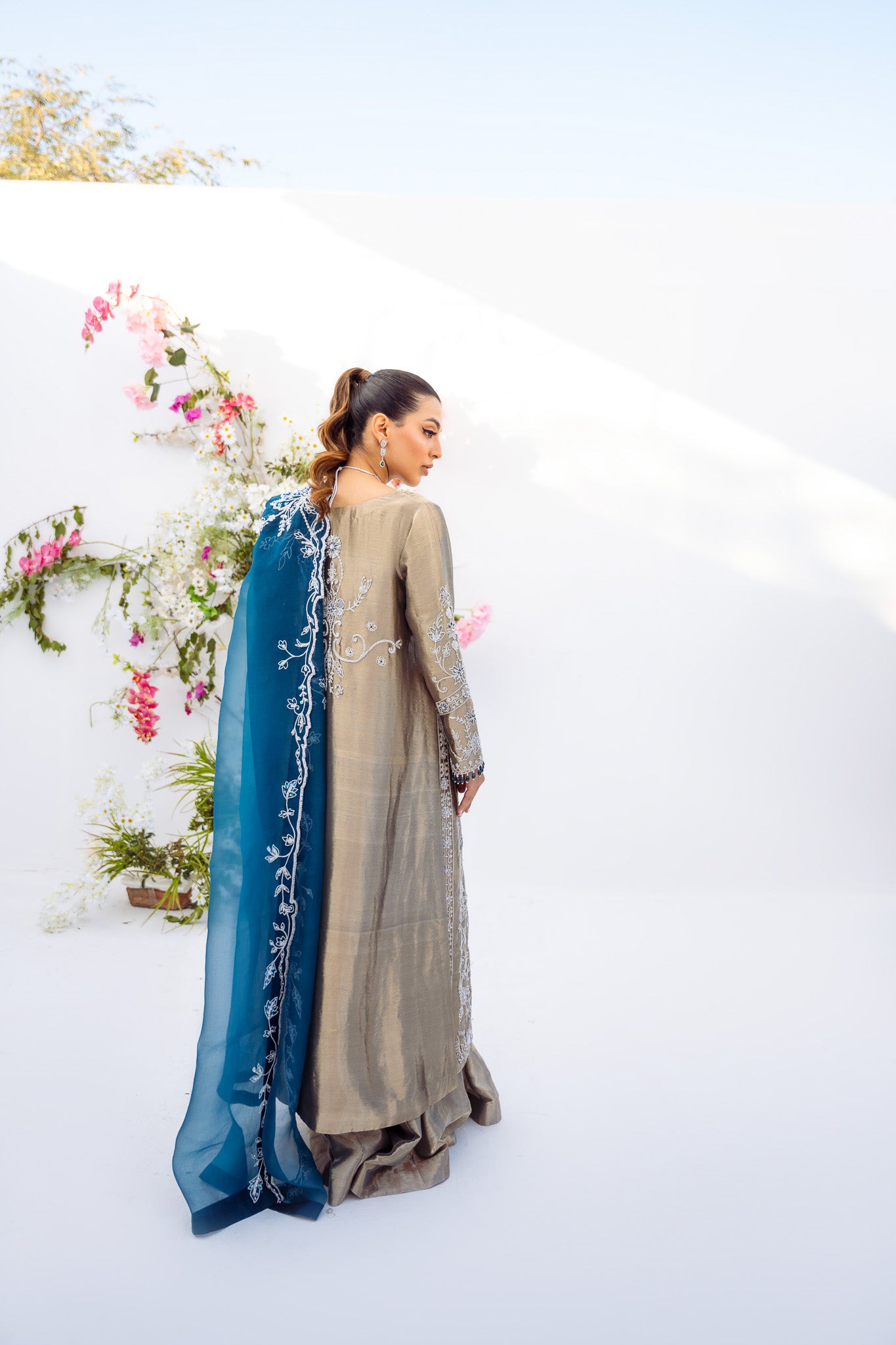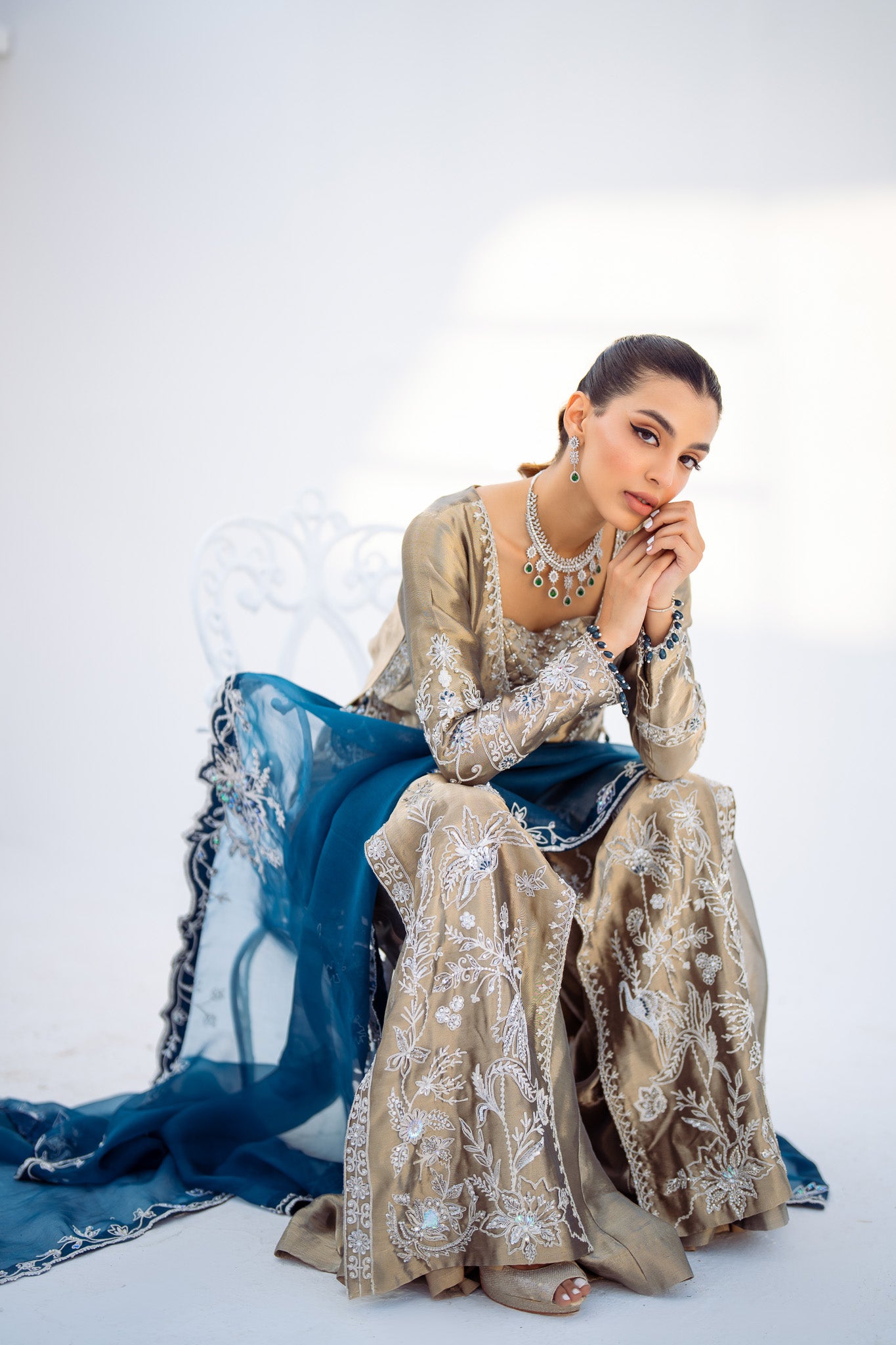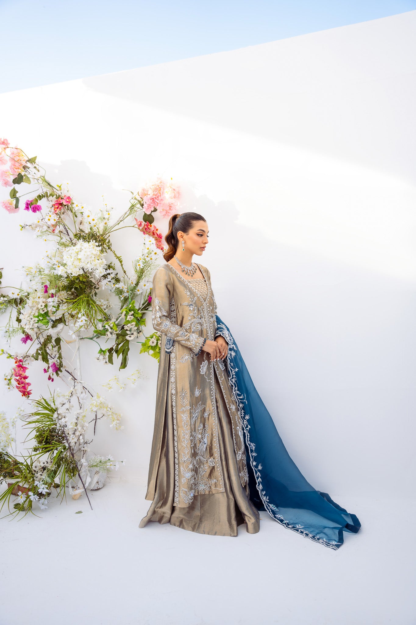 Introducing a captivating ensemble in a dramatic palette of gold and teal, sure to steal the spotlight this season. The exquisite jacket boasts an artistic pattern adorned with majestic birds meticulously crafted from zardozi, exuding opulence and sophistication. Paired harmoniously with tonal lama Dhaka pants, the ensemble achieves a seamless blend of elegance and comfort. Adding a striking contrast, the teal dupatta with beautiful borders completes the look with finesse, making this outfit an undeniable winner for any special occasion.