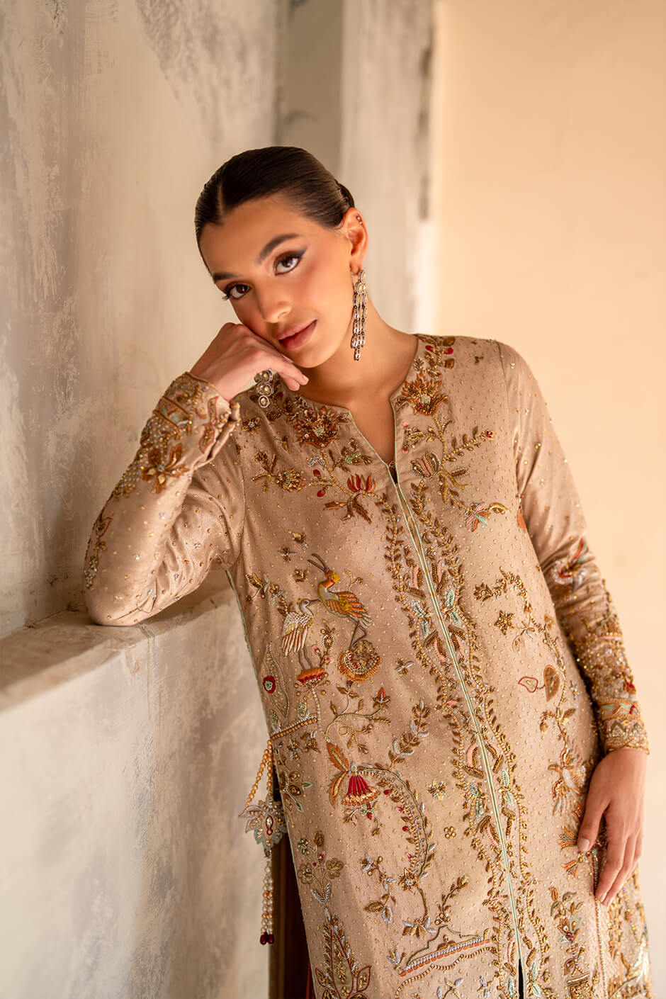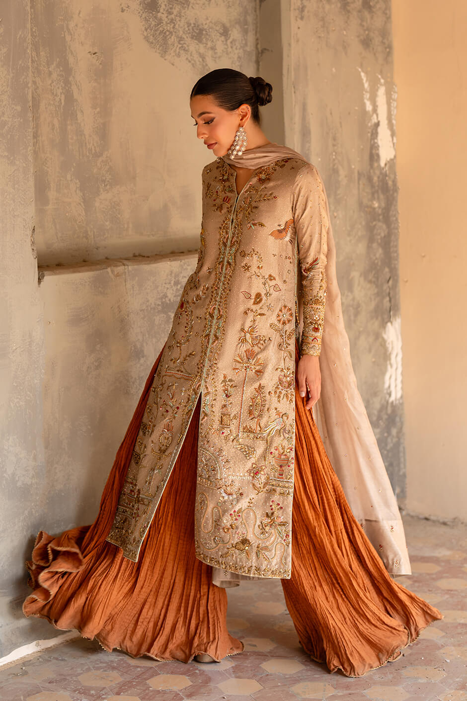 An exquisite pure lama stripes shirt is paired with luxurious pure cotton silk crush pants, complemented by a regal pure Zari net dupatta. This ensemble features intricate craftsmanship with Cora Dabka, Chaan Booti, and Kaamdani work, showcasing majestic elegance and opulent charm.