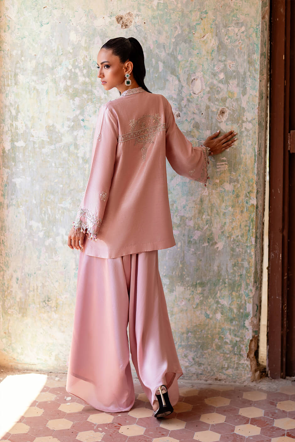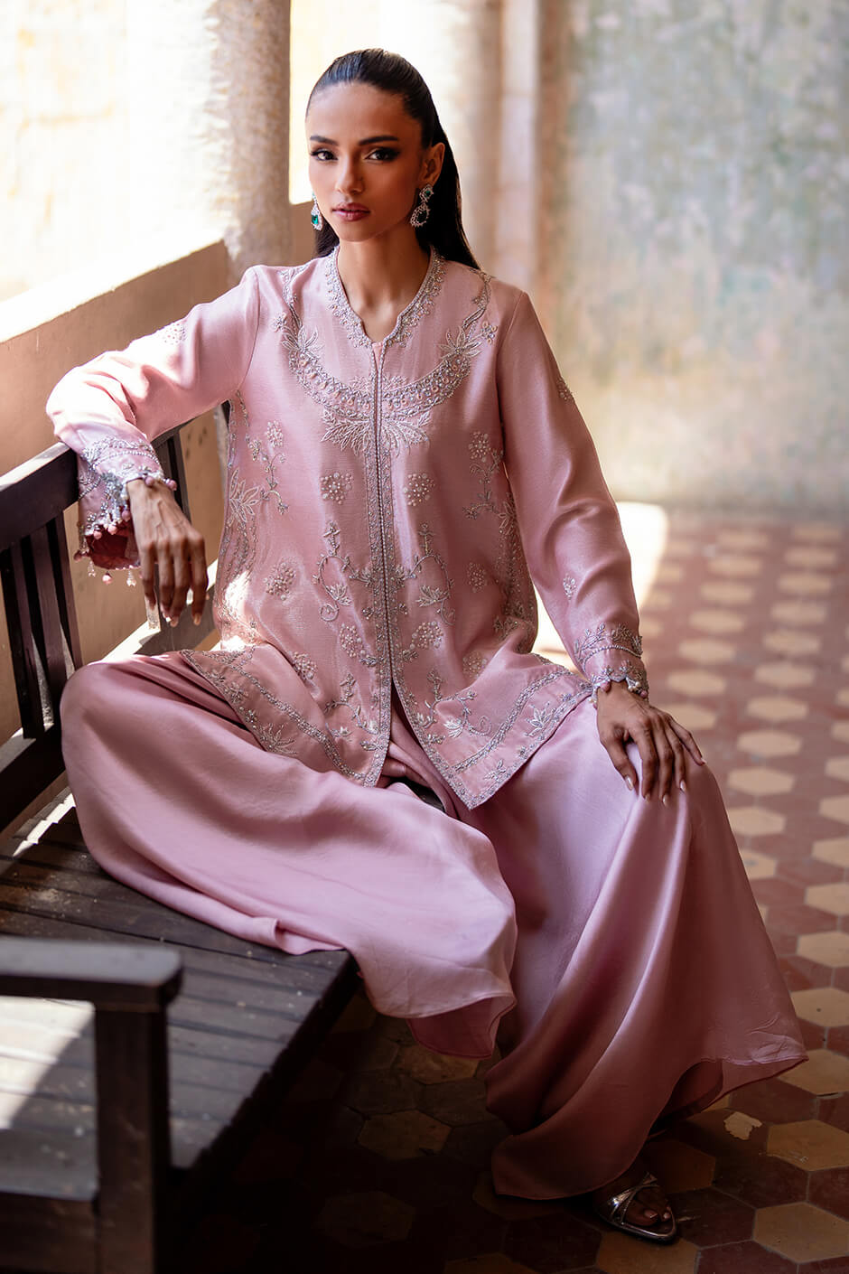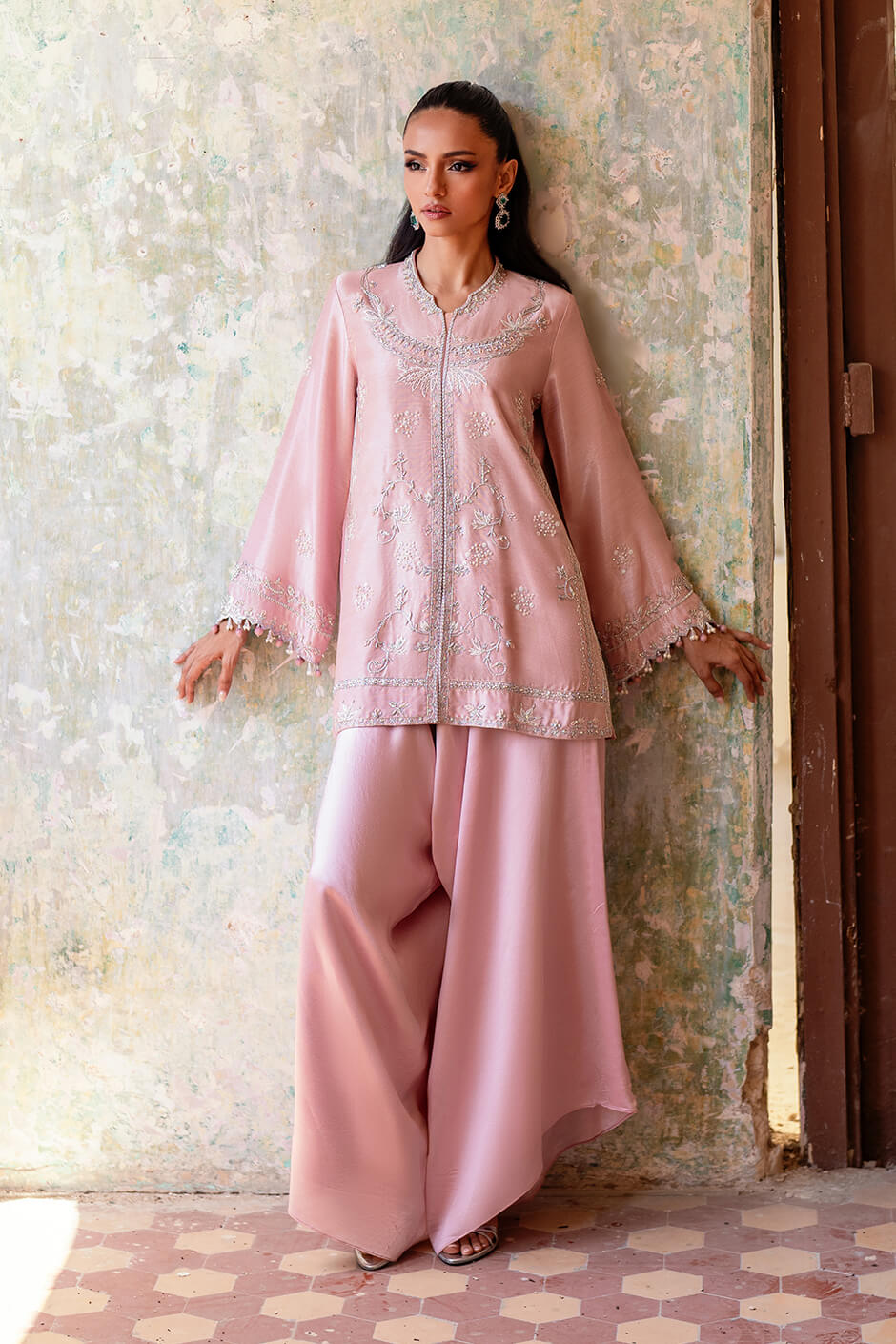 An elegantly crafted pure lama stripes shirt adorned with intricate Cora Dabka work and delicate Organza leaf motifs is paired with luxurious pure butter silk box pants.