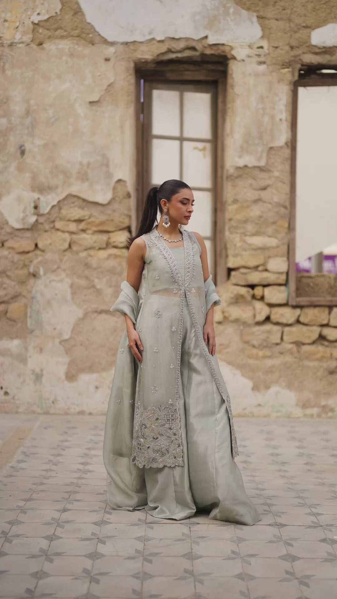 An ethereal ensemble featuring a pure organza front-open jacket, delicately detailed with cut work, handwork, and fine hand embellishment. Paired with a structured Dhaka pajama in pure Stripes Lama and a flowing 3-yard pure organza dupatta, this look effortlessly fuses lightness with luxury — perfect for modernday elegance with a traditional soul.