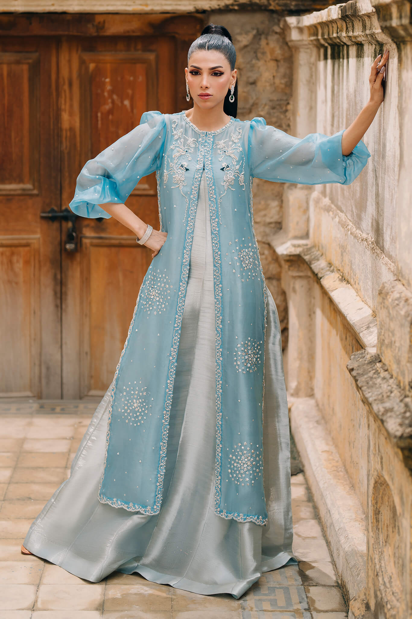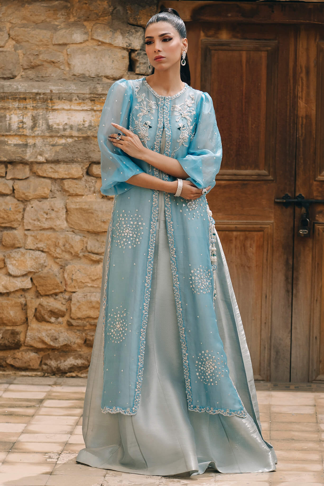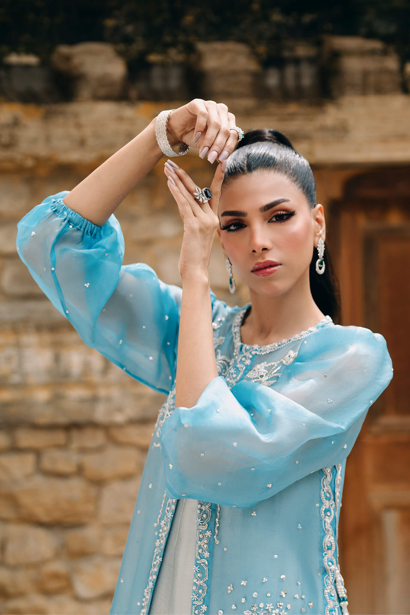 Exude elegance in our ice blue ensemble, featuring a front-open shirt crafted from pure