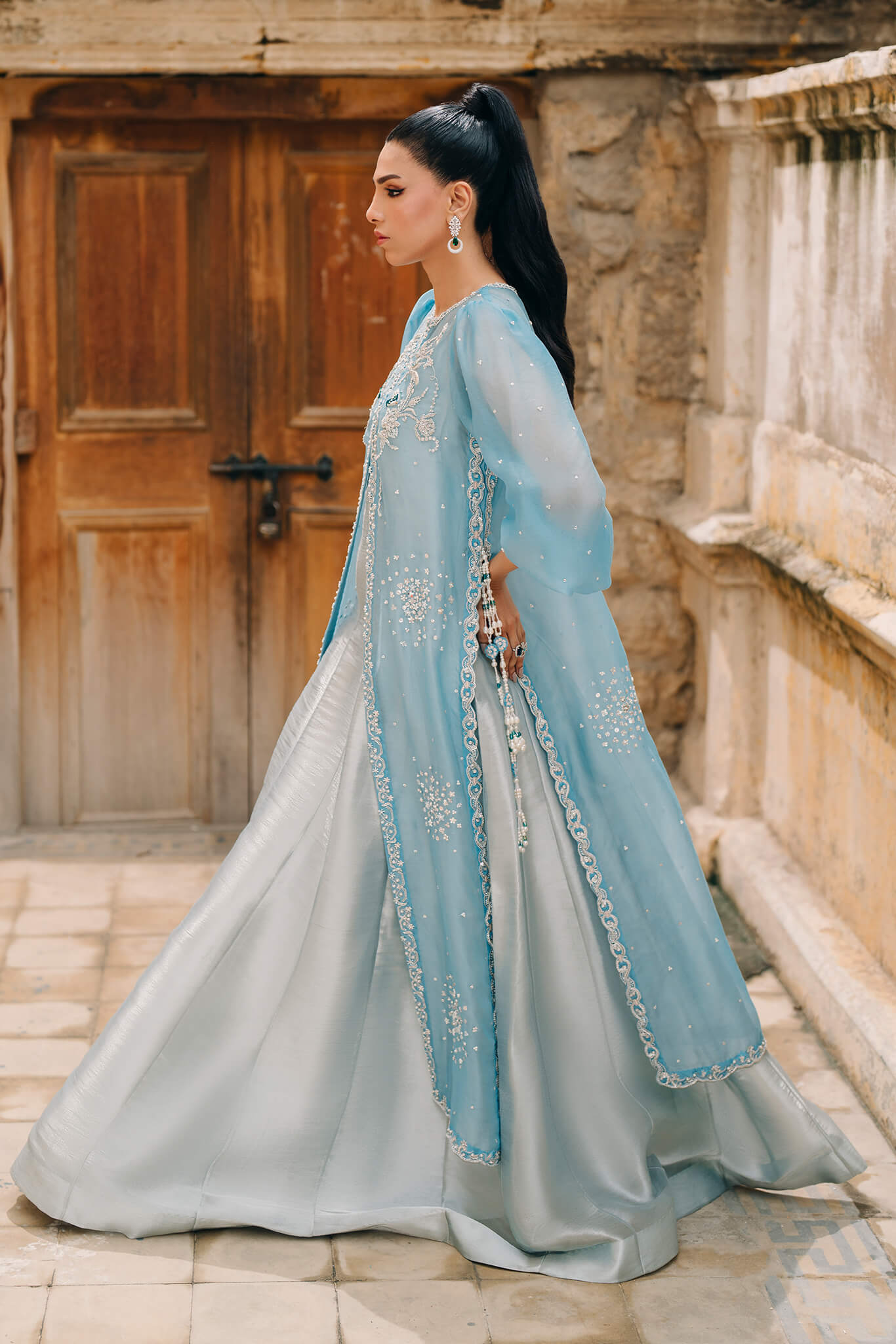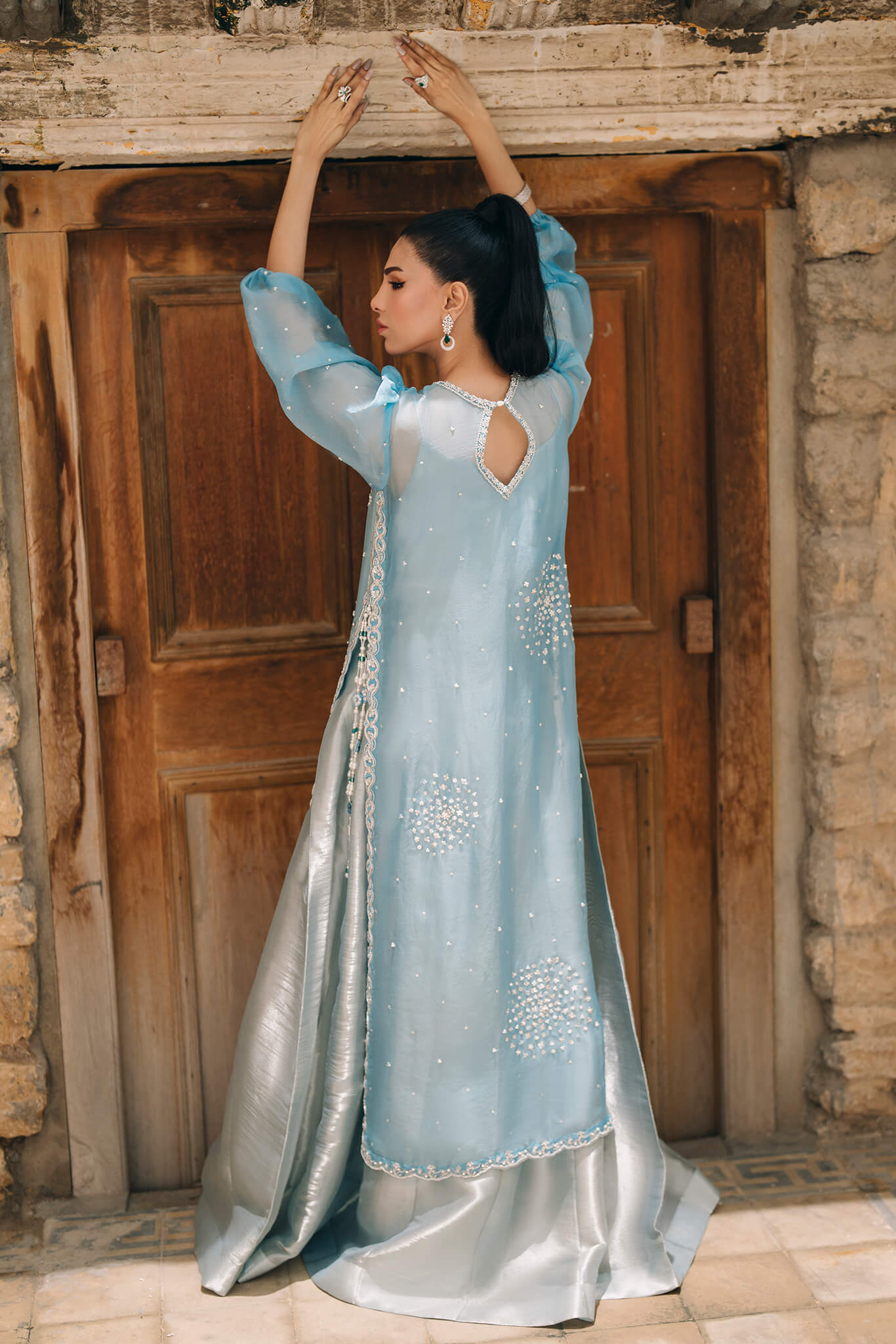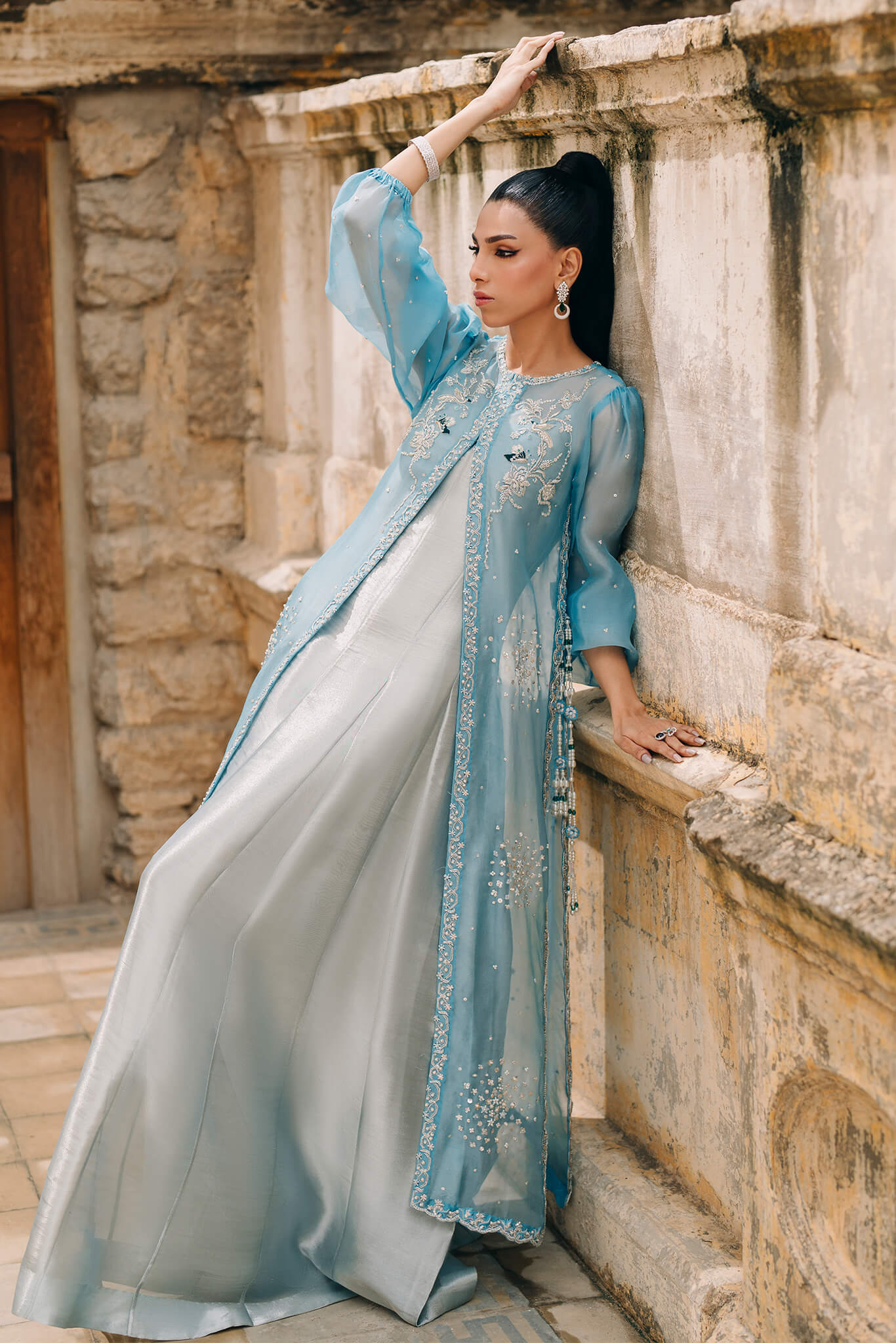 Exude elegance in our ice blue ensemble, featuring a front-open shirt crafted from pure