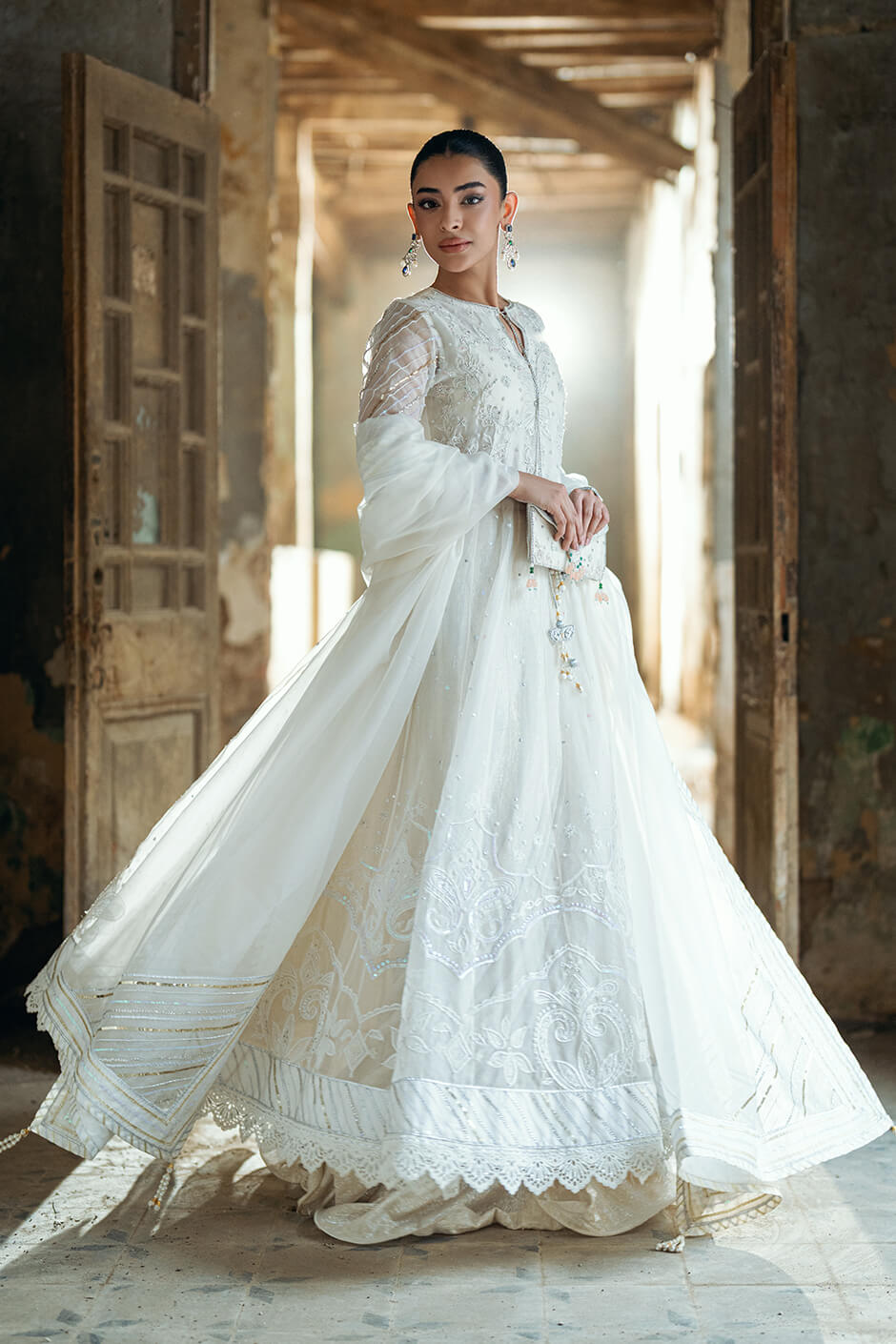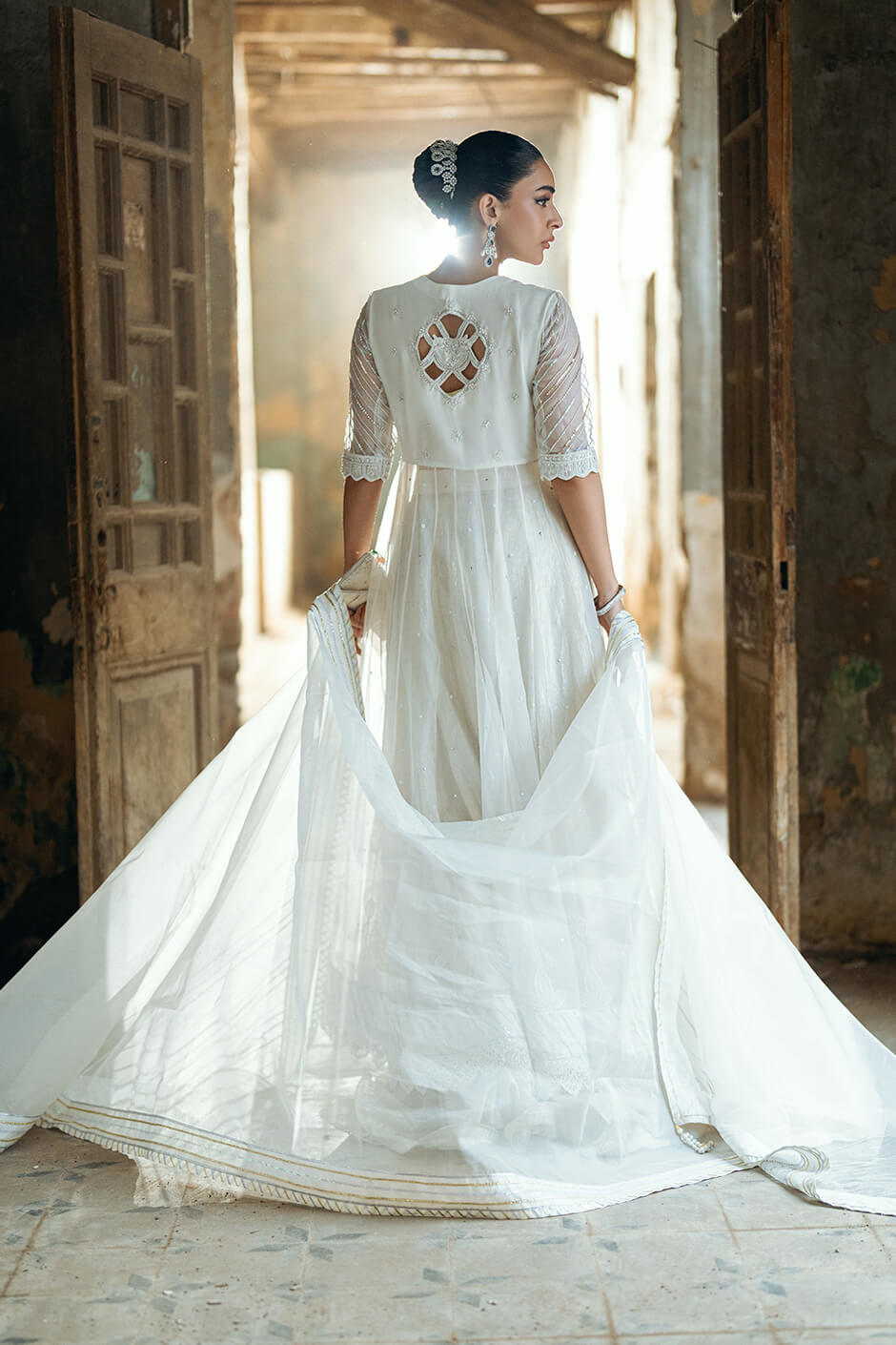 This exquisite ensemble blends artistry with sophistication. The pure organza frock features delicate hand embellishments, cut dana, pearls, and sequins, creating a radiant display of luxury. Paired with a shimmering sharara, its lustrous fabric adds a modern twist to tradition. A 3-yard pure organza dupatta completes the look with graceful refinement— perfect for making a bold statement at any grand occasion.