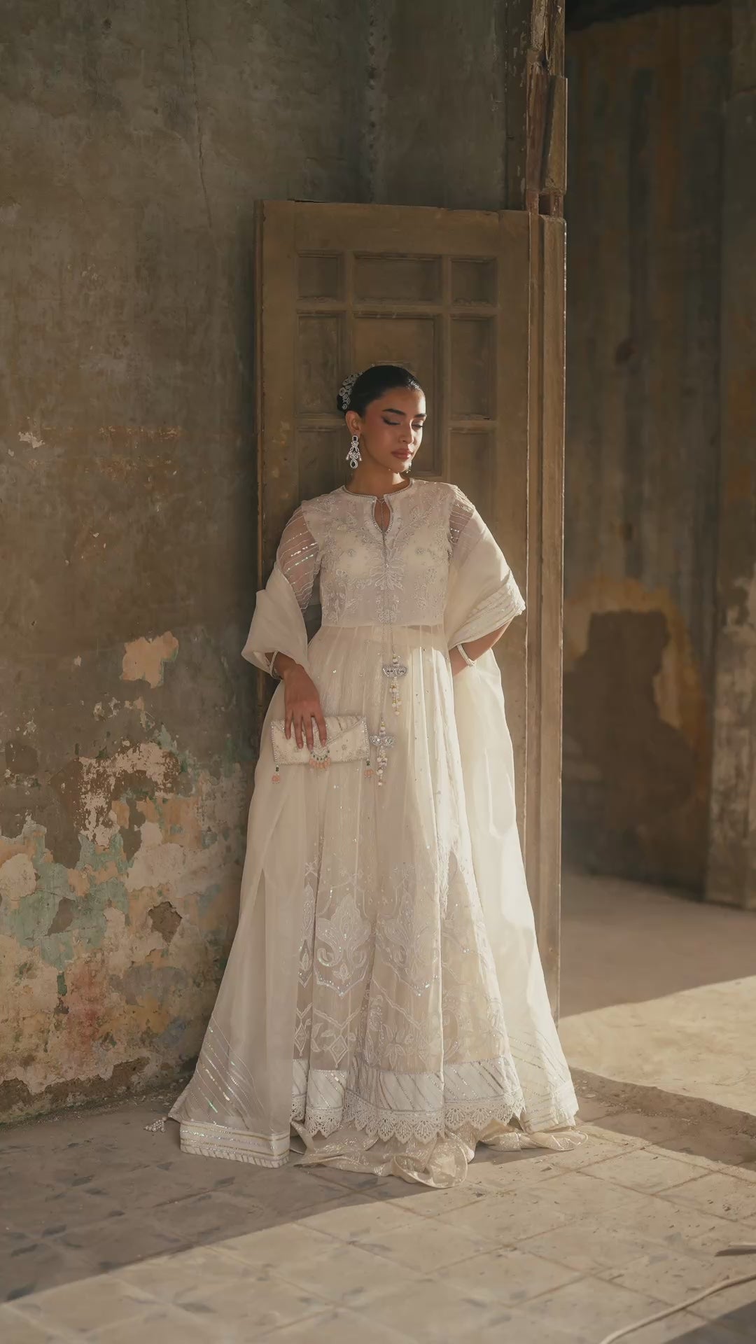 This exquisite ensemble blends artistry with sophistication. The pure organza frock features delicate hand embellishments, cut dana, pearls, and sequins, creating a radiant display of luxury. Paired with a shimmering sharara, its lustrous fabric adds a modern twist to tradition. A 3-yard pure organza dupatta completes the look with graceful refinement— perfect for making a bold statement at any grand occasion.