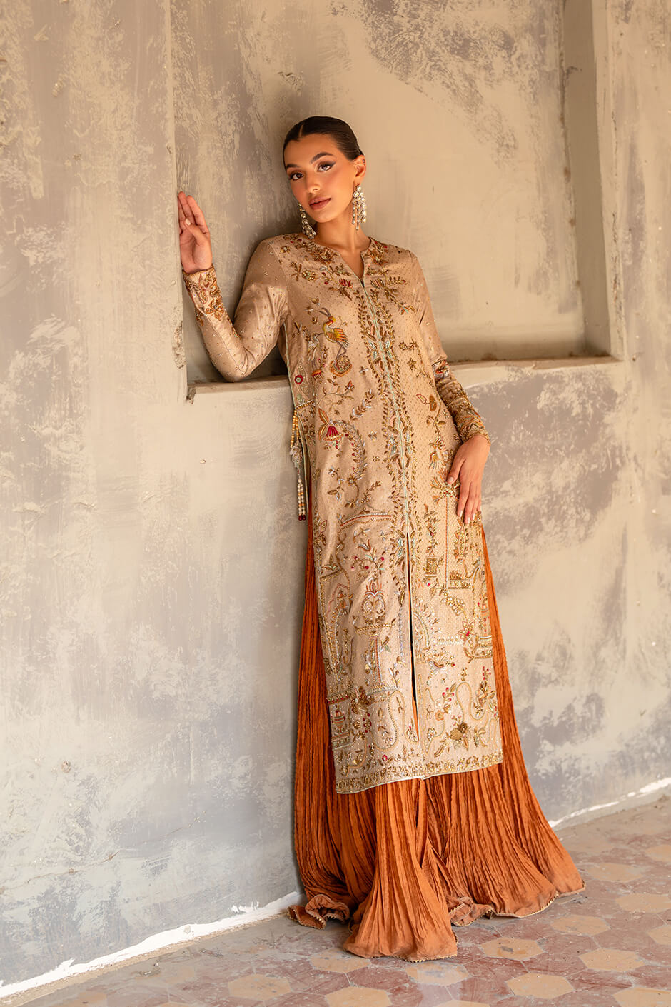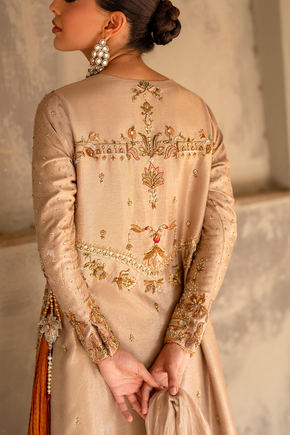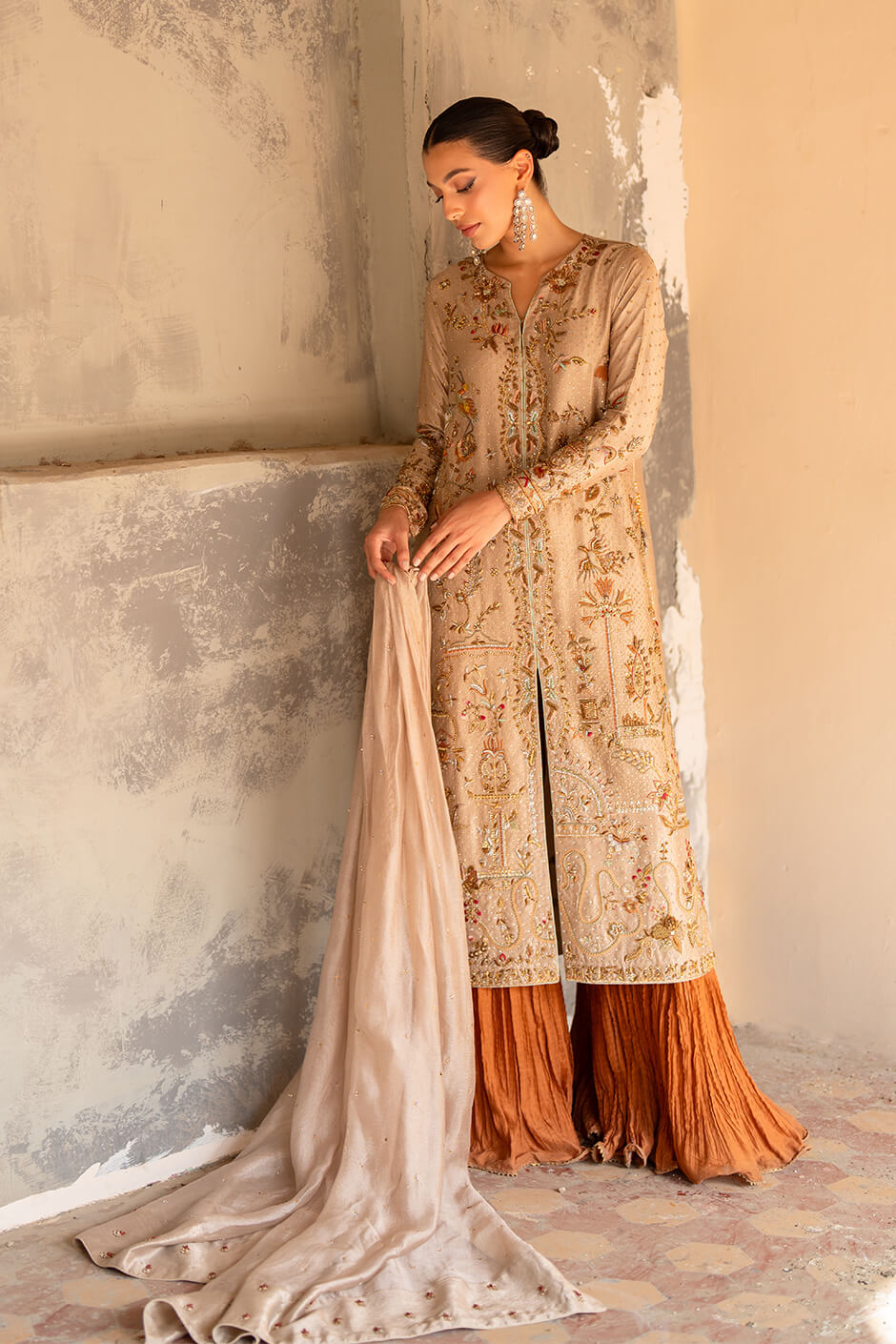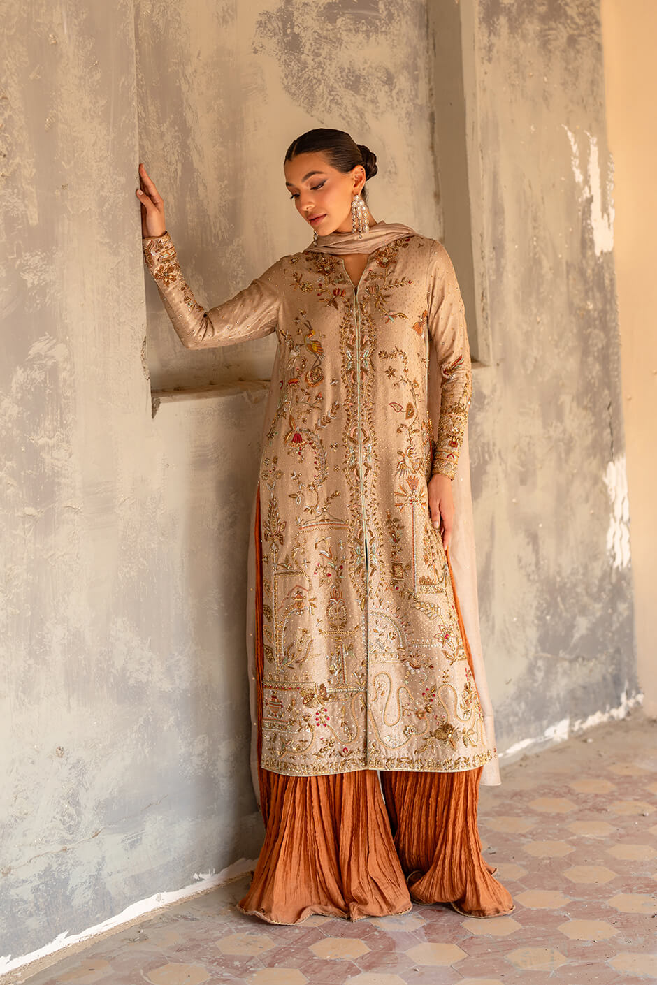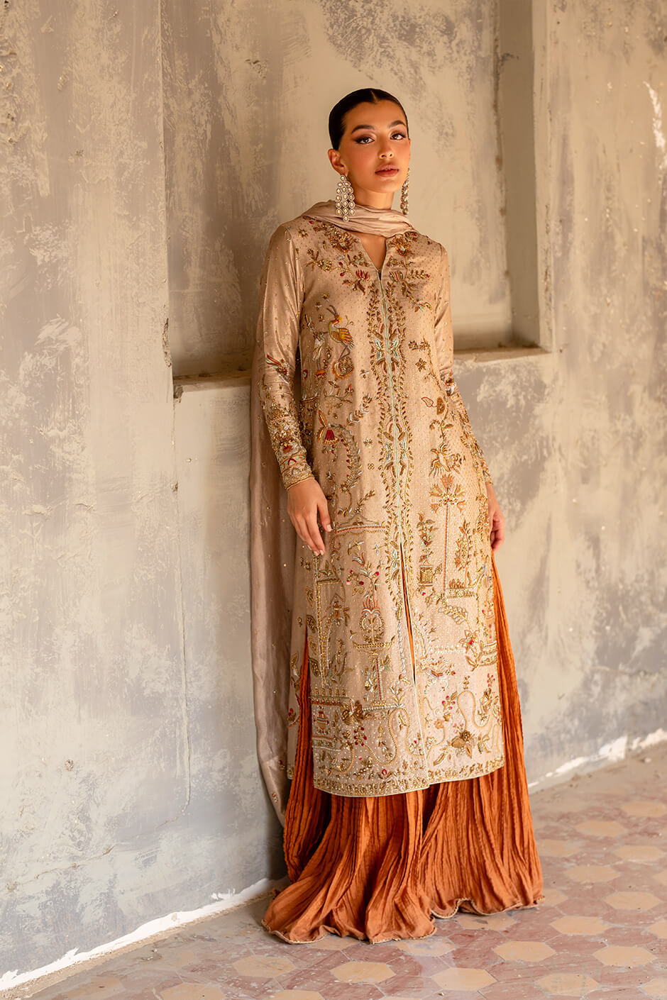 An exquisite pure lama stripes shirt is paired with luxurious pure cotton silk crush pants, complemented by a regal pure Zari net dupatta. This ensemble features intricate craftsmanship with Cora Dabka, Chaan Booti, and Kaamdani work, showcasing majestic elegance and opulent charm.