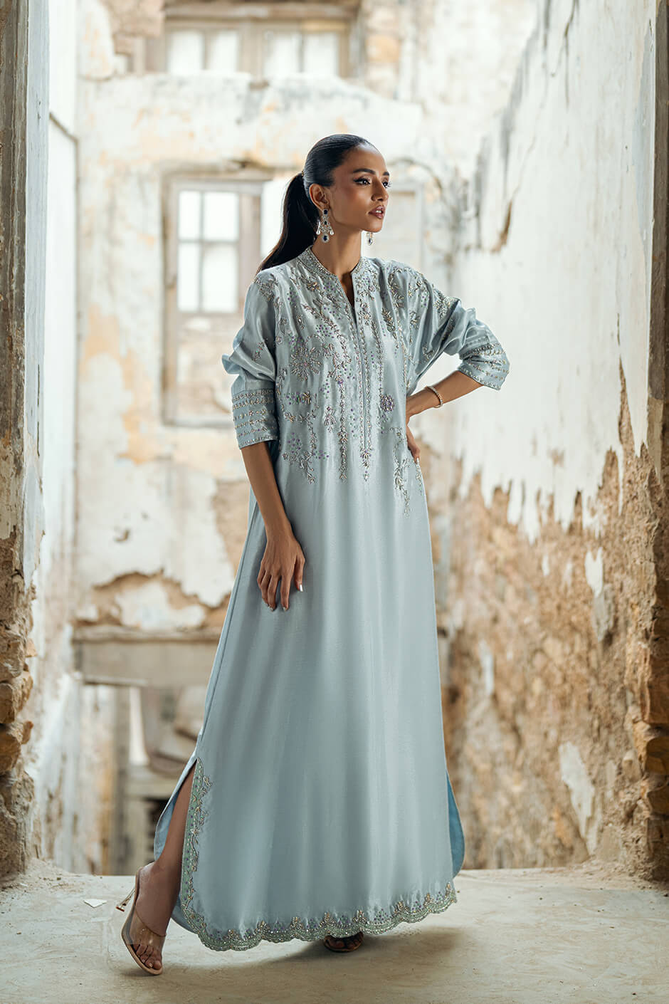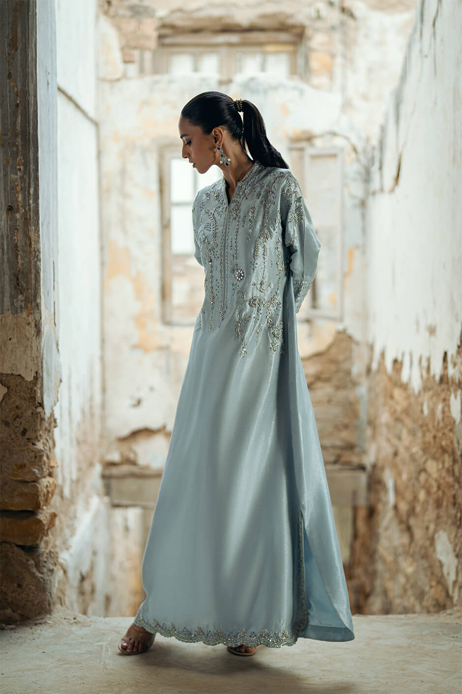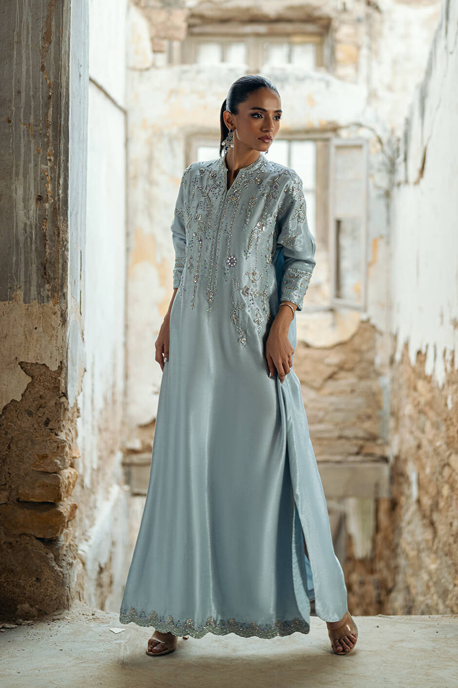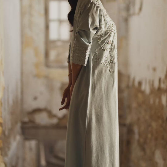 This beautiful kaftan is crafted from pure striped lawn fabric, featuring intricate kora dabka and resham work that adds a touch of sophistication. The appliqué work enhances the overall design, while the kimono cut provides a stylish and flowing silhouette.