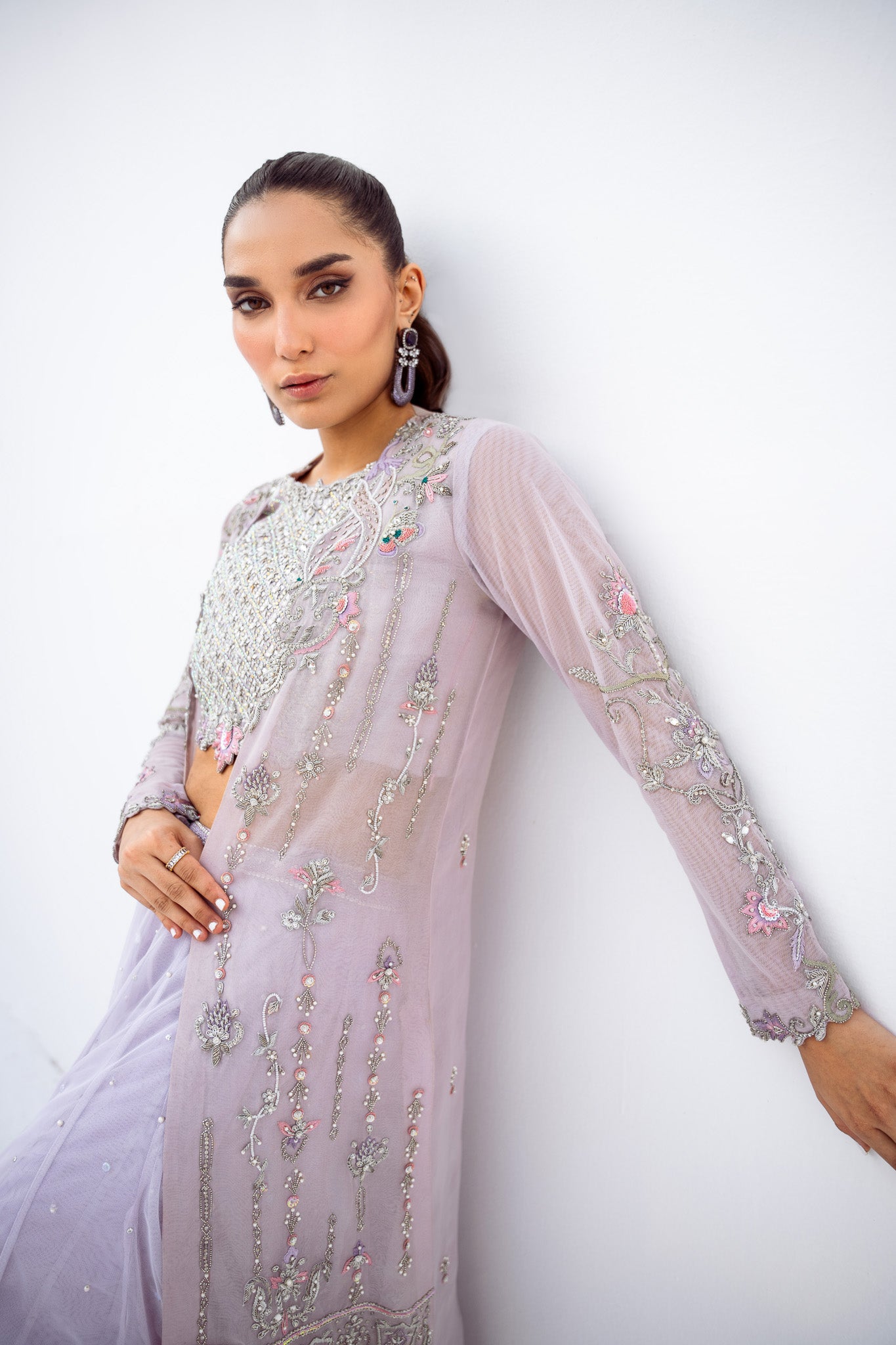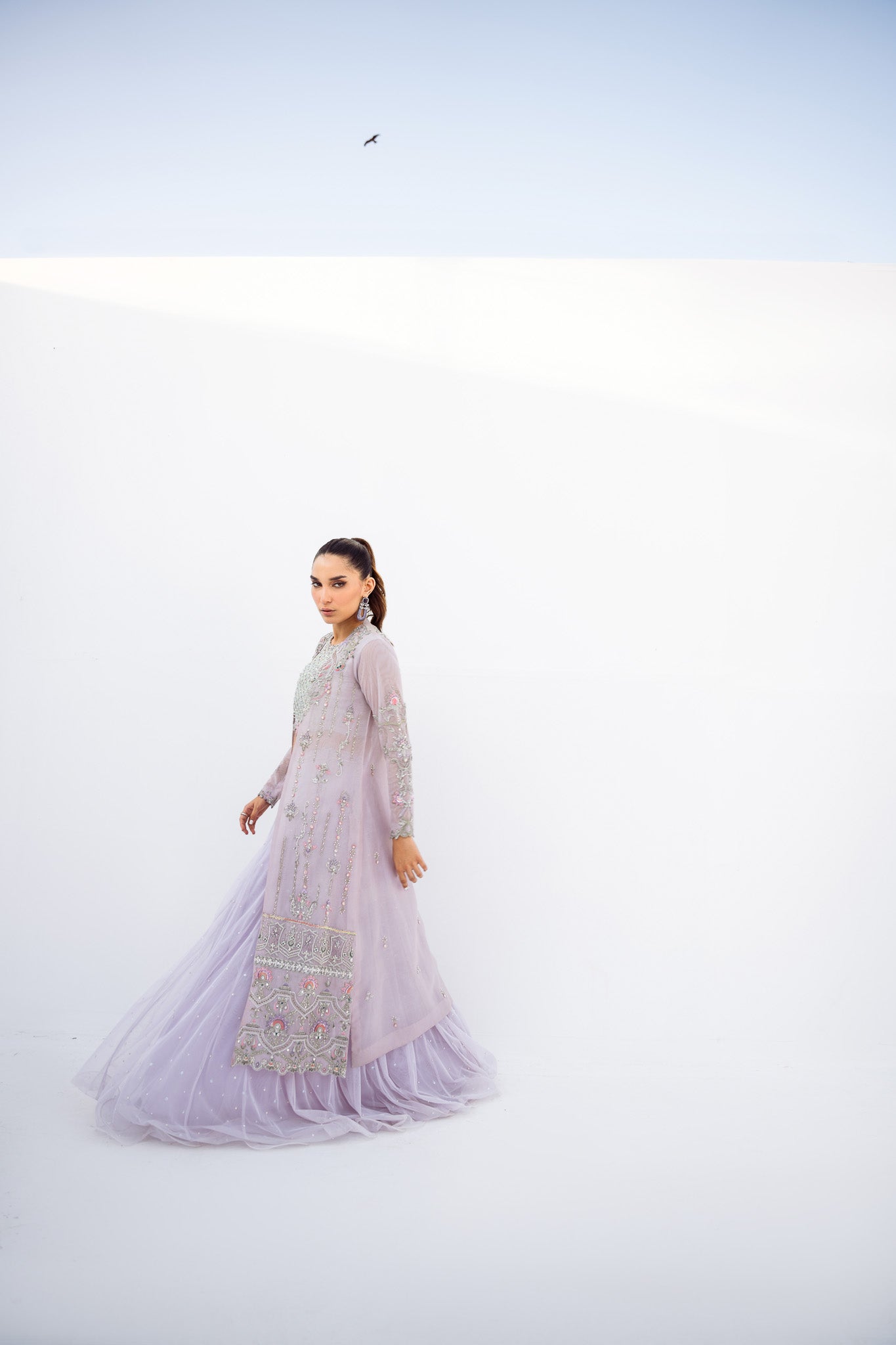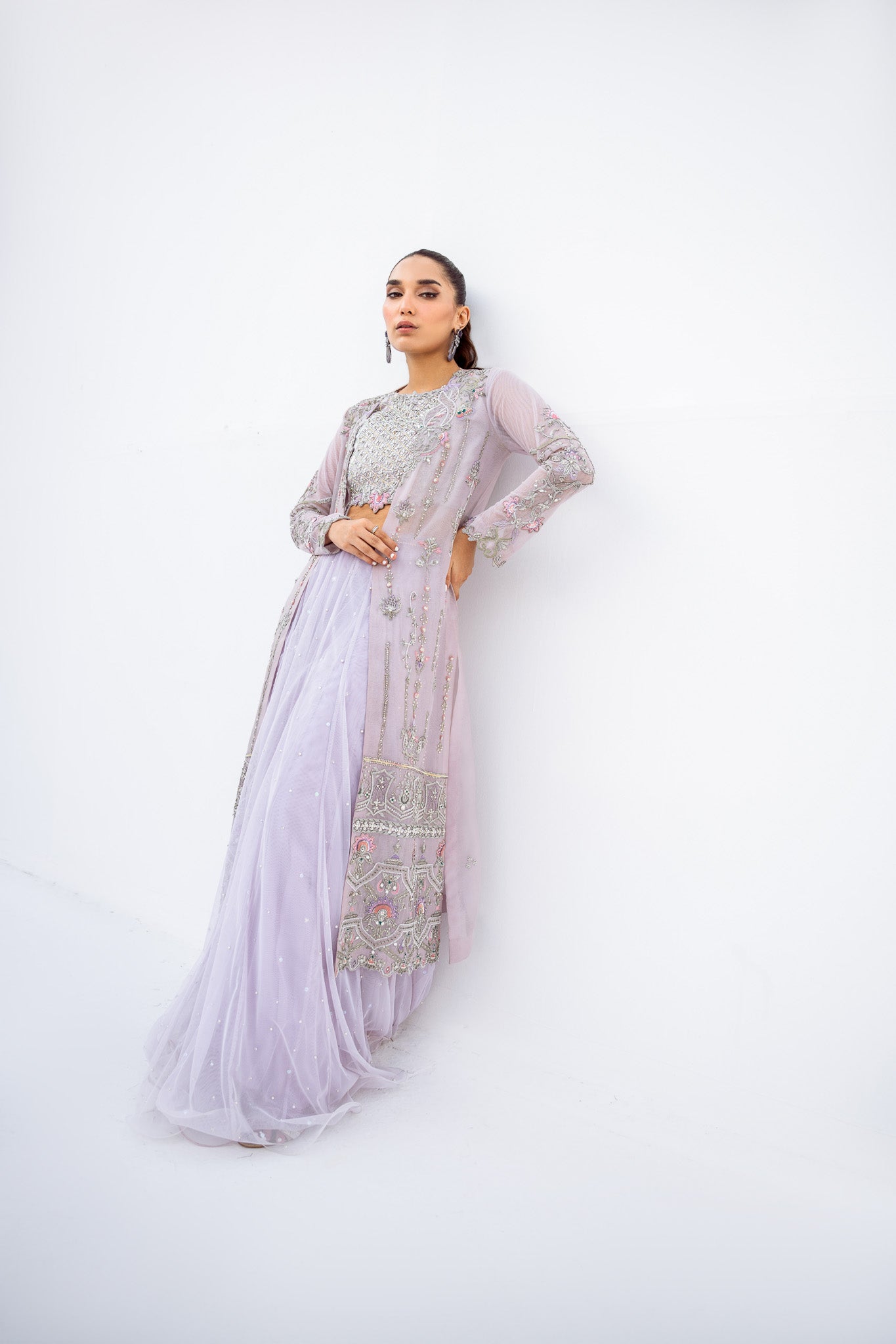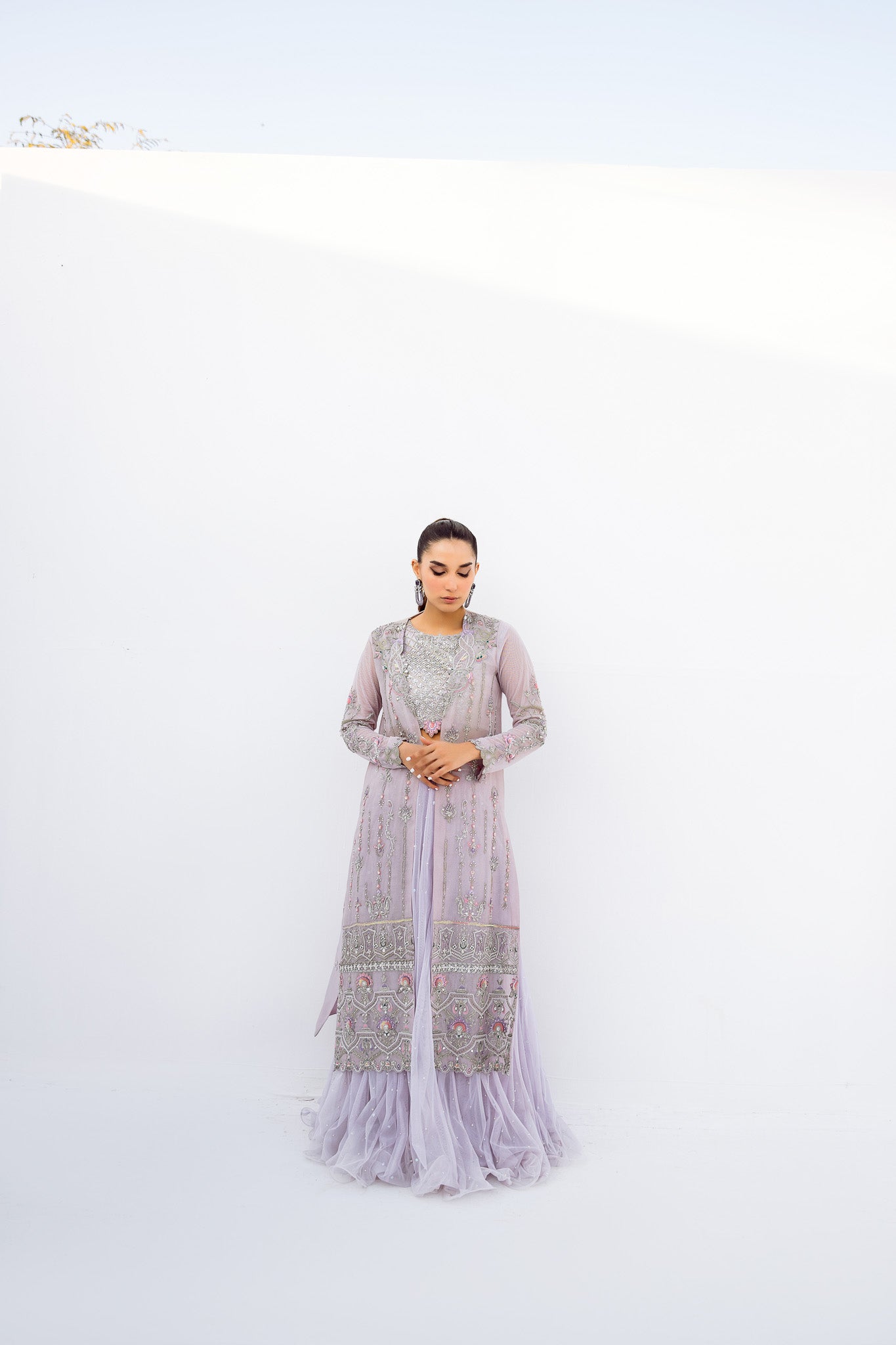 Step into enchantment with our stunning long jacket in a serene lavender hue. Crafted from pure kattan, it is beautifully embellished with intricate patterns and hexagonal borders. The double-layered net sharara adds depth and dimension, creating a mesmerizing silhouette. This Uber chic ensemble, with its charismatic color and delicate details, is the perfect choice for Valima or engagement affairs.