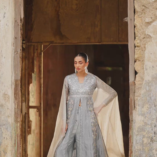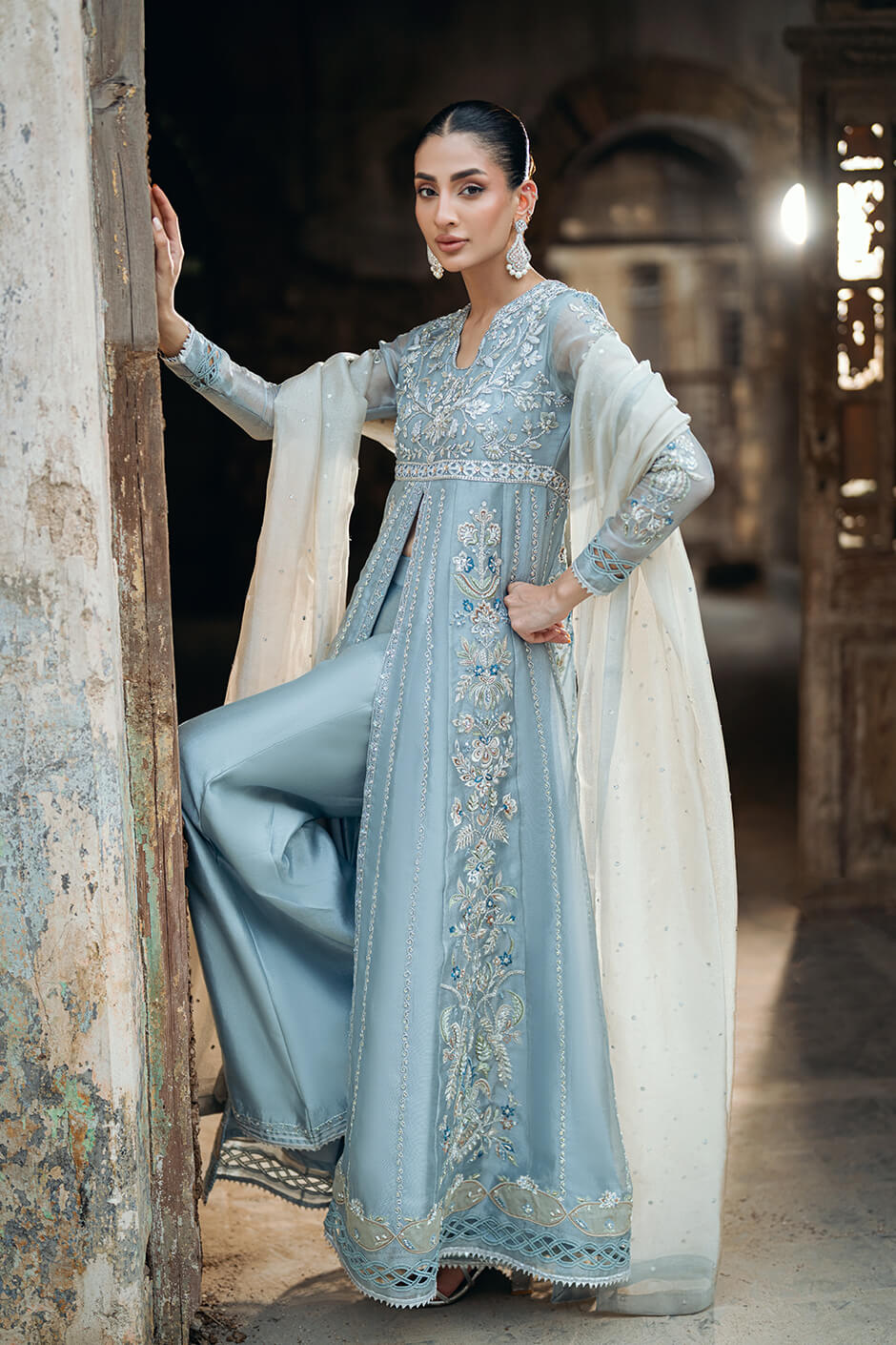 This stunning ensemble features a frock crafted from organza net, intricately adorned with resham and cora dabka work, with exquisite detailing. Paired with this beautiful frock are 2-legged Dhaka pants in striped lawn fabric.The dupatta is made from pure organza net, measuring 3 yards in length, adding a touch of elegance to the overall look.