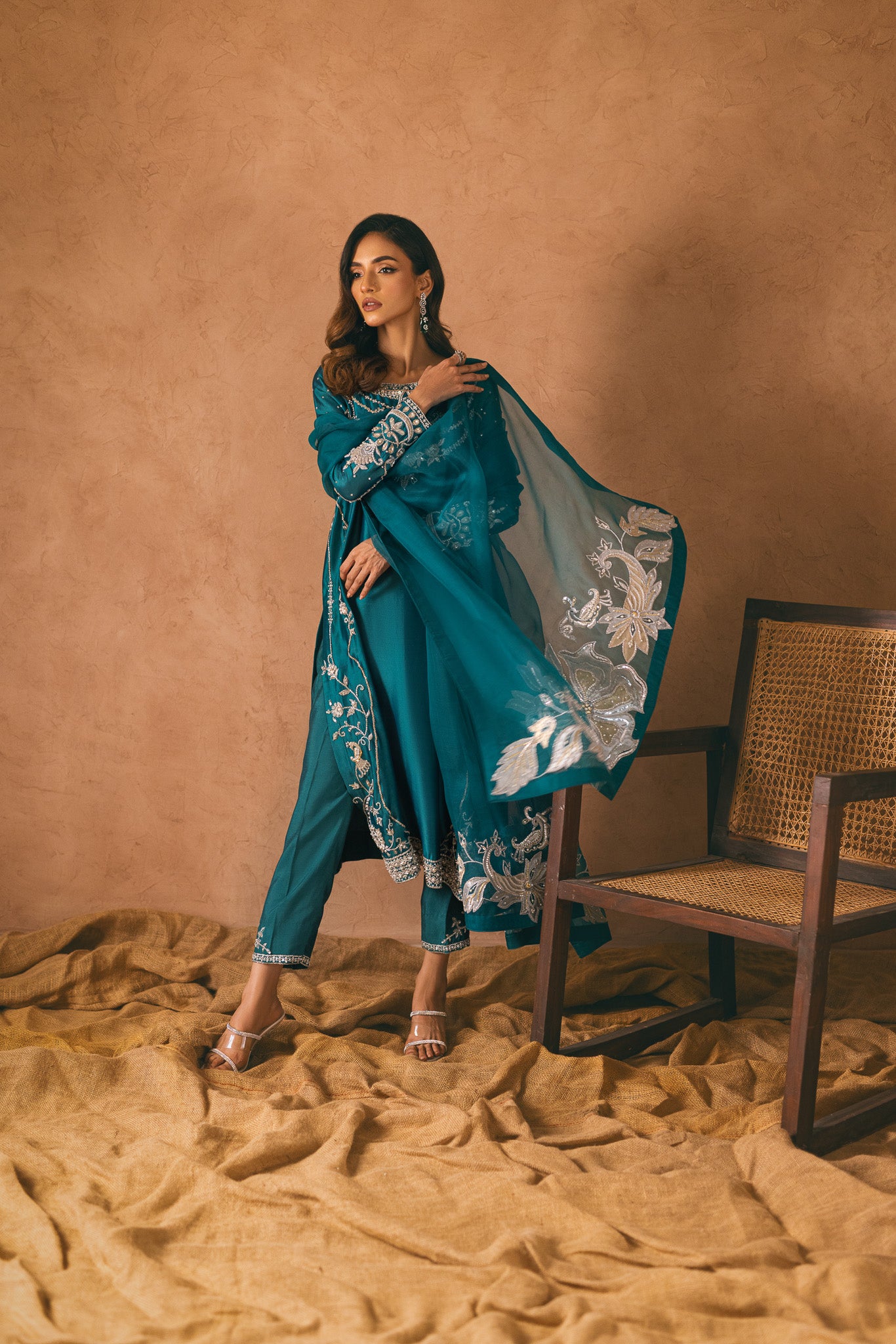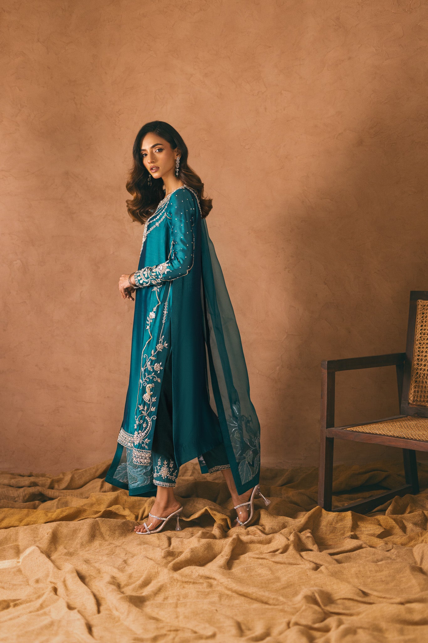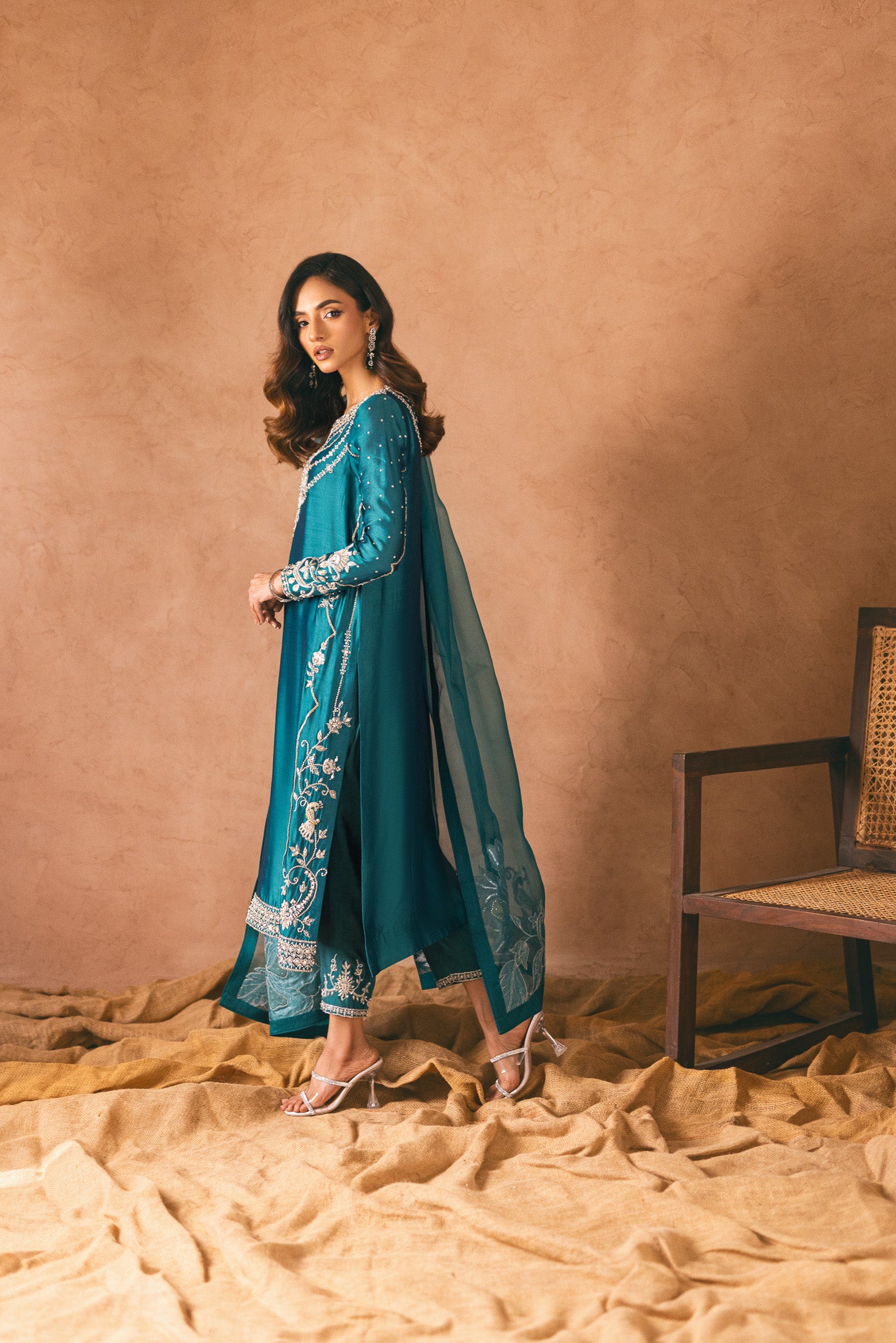 Embrace elegance and captivate hearts in this mesmerizing teal ensemble. The ethereal tissue silk fabric cascades gracefully, while intricate zardozi and hand embellishments create an artistic tapestry on the shirt. The adorned pants exude glamour, but the true enchantment lies in the cascading tonal dupatta, adorned with delicate floral patterns on both sides. Step into a world of allure and grace with this alluring outfit.