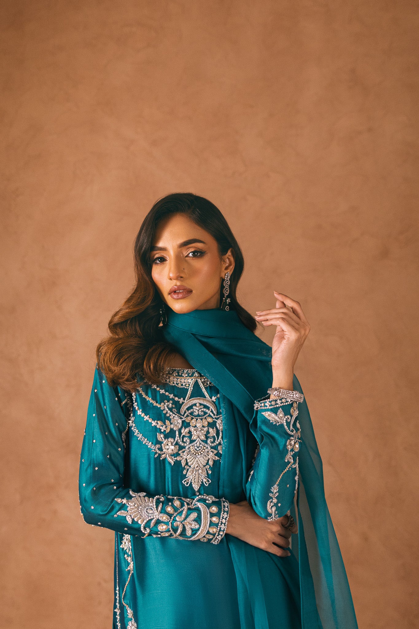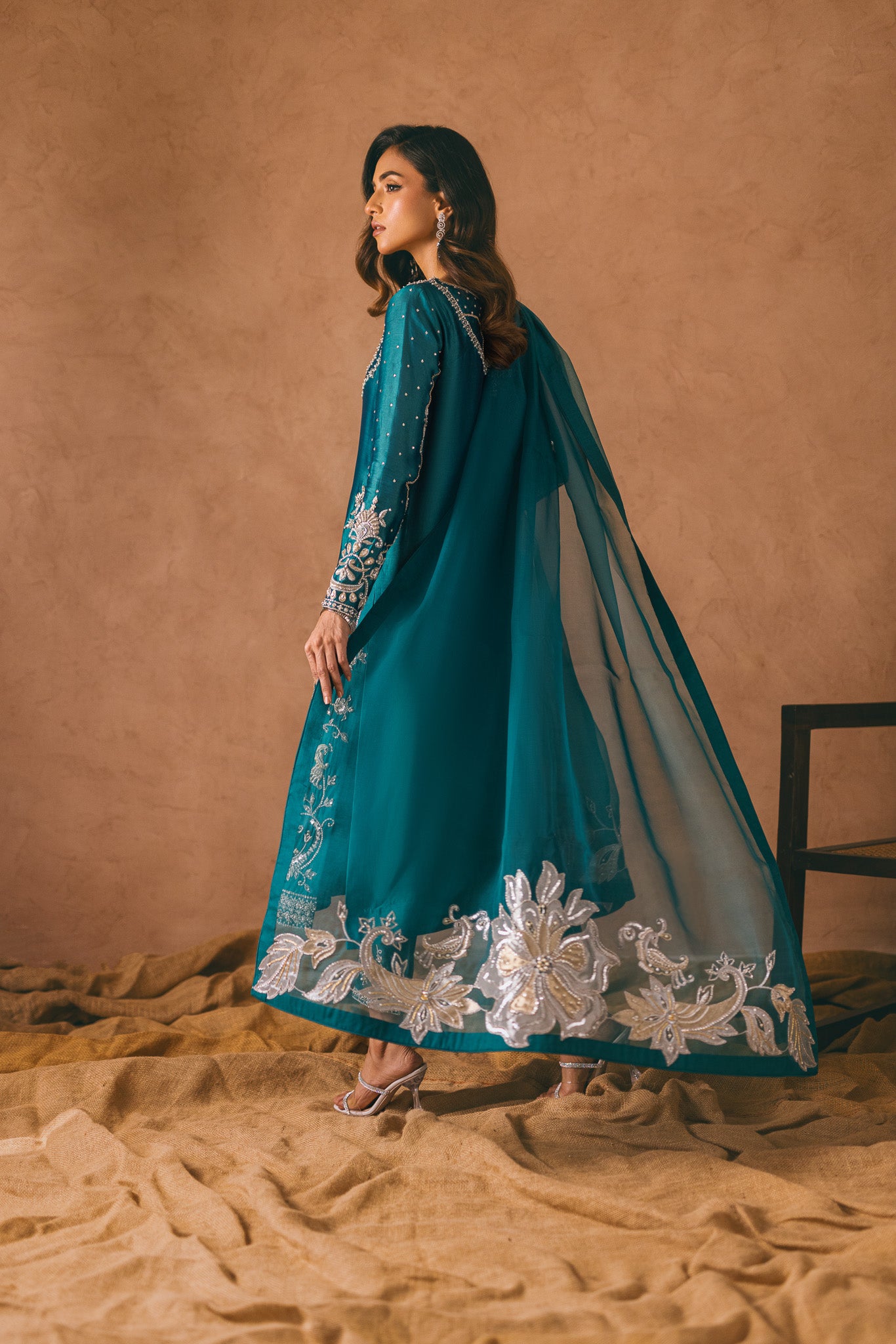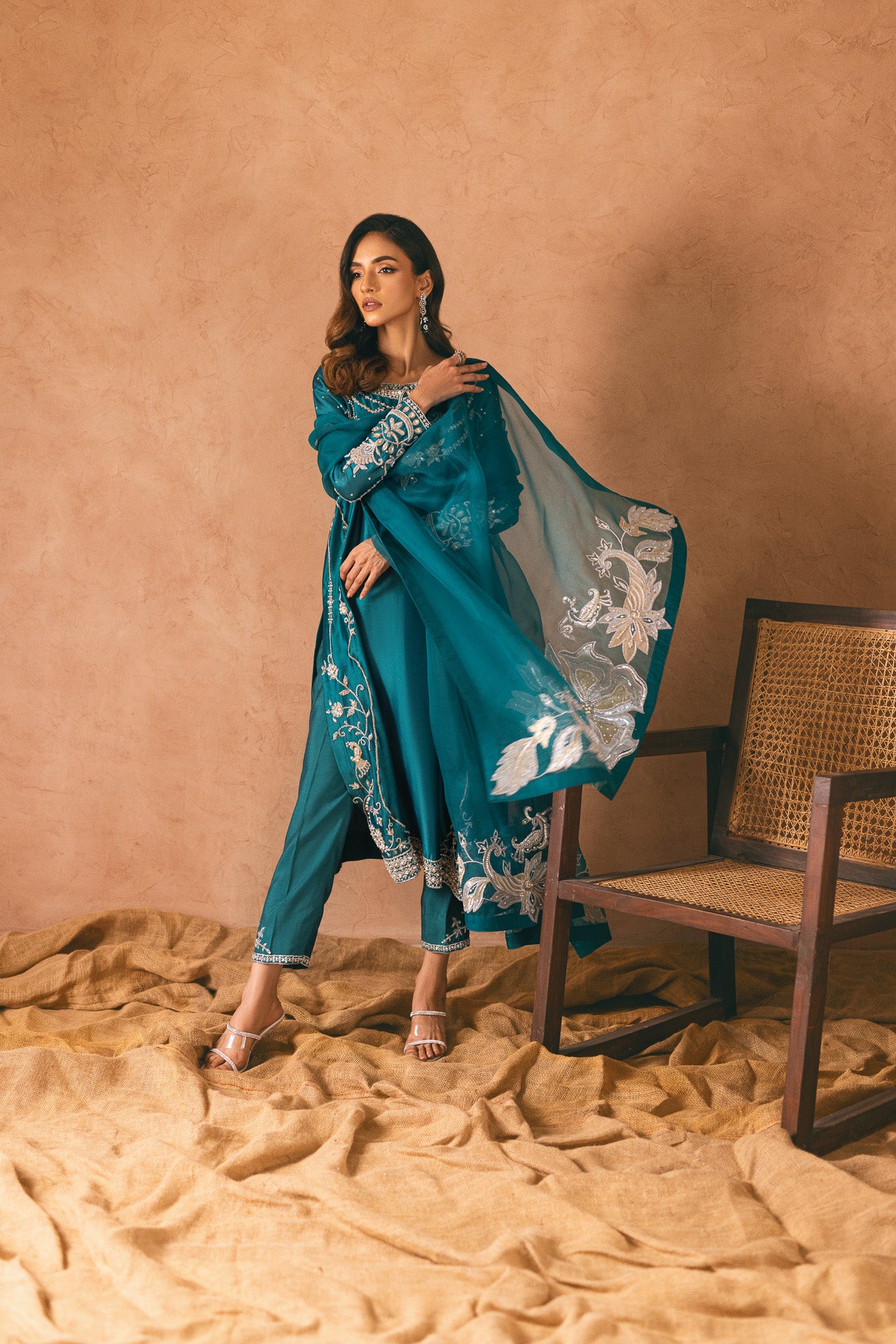 Embrace elegance and captivate hearts in this mesmerizing teal ensemble. The ethereal tissue silk fabric cascades gracefully, while intricate zardozi and hand embellishments create an artistic tapestry on the shirt. The adorned pants exude glamour, but the true enchantment lies in the cascading tonal dupatta, adorned with delicate floral patterns on both sides. Step into a world of allure and grace with this alluring outfit.