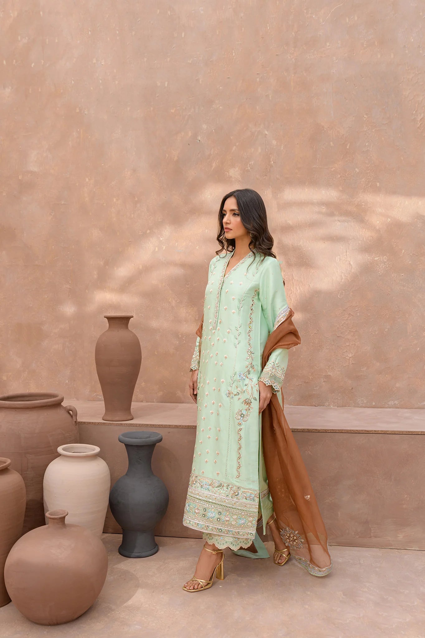 DETAILS: This breathtaking mint green 80gm raw silk ensemble is elevated by intricate hand embroidery, organza leaves, and machine work paired with PURE raw silk culottes showcasing exceptional craftsmanship and attention to detail, perfect for making a stylish statement.