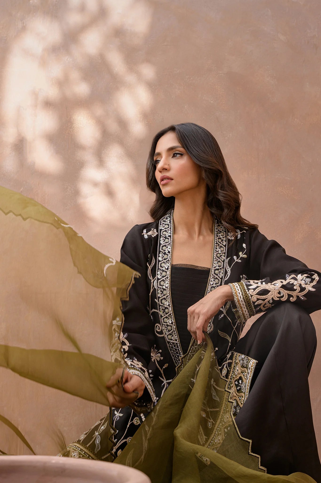 DETAILS: Elevate your style with our sophisticated ensemble: pure butter silk shirt and box pants in sleek black, adorned with intricate machine embroidery with handwork on the neckline and subtle hand touch details.
