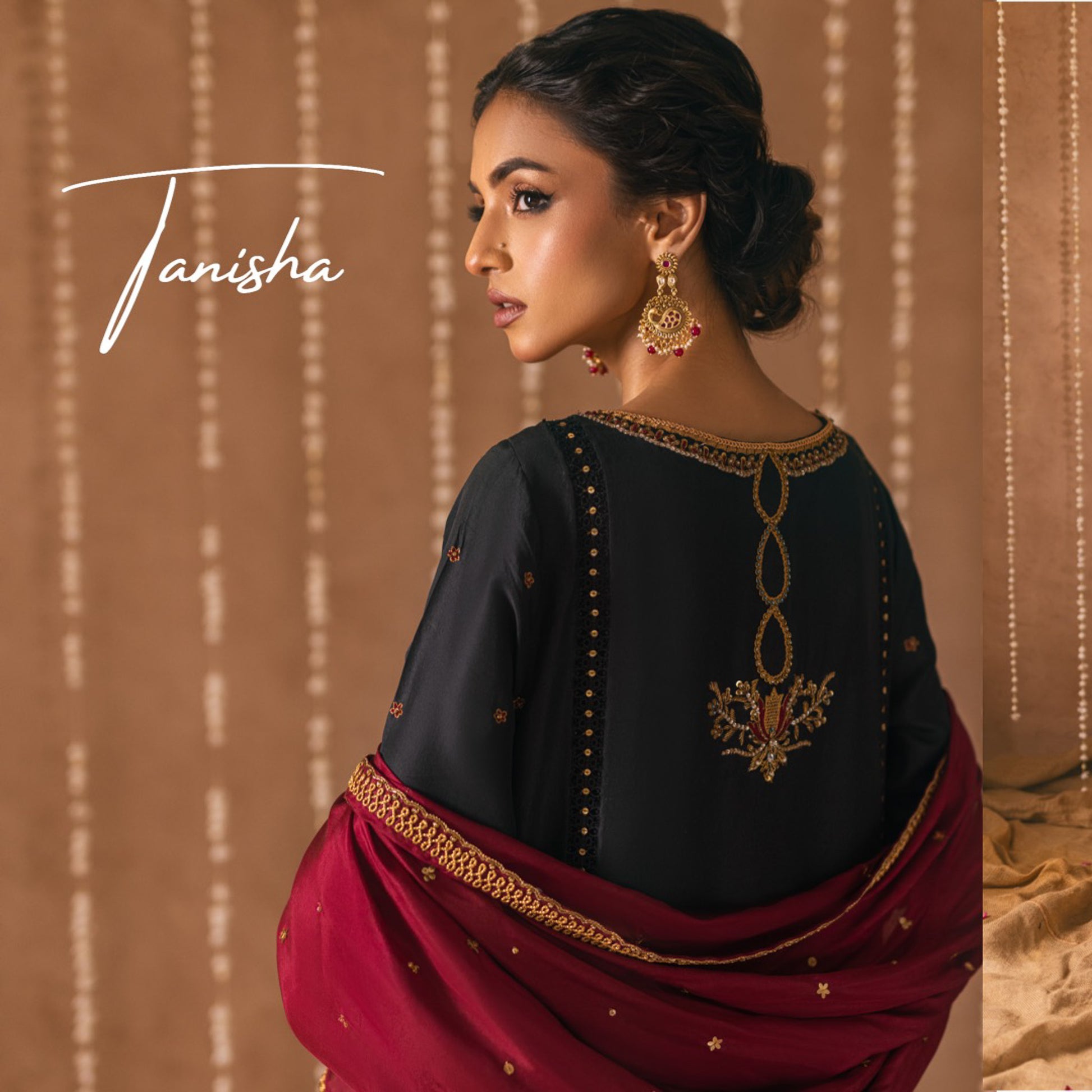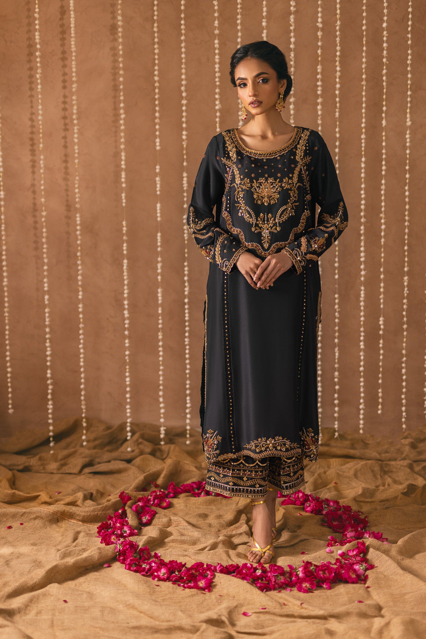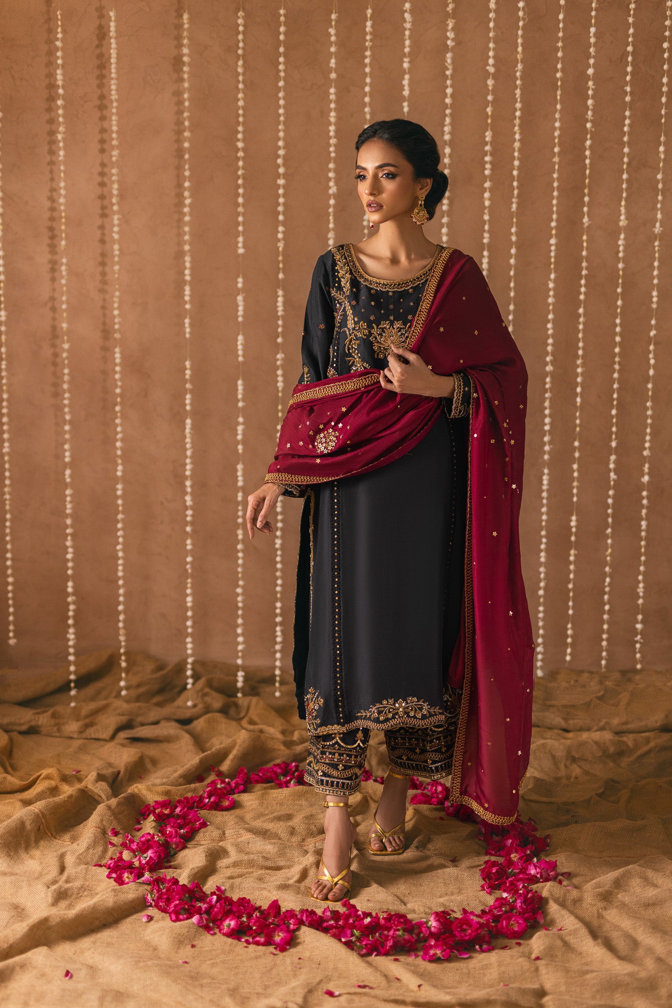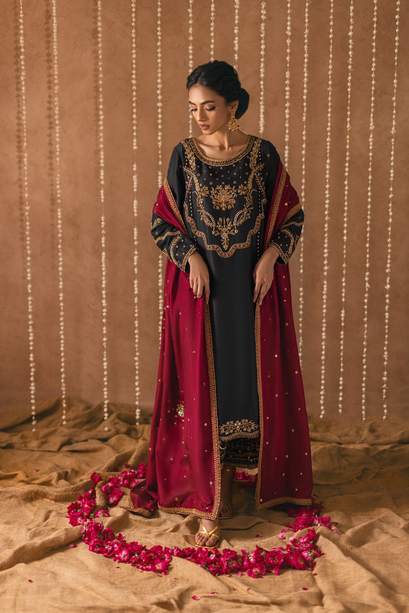 Step into elegance with this captivating outfit that is sure to turn heads. The stunning black kurta, intricately adorned with mesmerizing maroori work, takes center stage with its exquisite pattern. Crafted from pure Rawsilk fabric, the shirt exudes a luxurious feel, embracing you in style.Completing this ensemble is a dupatta in a contrasting maroon shade, adorned with a delicate spray inlay and captivating work detailings. The graceful flow of the dupatta adds a touch of enchantment, draping you in sheer elegance.The culottes, meticulously hand-embellished, elevate the glamour of this outfit to new heights. Every step you take will be infused with confidence and grace, as the culottes add a touch of sophistication and panache.Be prepared to make a statement at any event or occasion with this alluring ensemble.