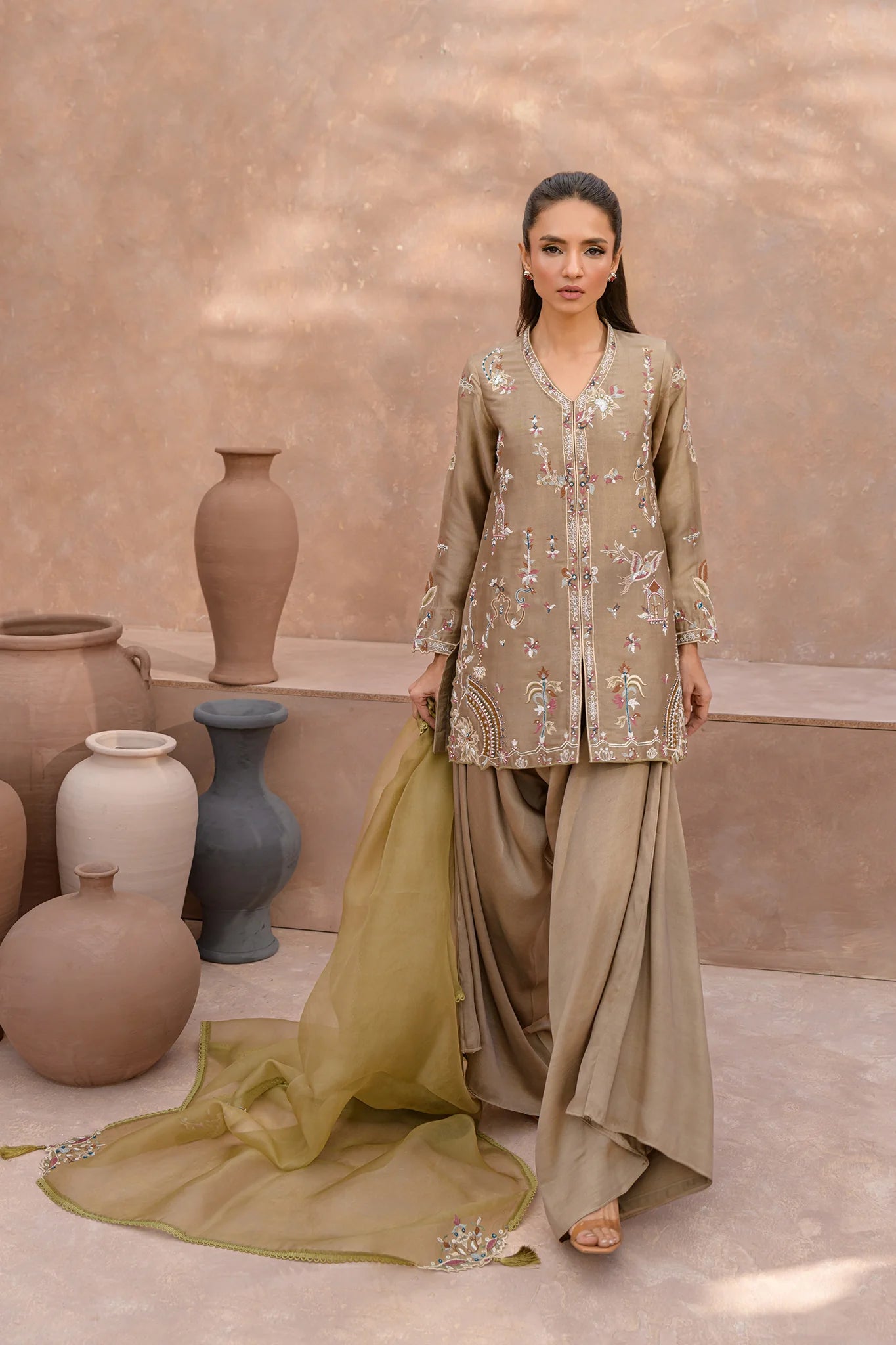 DETAILS: Make a statement with this stunning golden pure butter silk shirt and pants. Beautiful machine embroidery is perfectly complemented by subtle handwork details, creating a truly regal and eye-catching look.