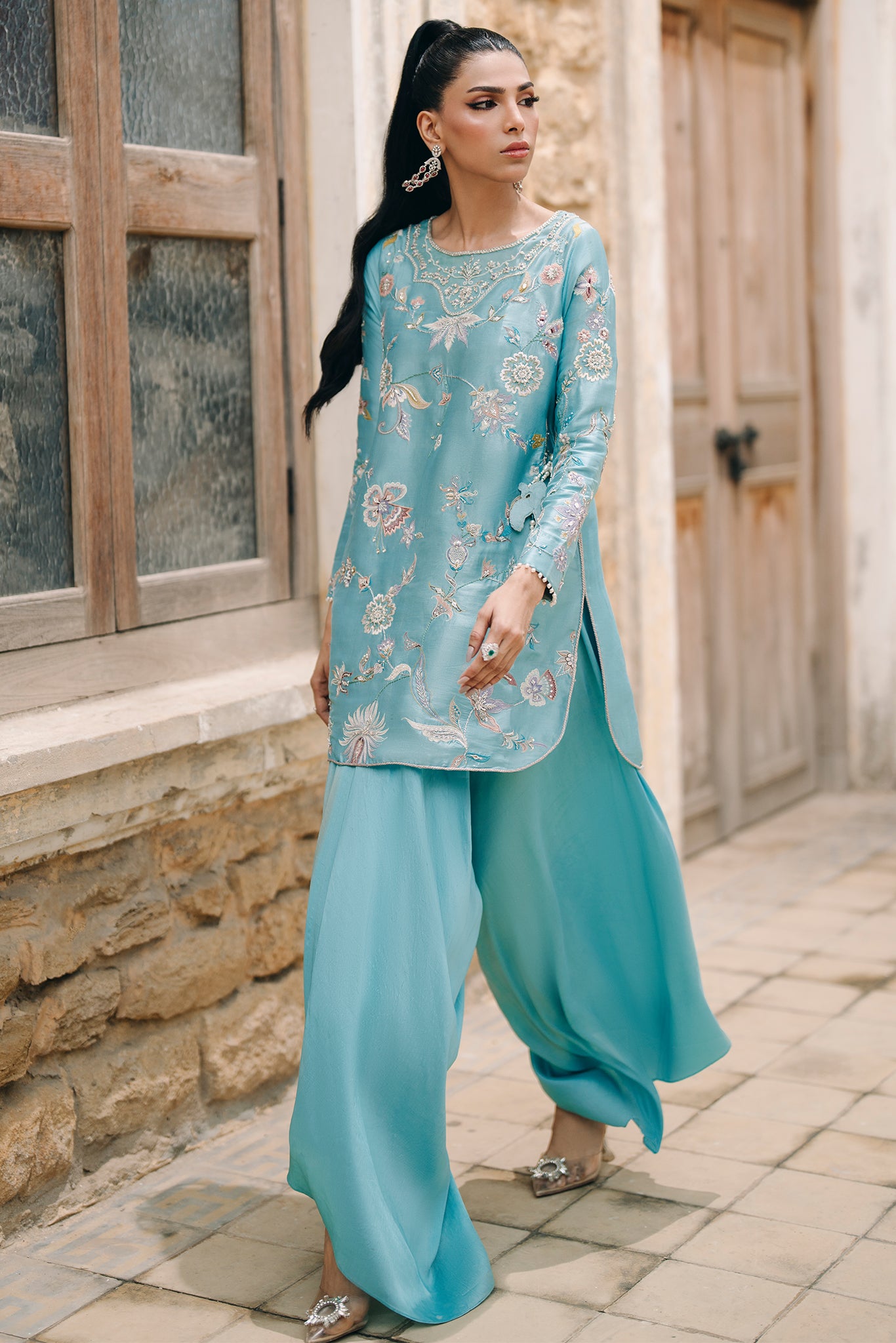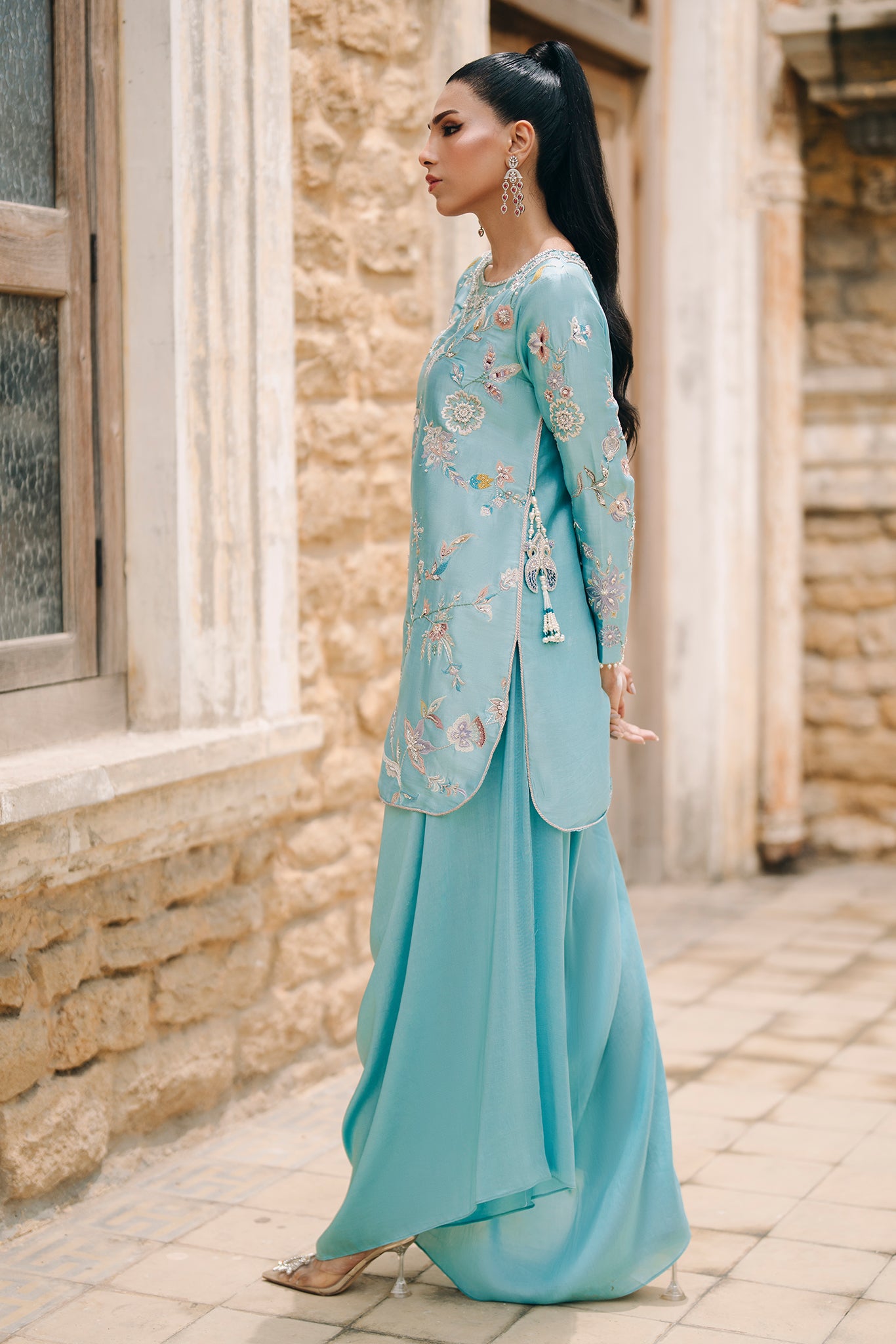Mia epitomizes chic elegance with its pure butter silk shirt in a captivating shade of turquoise. Adorned with exquisite pastel resham embroideries, the shirt's allure is further enhanced by a hand-embellished neckline and peacock tassels that dangle with sophistication. Paired with box pants that inject a modern, stylish edge, making this outfit a perfect choice for a bride’s sister or friend who wishes to captivate and stand out in a crowd.
