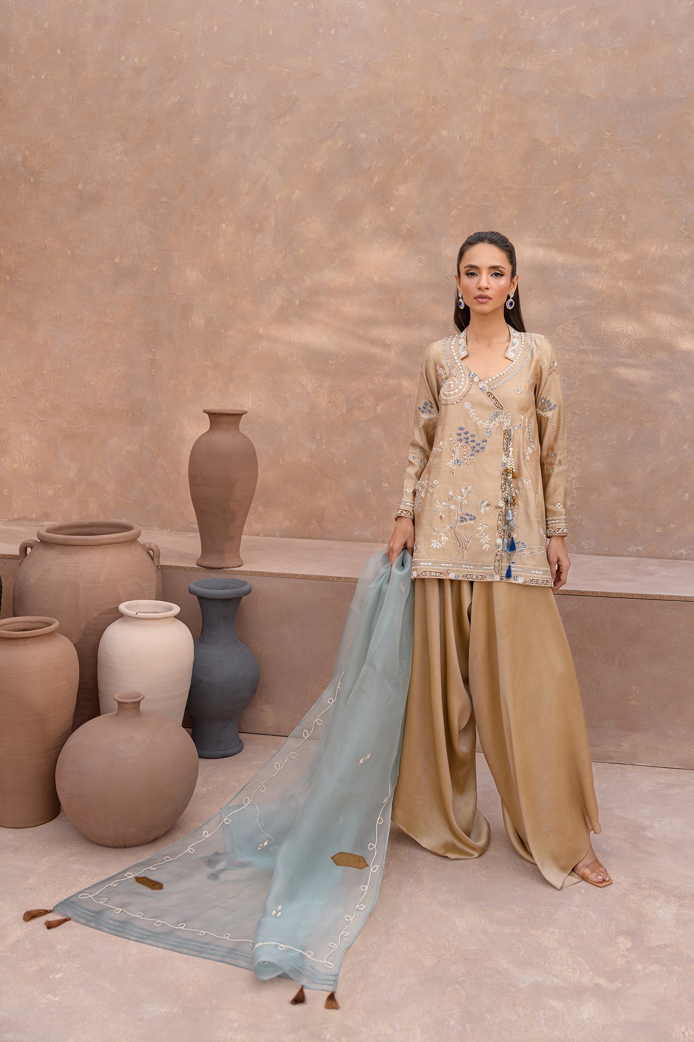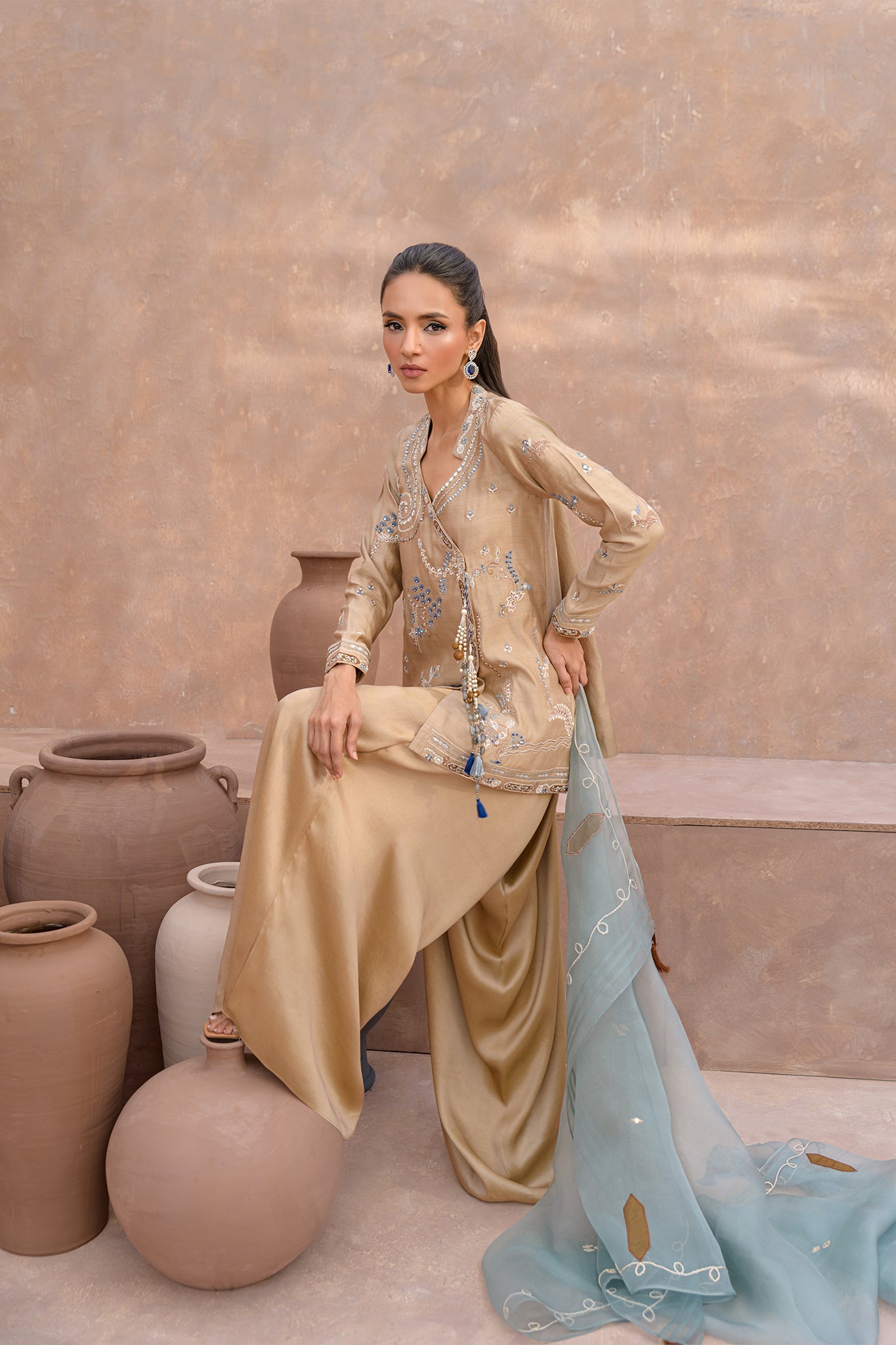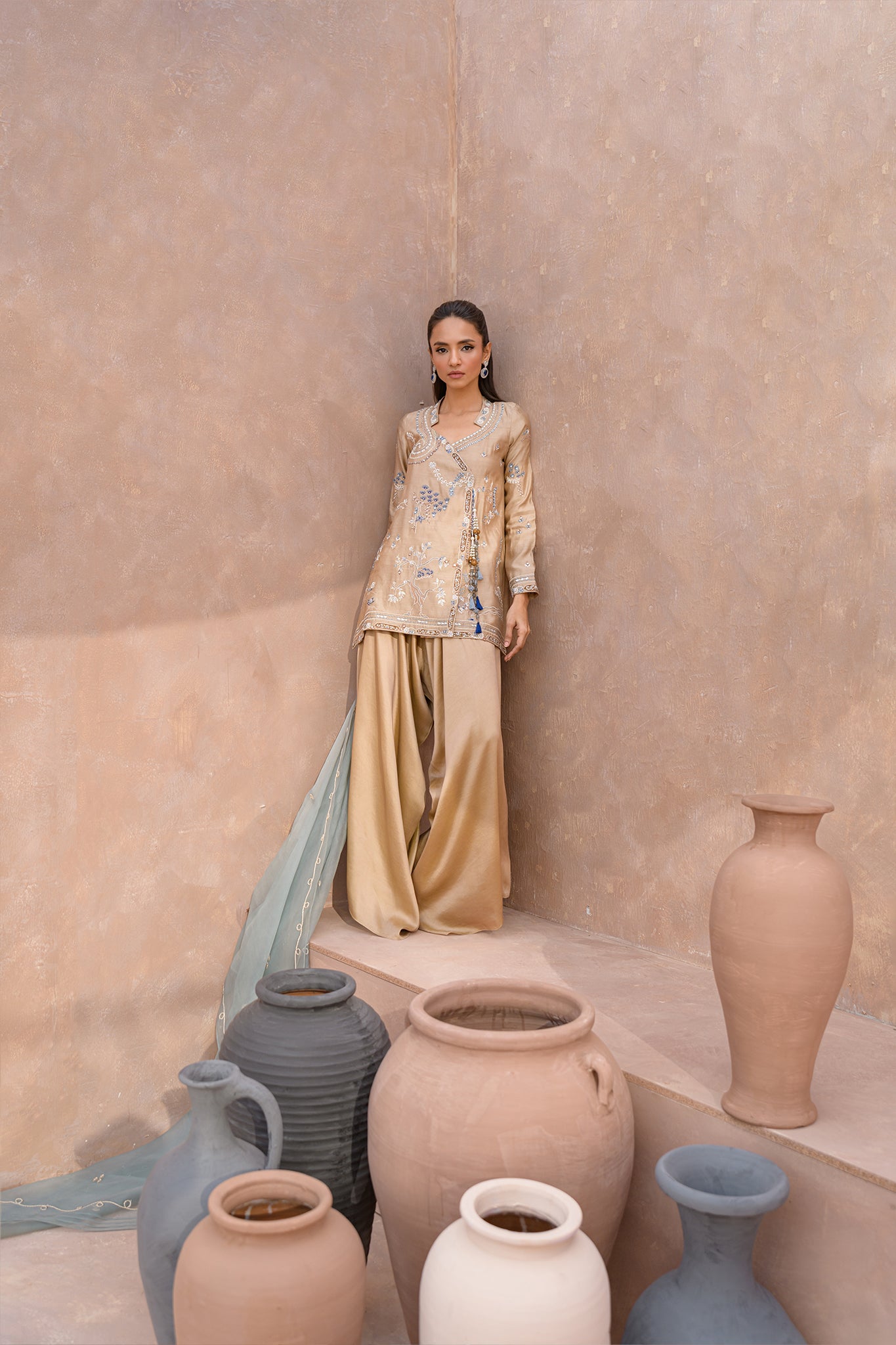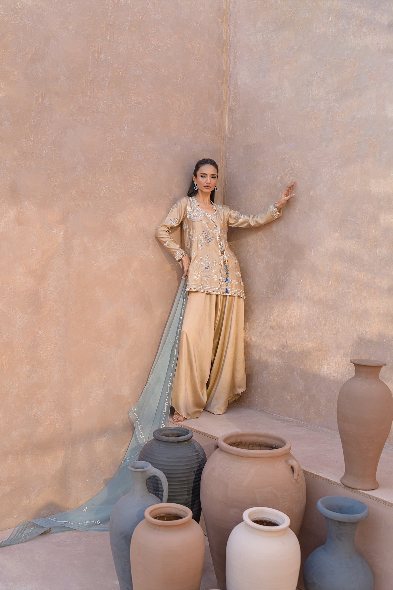 DETAILS: Elevate your style with this resplendent golden ensemble, featuring a pure butter silk shirt and box pants. The intricate Angarakha work is meticulously crafted, with subtle handwork touches adding a level of luxury and sophistication that's truly fit for royalty.
