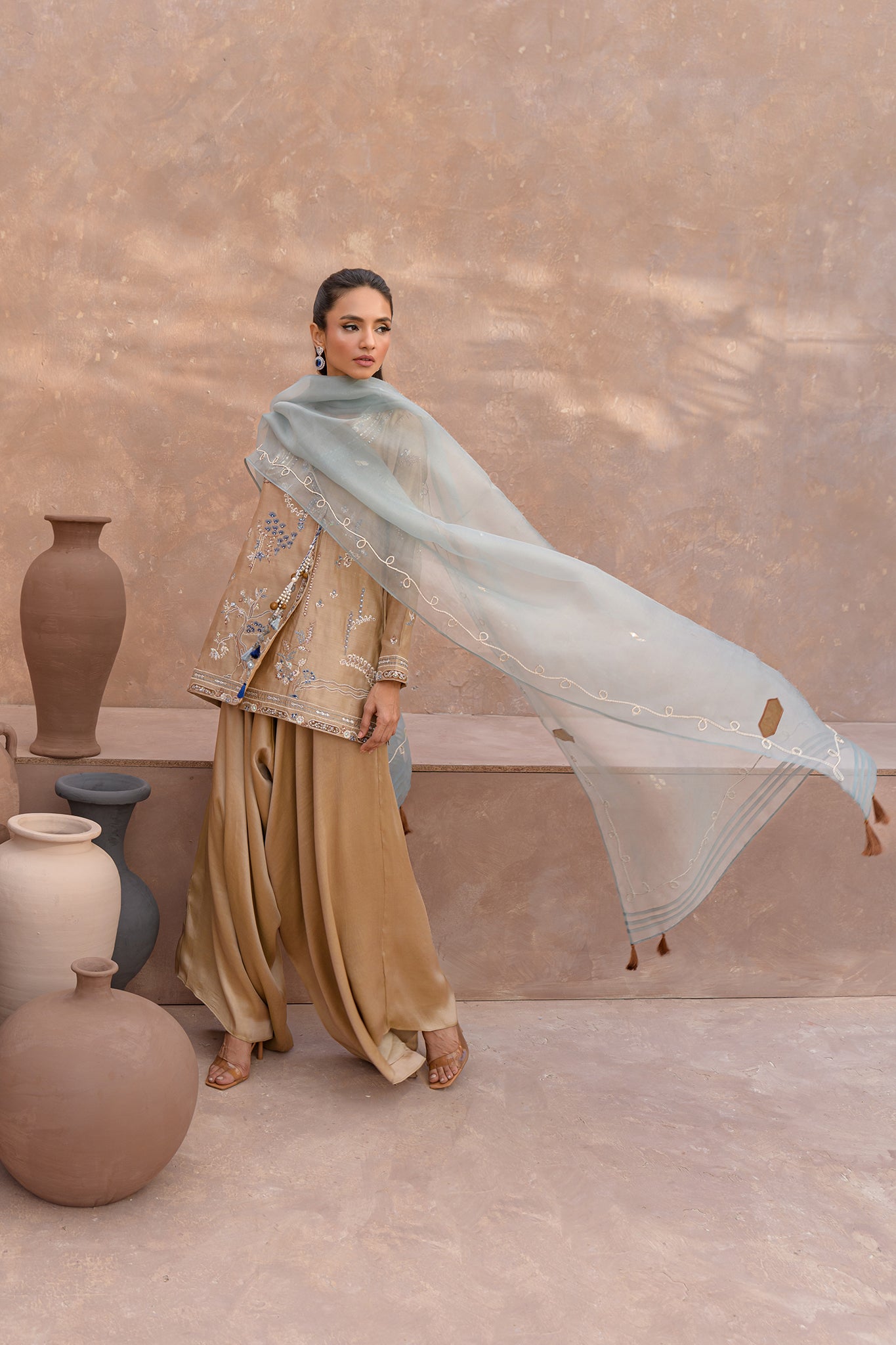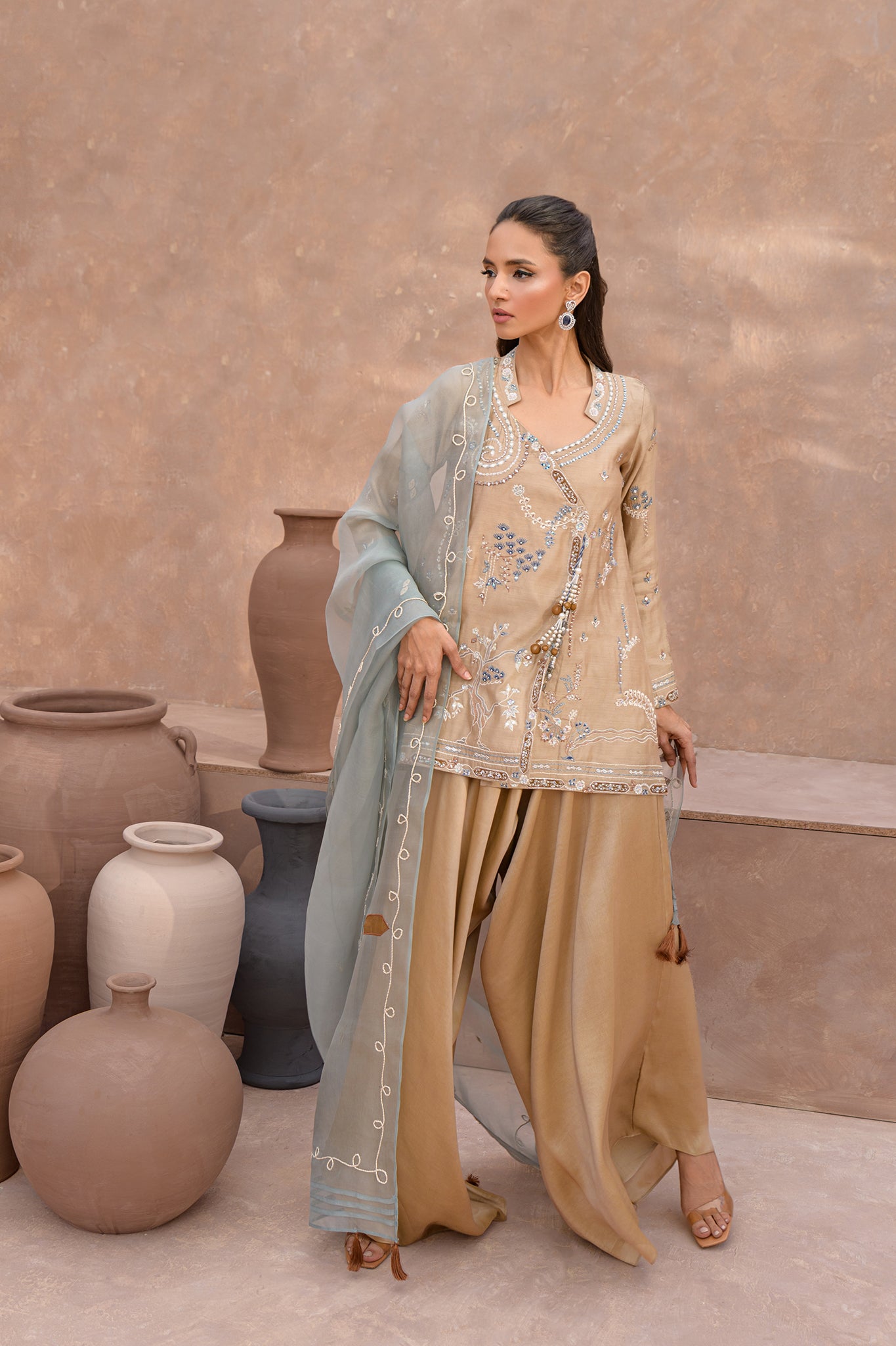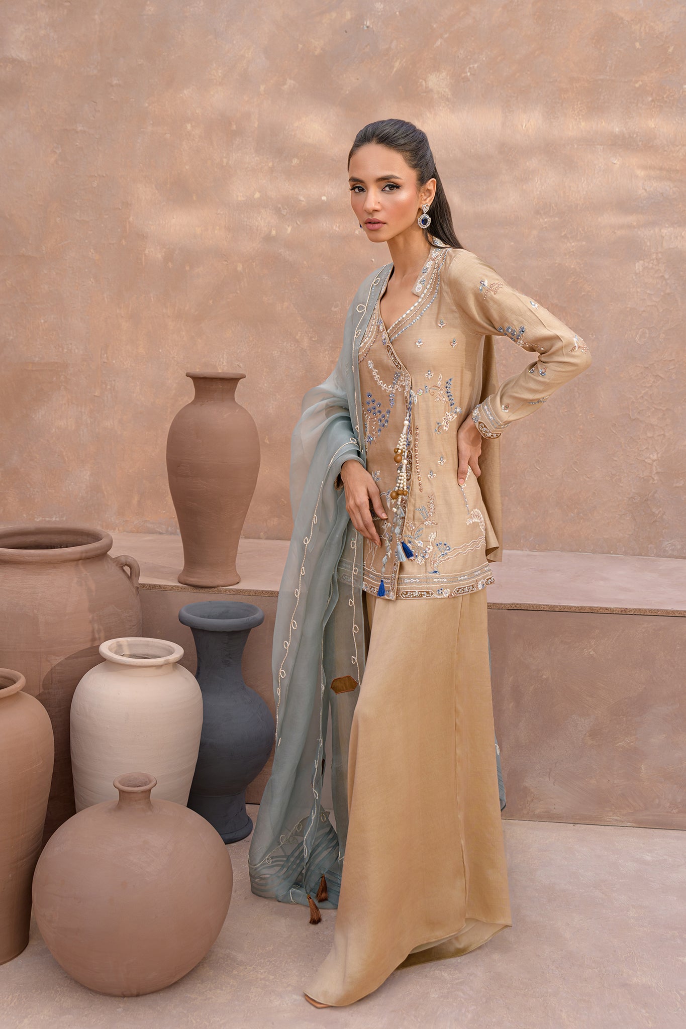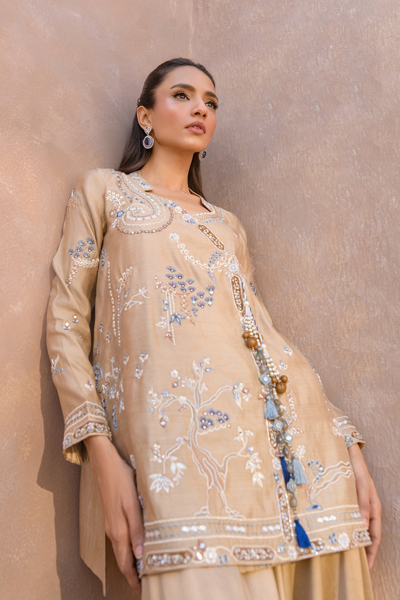 DETAILS: Elevate your style with this resplendent golden ensemble, featuring a pure butter silk shirt and box pants. The intricate Angarakha work is meticulously crafted, with subtle handwork touches adding a level of luxury and sophistication that's truly fit for royalty.