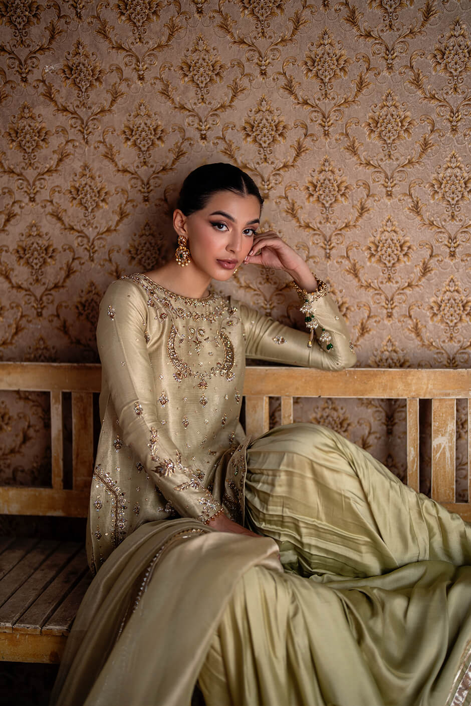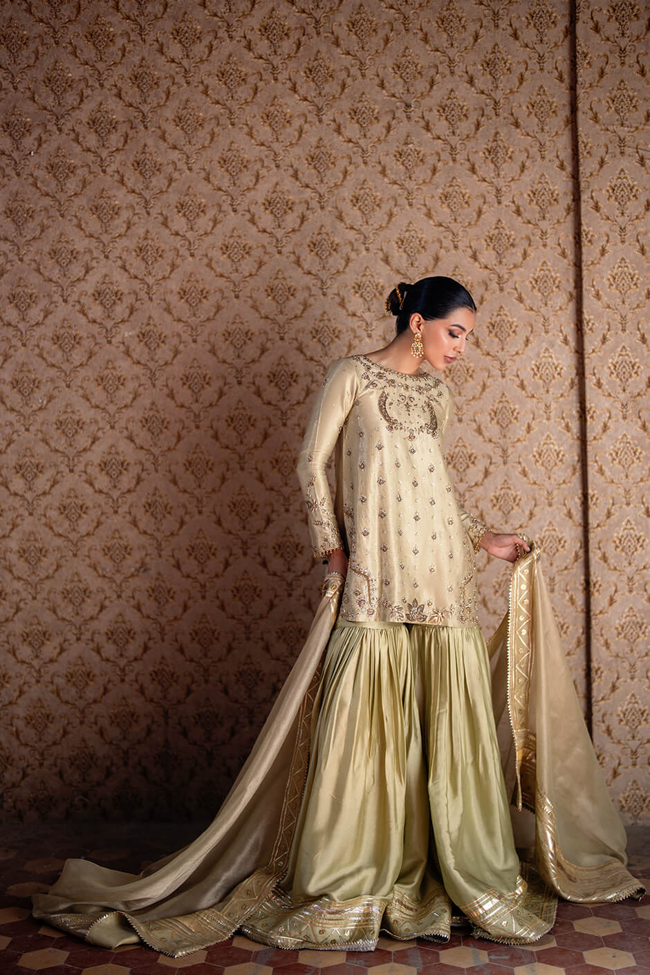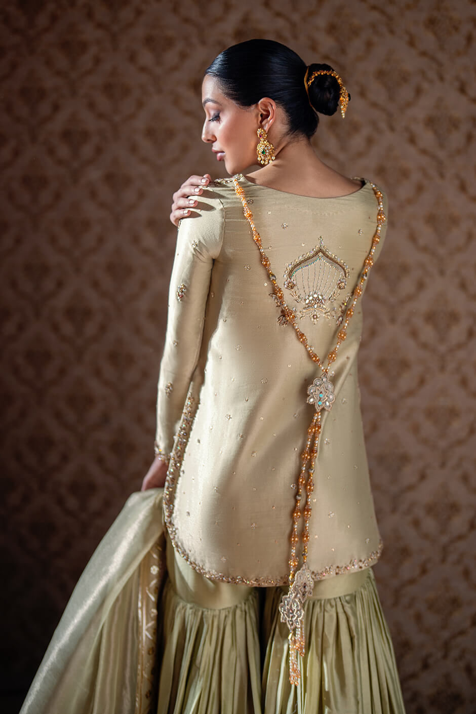A timeless ode to tradition, this mint green gharara brings the classic silhouette back into the spotlight. Adorned with delicate handwork and shimmering gota detailing, it captures the grace of heritage with a whisper of modern charm.