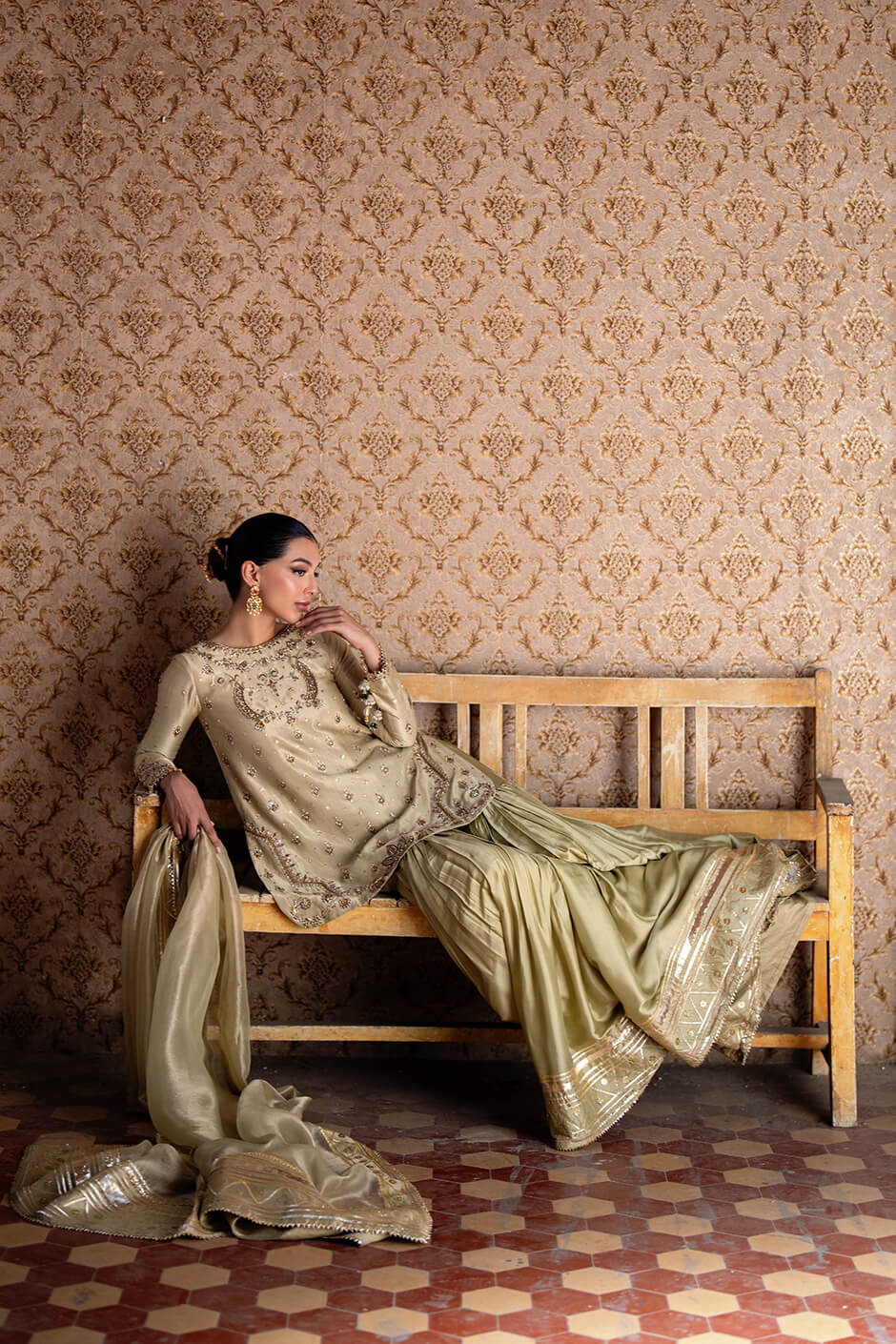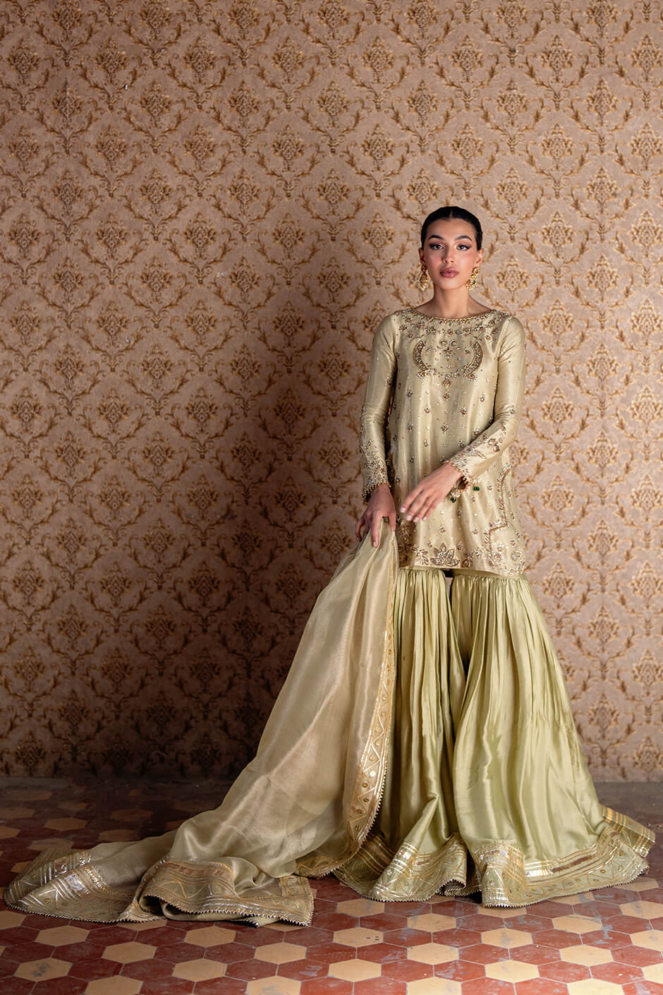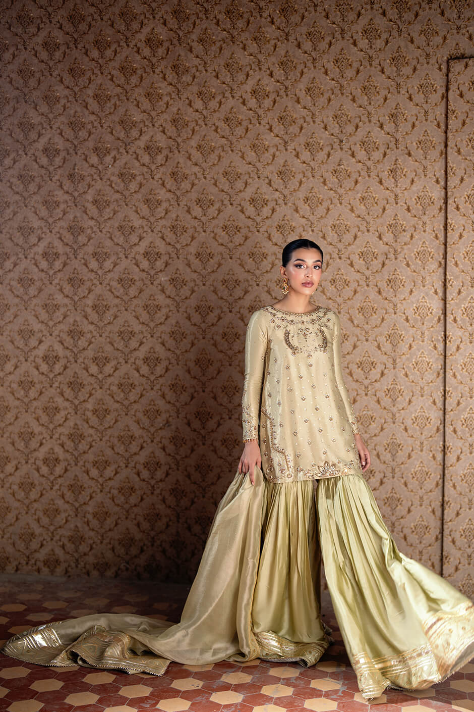 A timeless ode to tradition, this mint green gharara brings the classic silhouette back into the spotlight. Adorned with delicate handwork and shimmering gota detailing, it captures the grace of heritage with a whisper of modern charm.