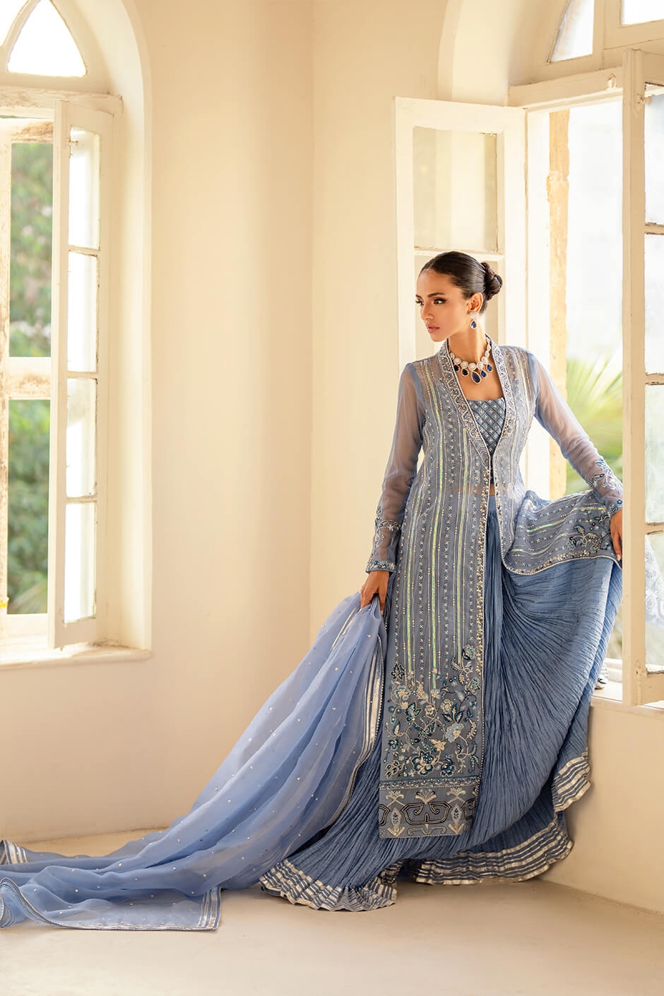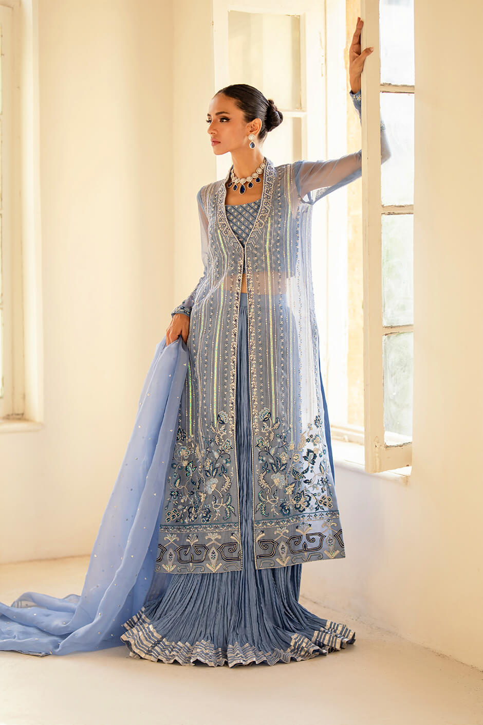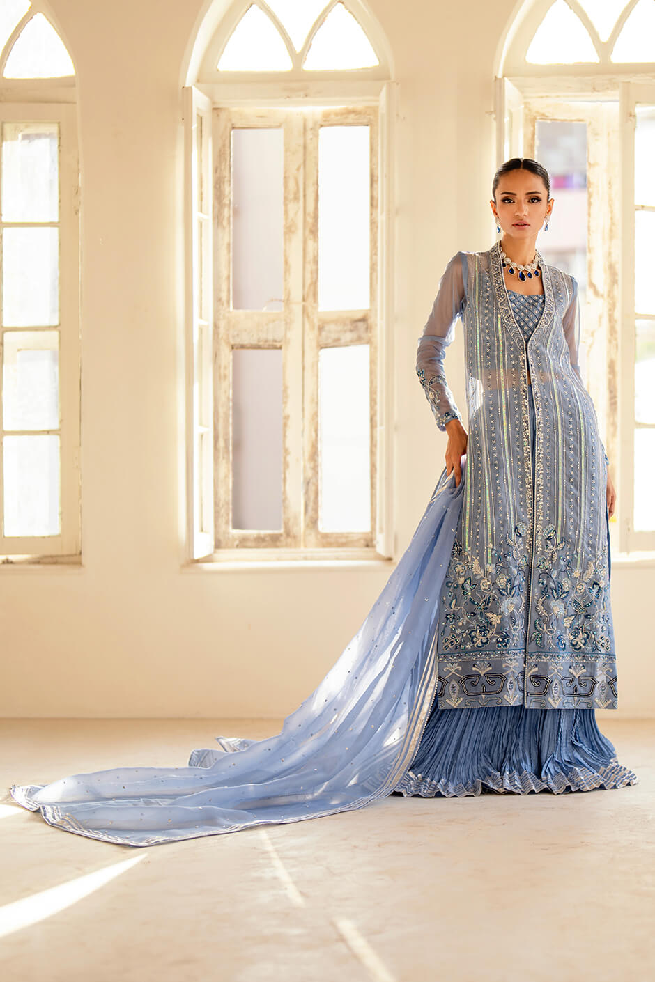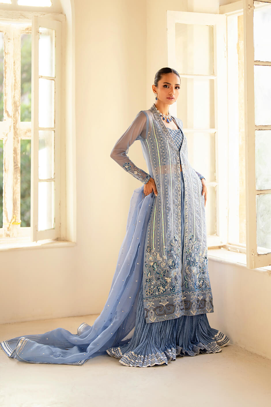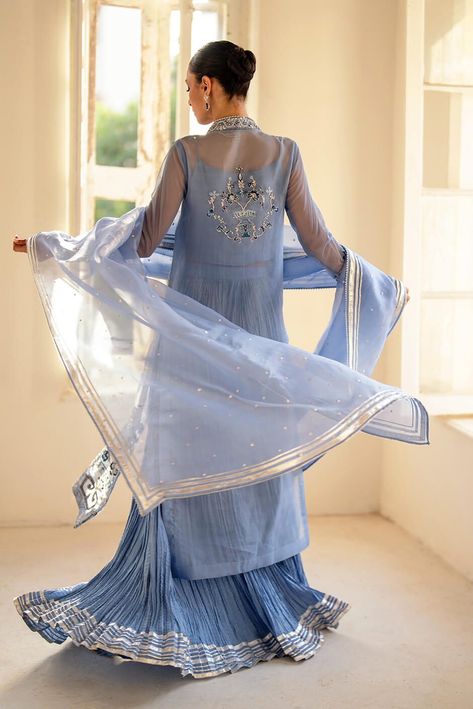 Exquisite pure Organza shirt paired with elegant pure cotton silk sharara and a delicate pure Organza dupatta. Adorned with intricate Cut Dana tones and thread work, this ensemble embodies ethereal beauty and refined sophistication.
