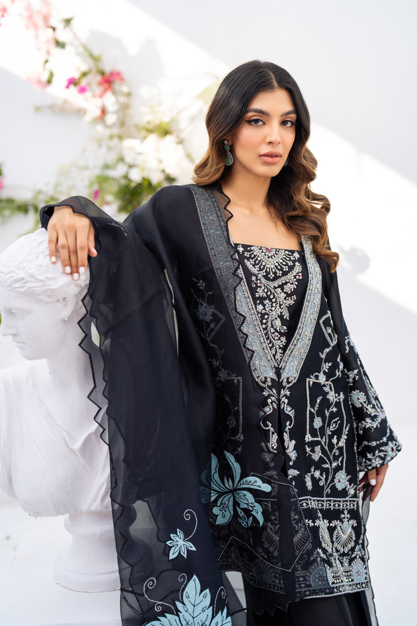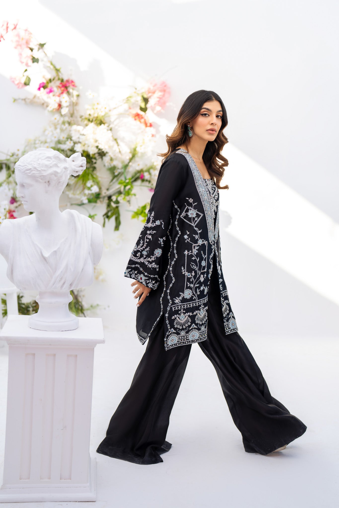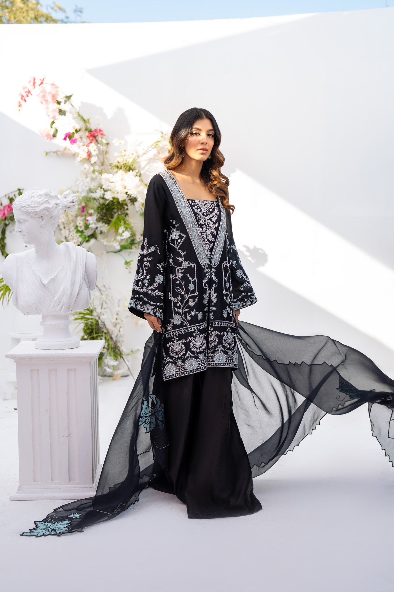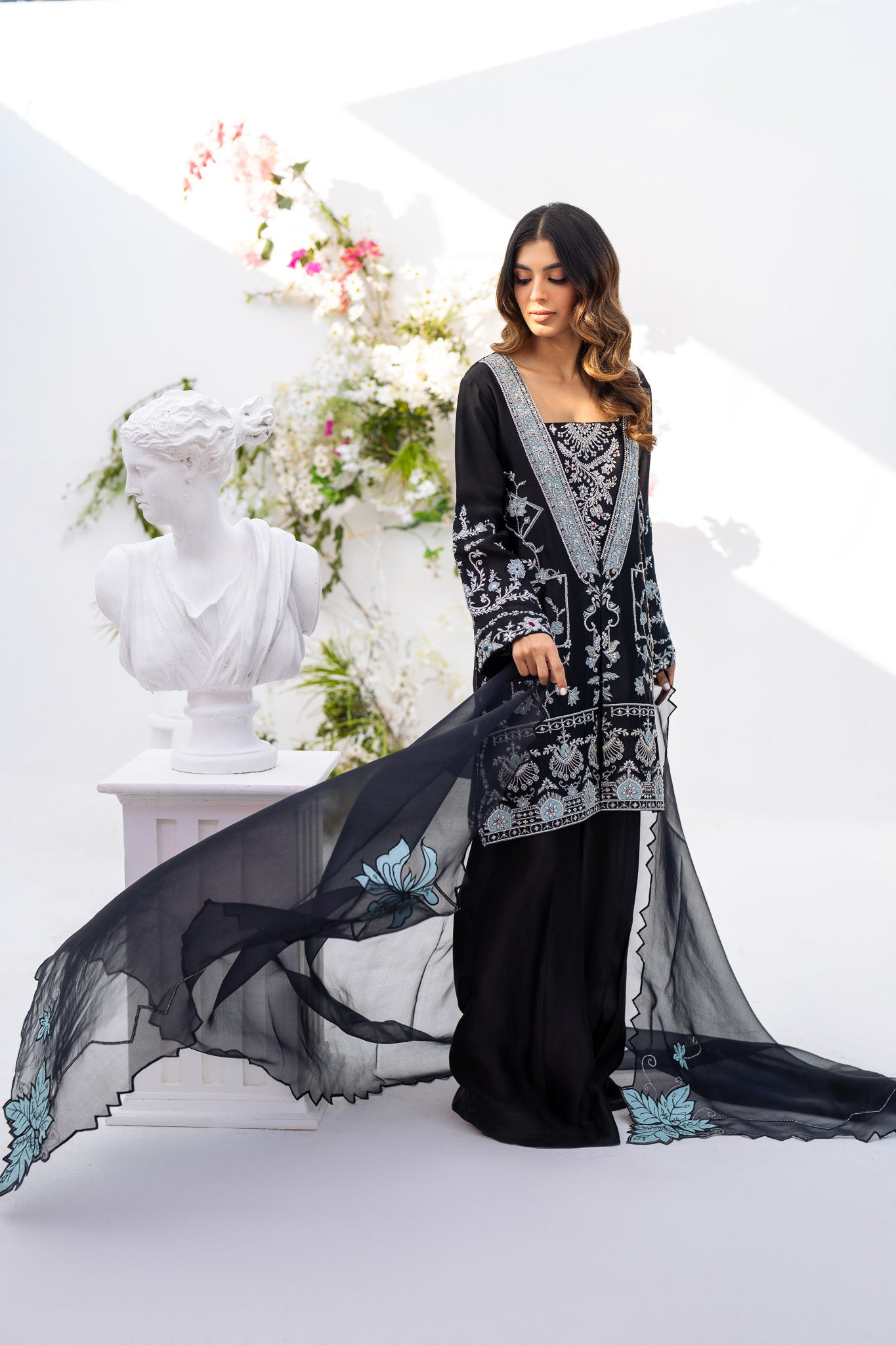 Unveil elegance with our midnight black jacket, adorned with exquisite handwork details of zardozi and kora dabka, accented by a subtle pop of sky blue. It is complemented by chic silk pants and an organza dupatta adorned with delicate floral motifs that add an oomph to the attire.