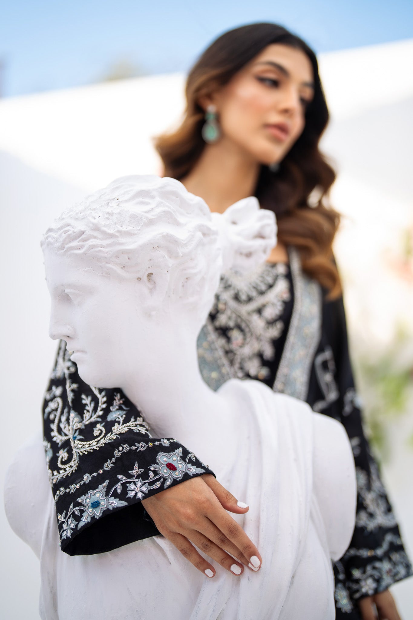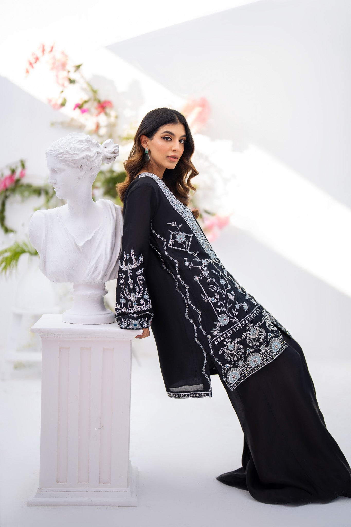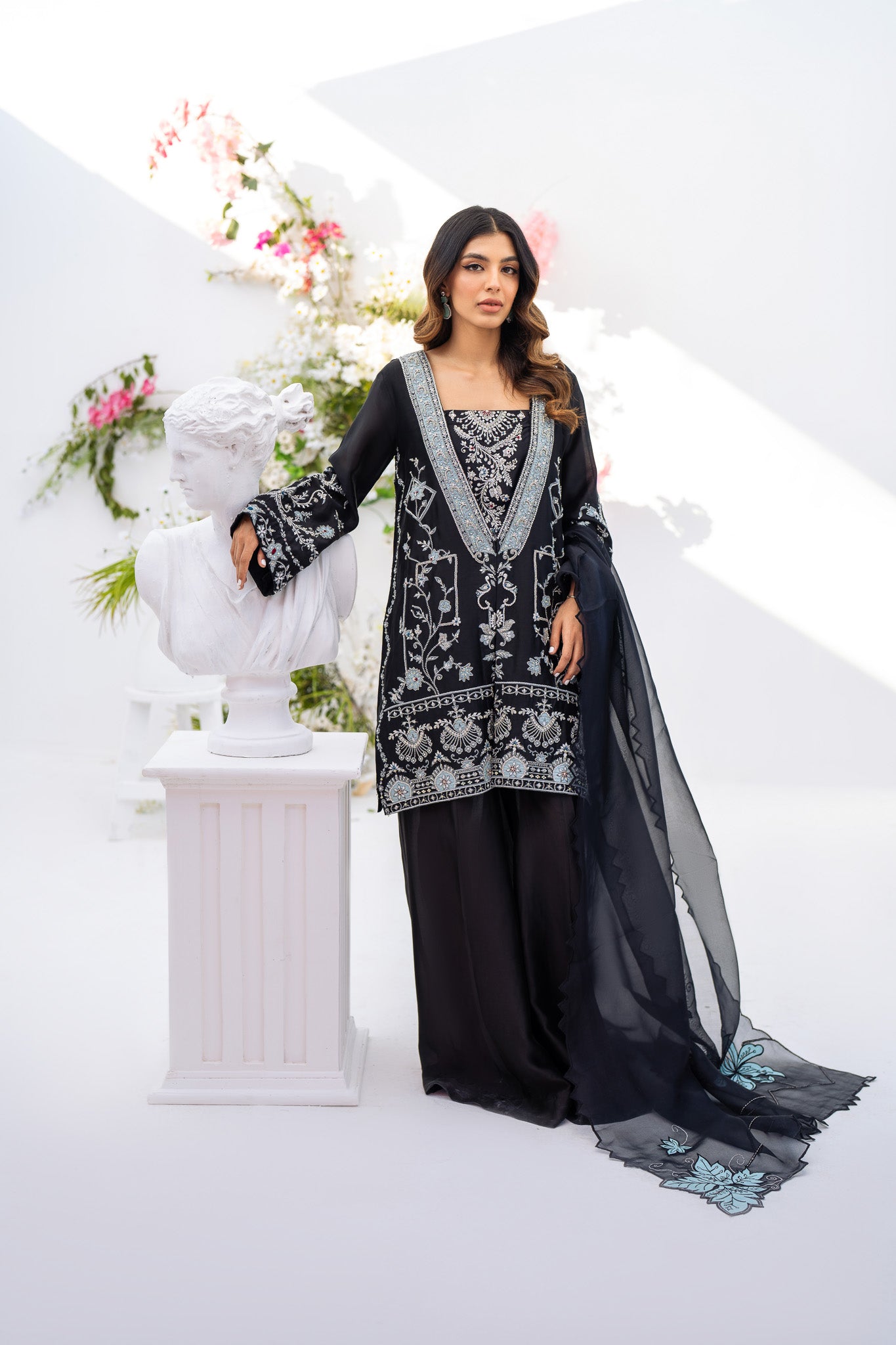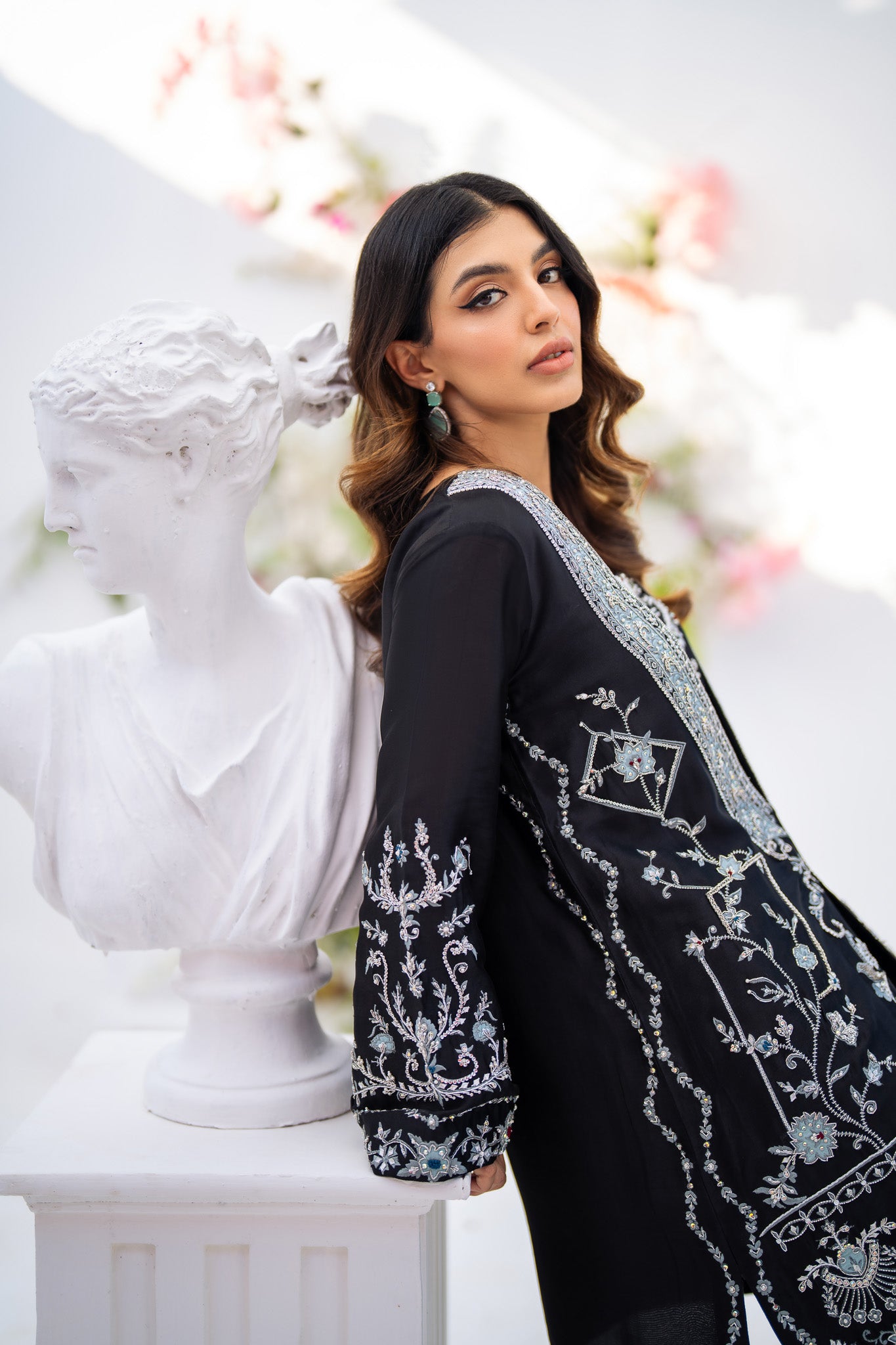 Unveil elegance with our midnight black jacket, adorned with exquisite handwork details of zardozi and kora dabka, accented by a subtle pop of sky blue. It is complemented by chic silk pants and an organza dupatta adorned with delicate floral motifs that add an oomph to the attire.