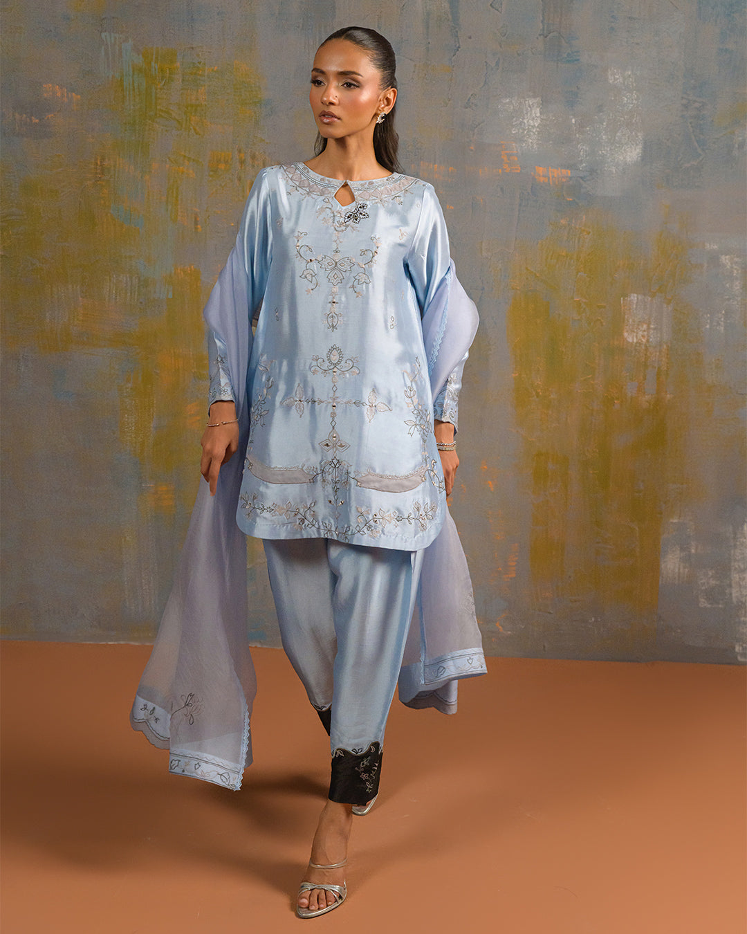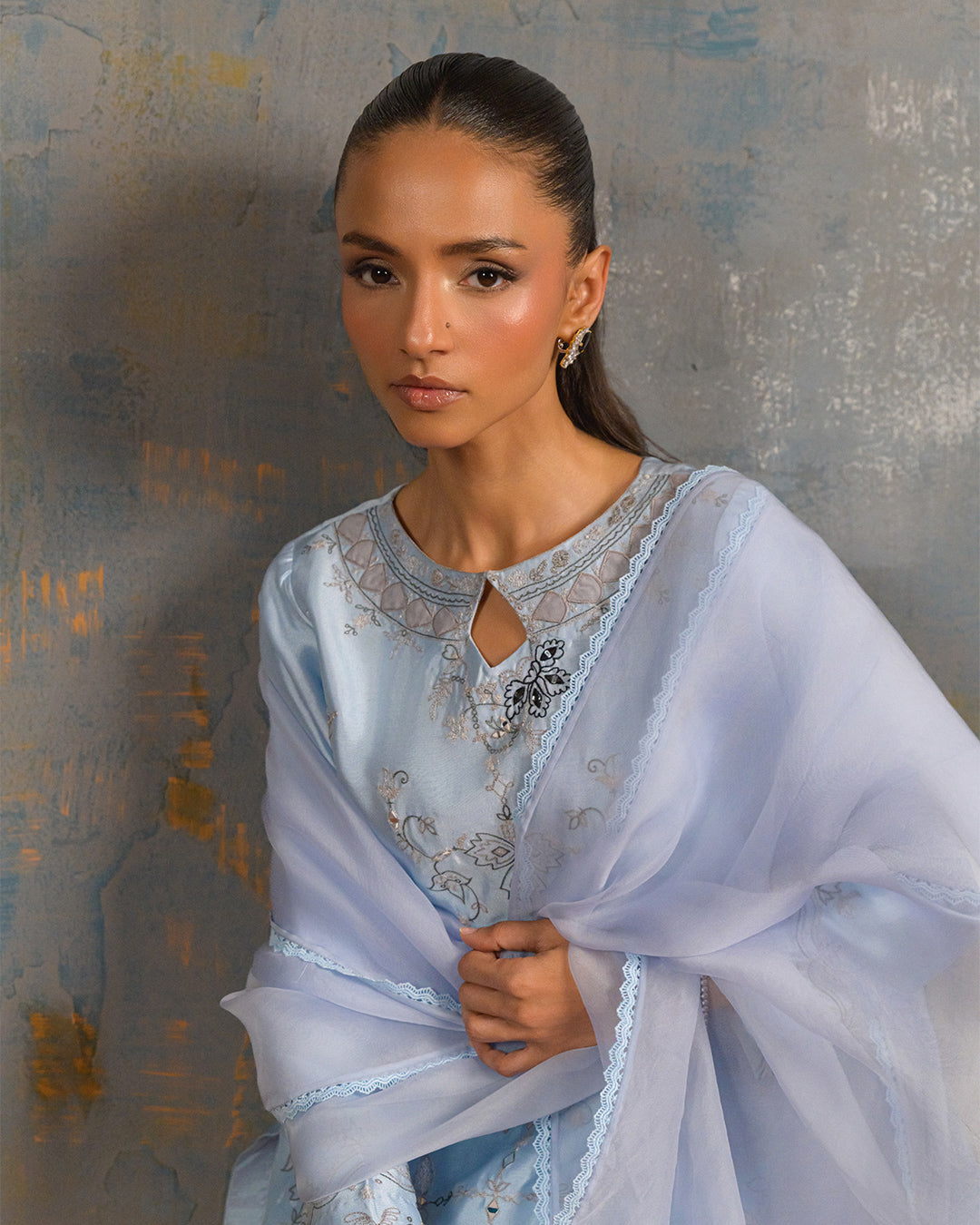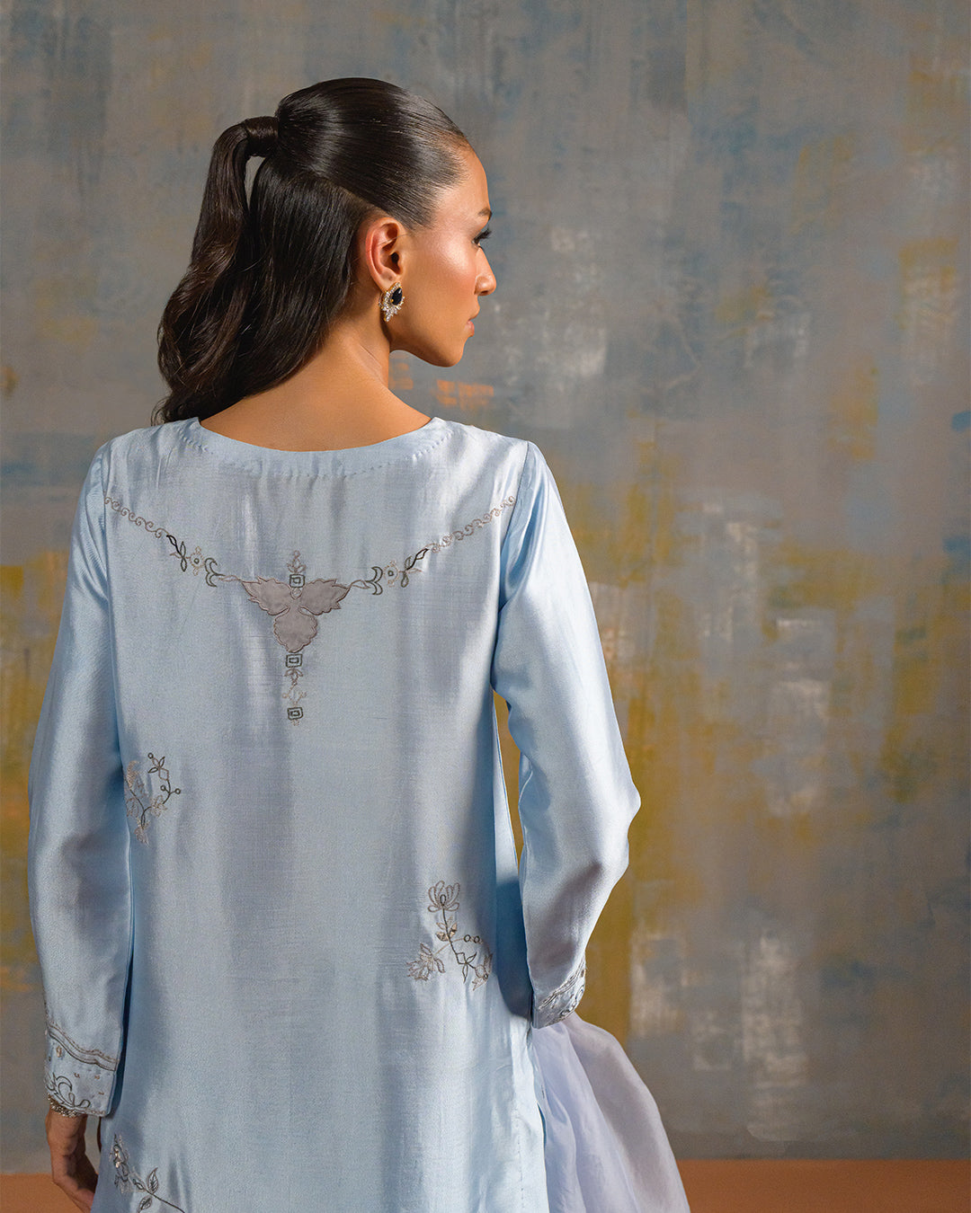 Exquisite pure butter silk shirt and pants ensemble featuring intricate machine work, appliqué, and mirror work. Paired with a stunning pure organza dupatta, this outfit combines elegance and sophistication—perfect for special occasions.
