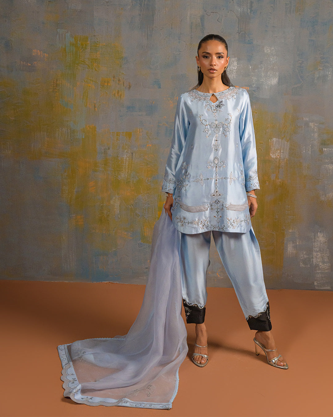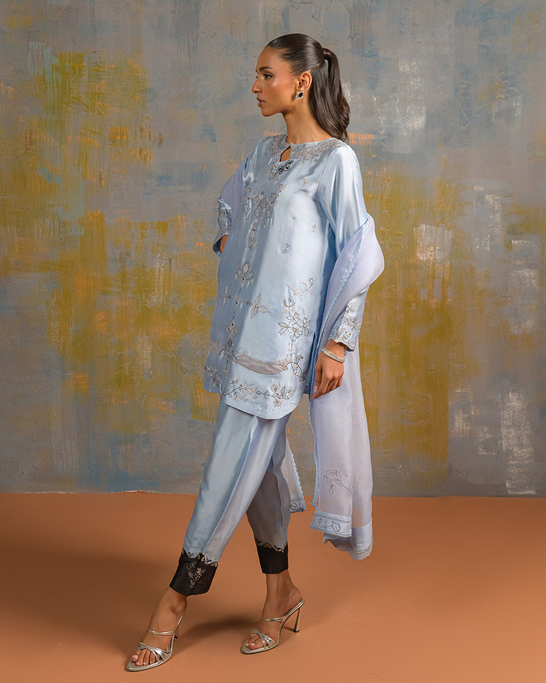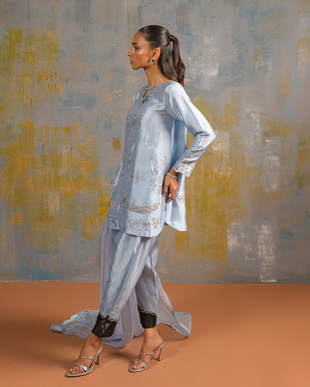 Exquisite pure butter silk shirt and pants ensemble featuring intricate machine work, appliqué, and mirror work. Paired with a stunning pure organza dupatta, this outfit combines elegance and sophistication—perfect for special occasions.