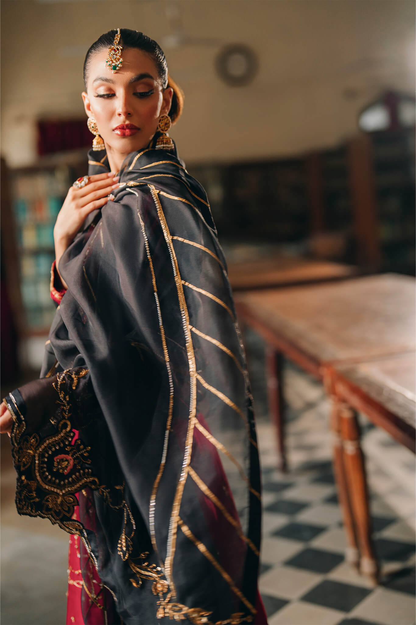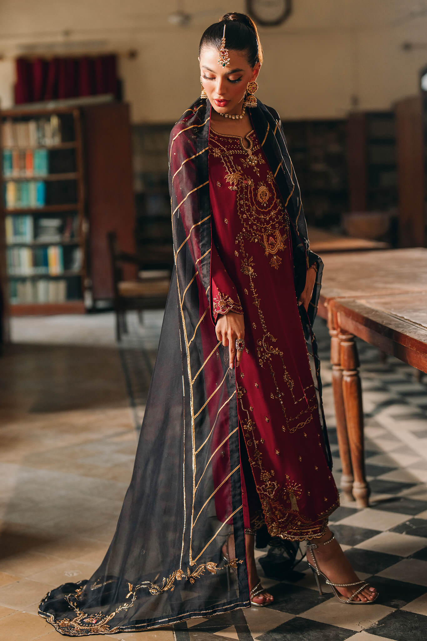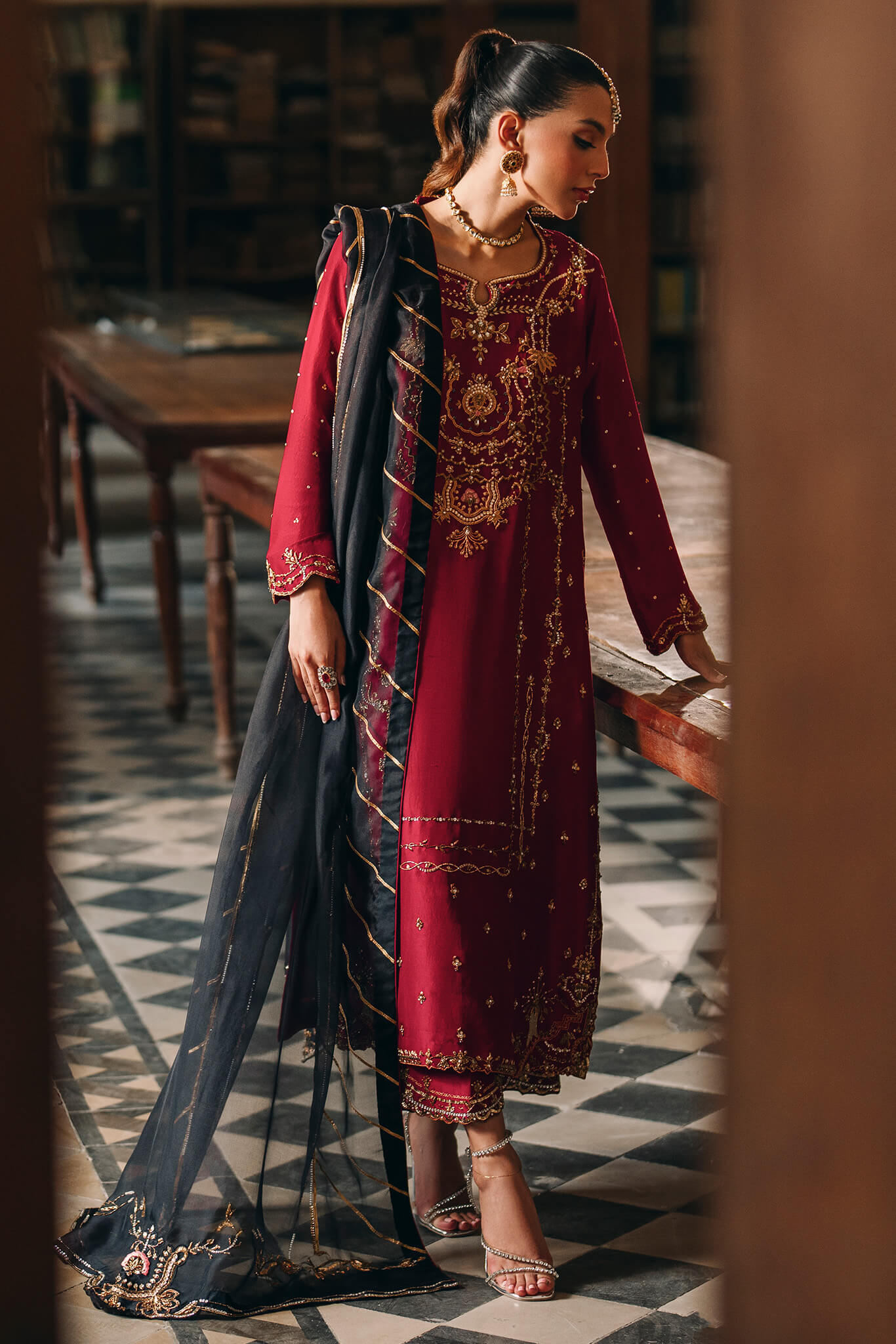 timeless silhouette showcases age-old hand detailing, with the neckline standing out for its exquisite, intricate craftsmanship. Complemented by embellished culottes and a contrasting black dupatta, which features delicate handwork along the border, ‘Ruhi’ elegantly merges traditional artistry with modern sophistication, making it a standout choice for any occasion.