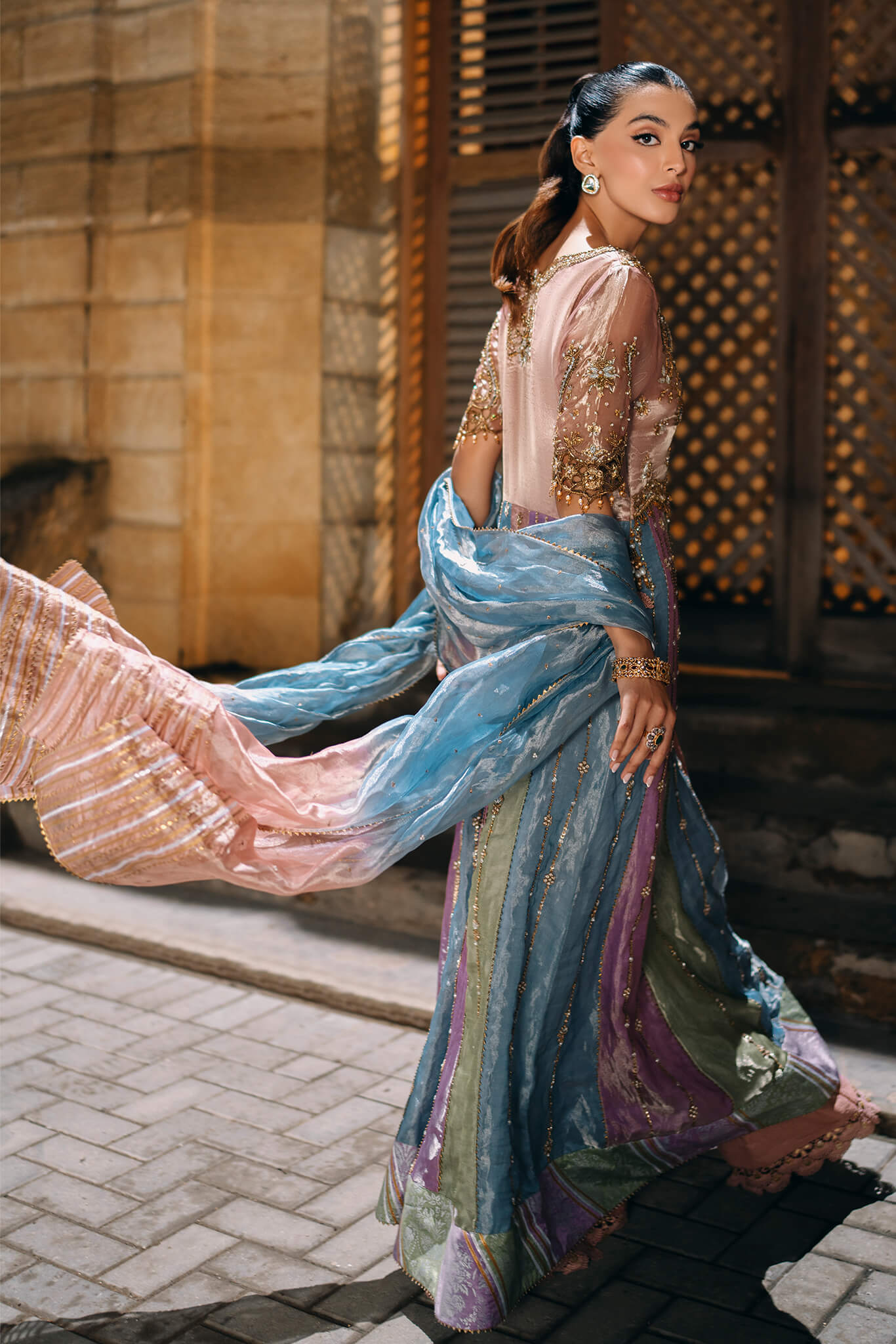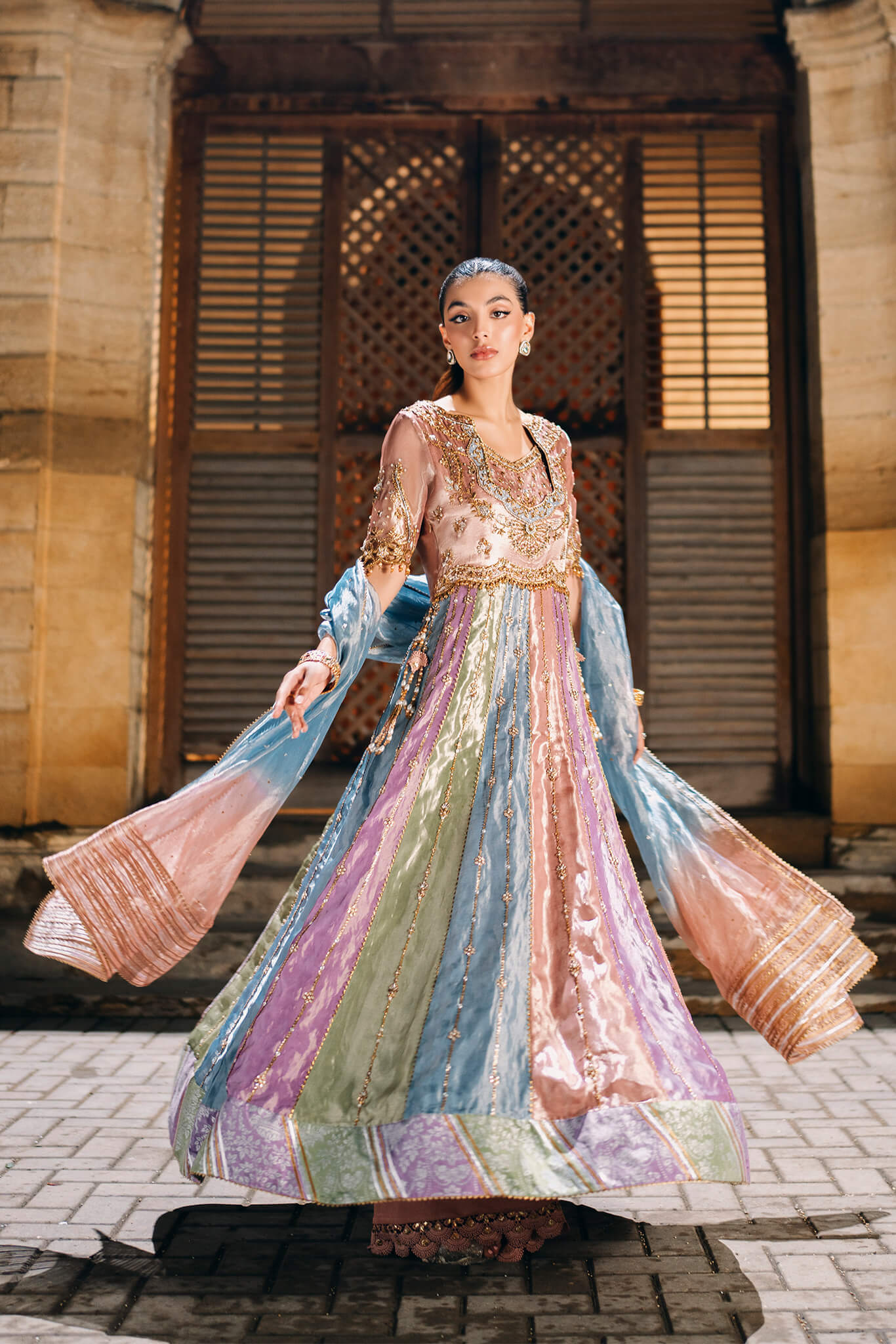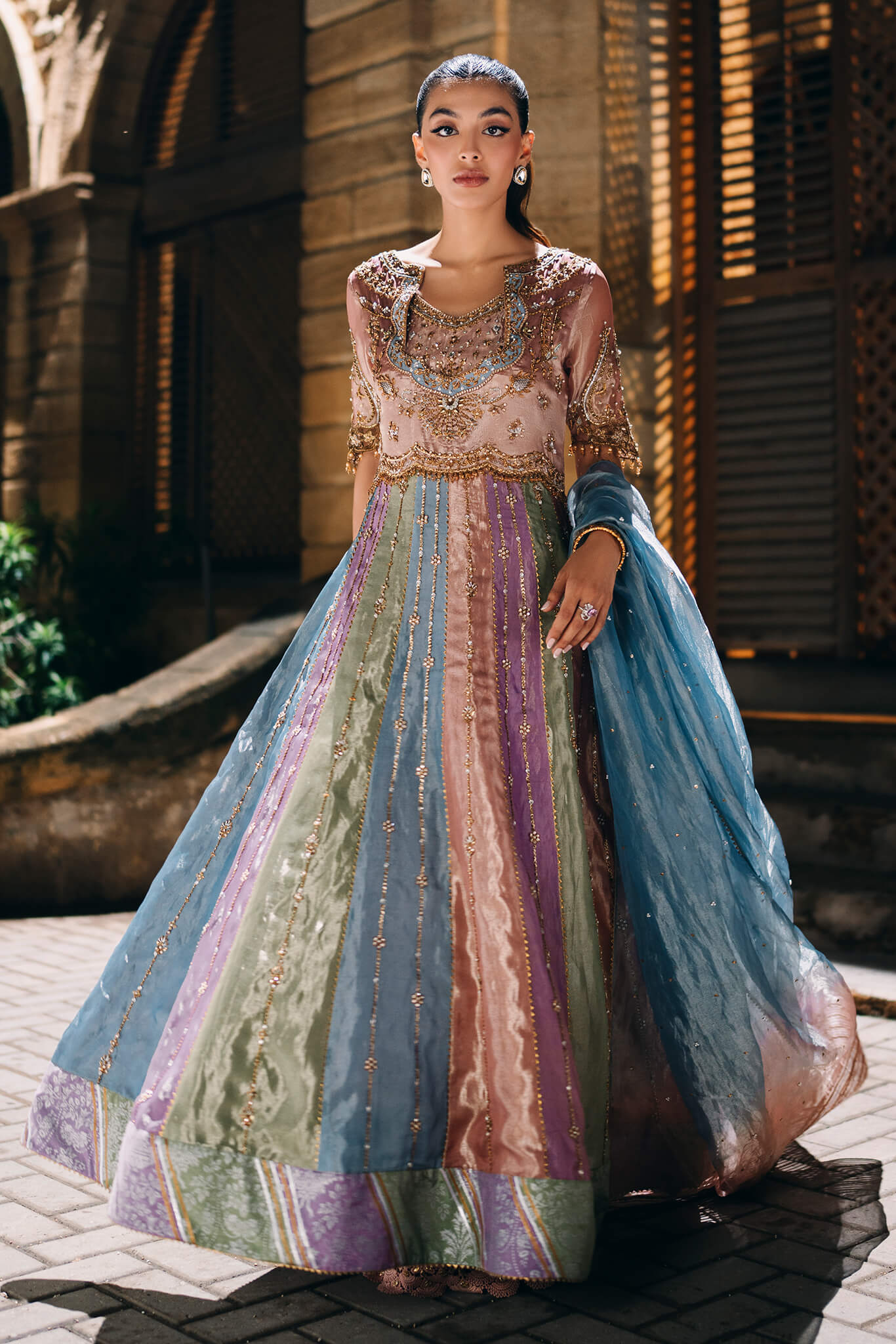 exudes brilliance and grace. The bodice, in a delicate pink pure lama tissue, is embellished with exquisite kora dabka and zardozi work, while the sleeves feature elegant cutwork details. The dramatic flare is a masterpiece of pastel hues—blue, lilac,