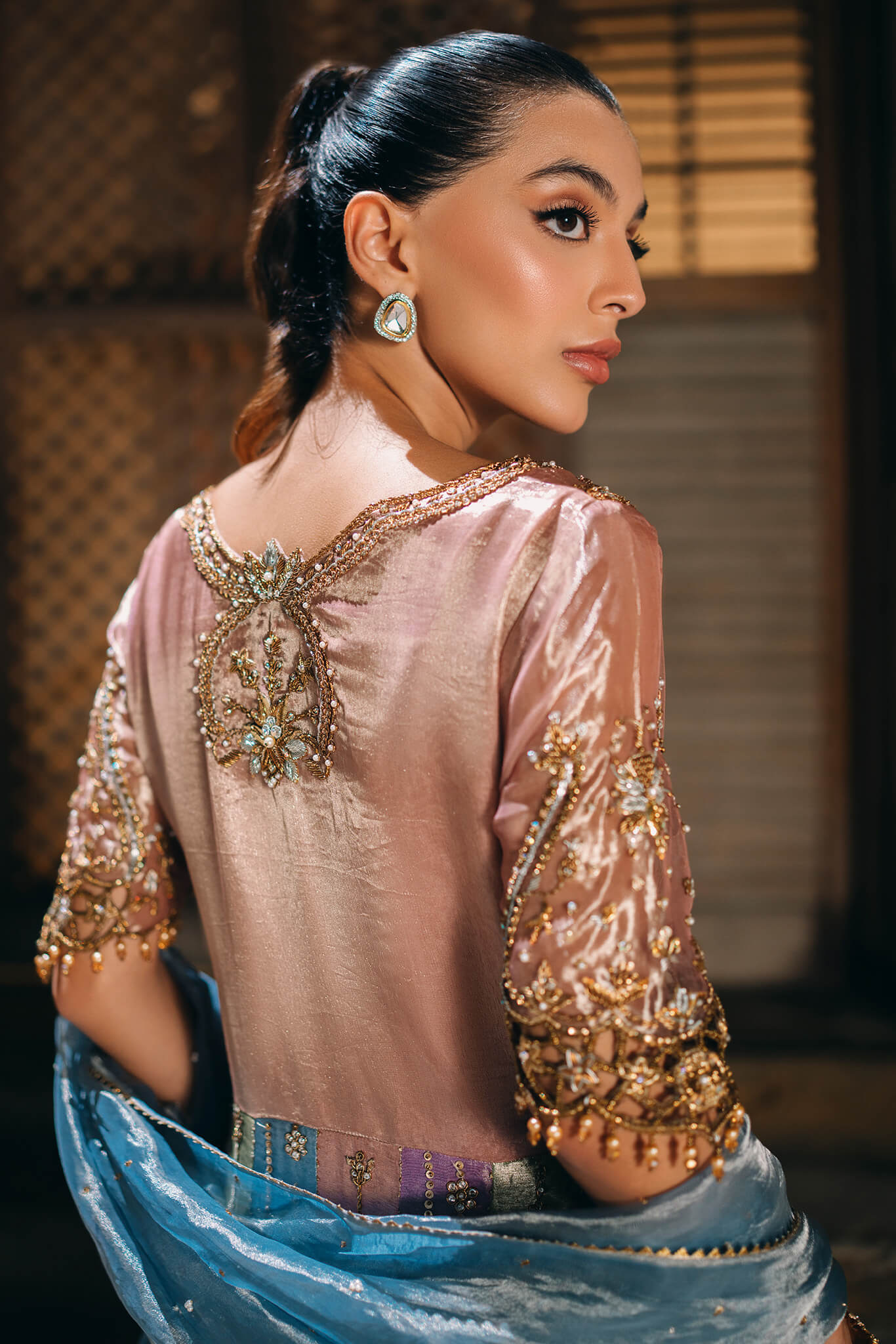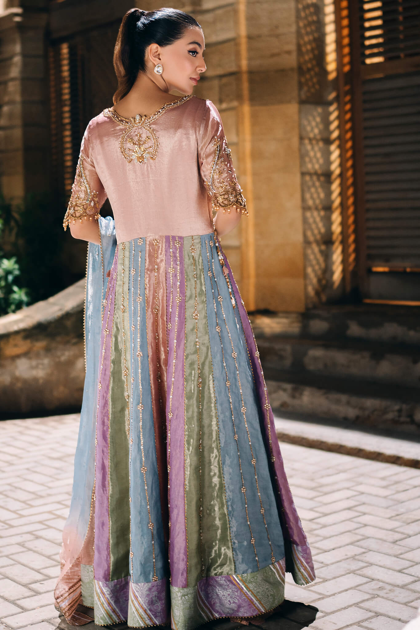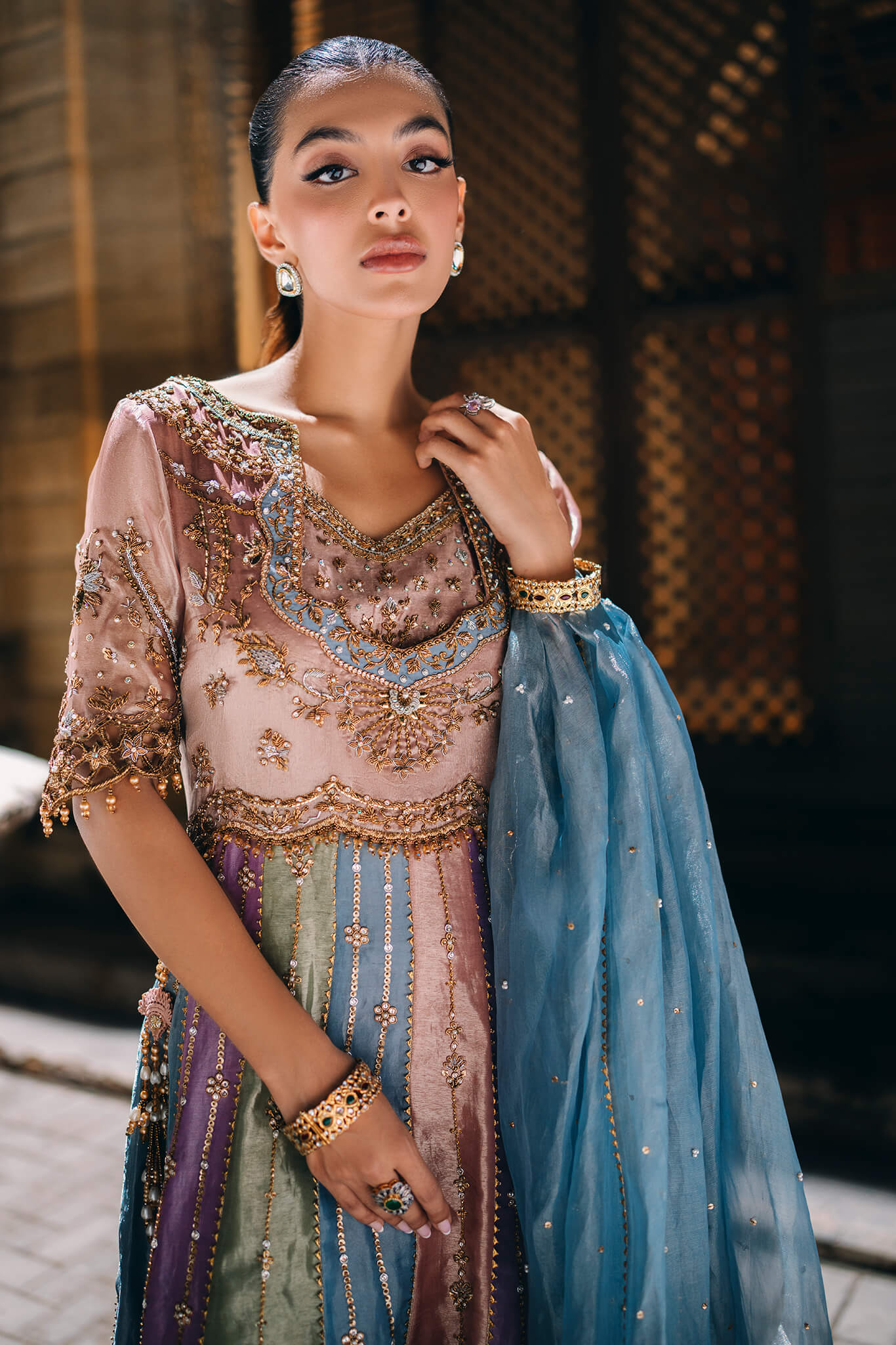 exudes brilliance and grace. The bodice, in a delicate pink pure lama tissue, is embellished with exquisite kora dabka and zardozi work, while the sleeves feature elegant cutwork details. The dramatic flare is a masterpiece of pastel hues—blue, lilac,
