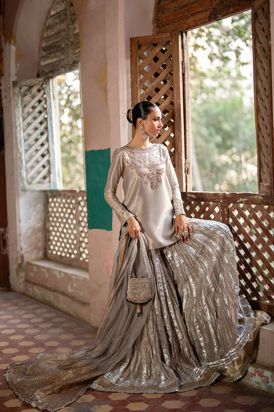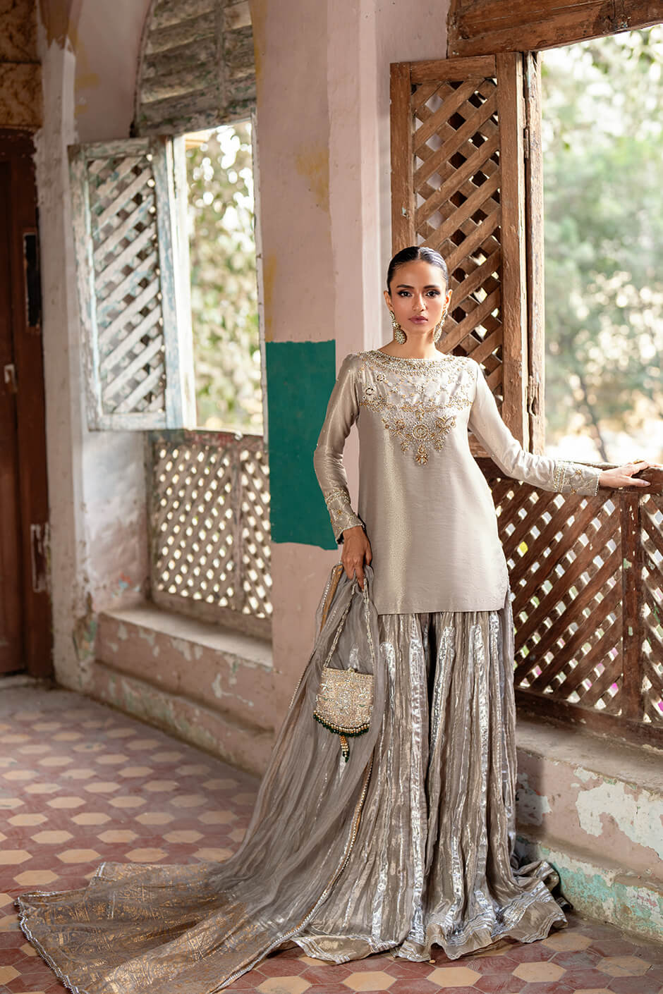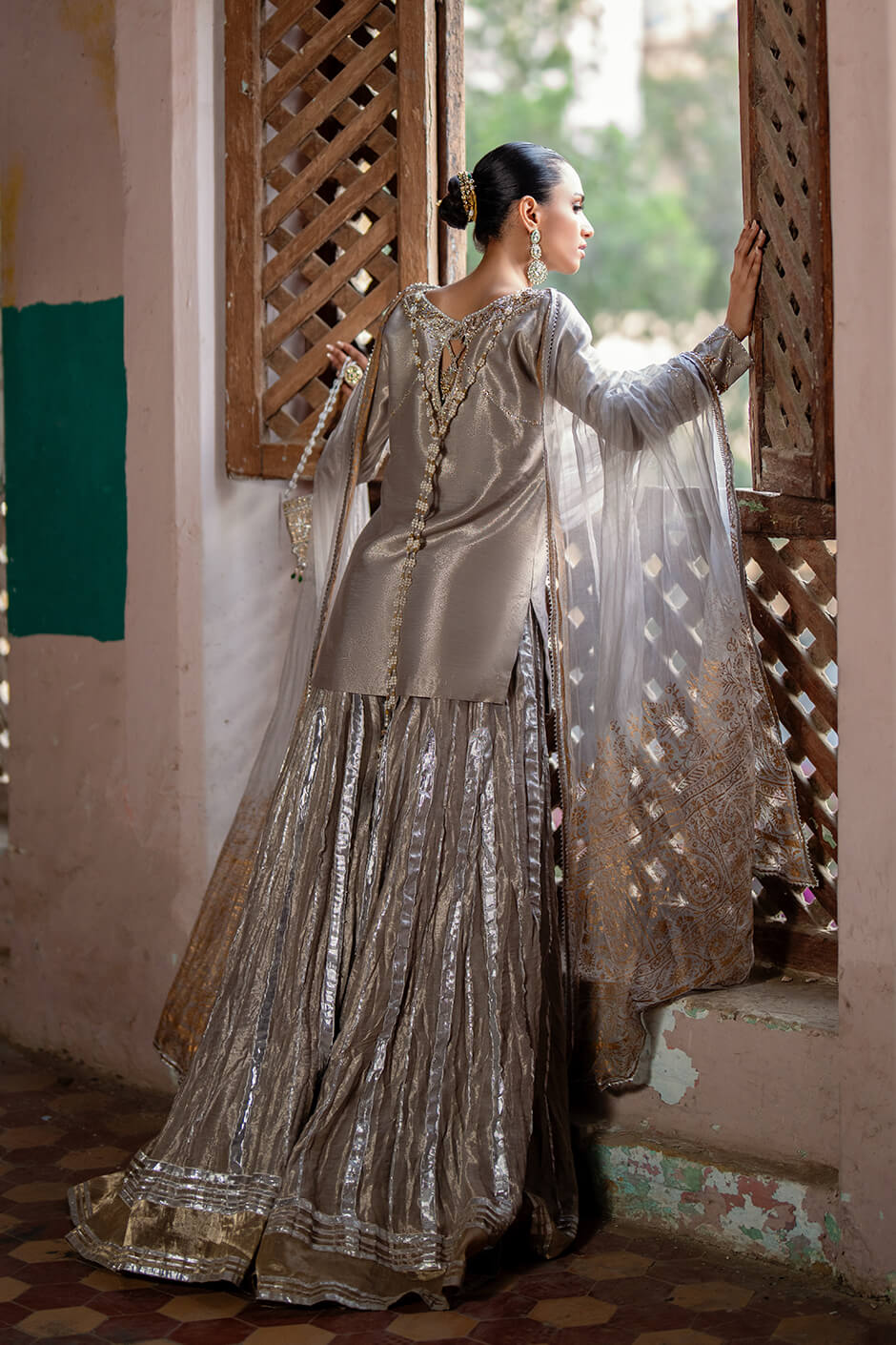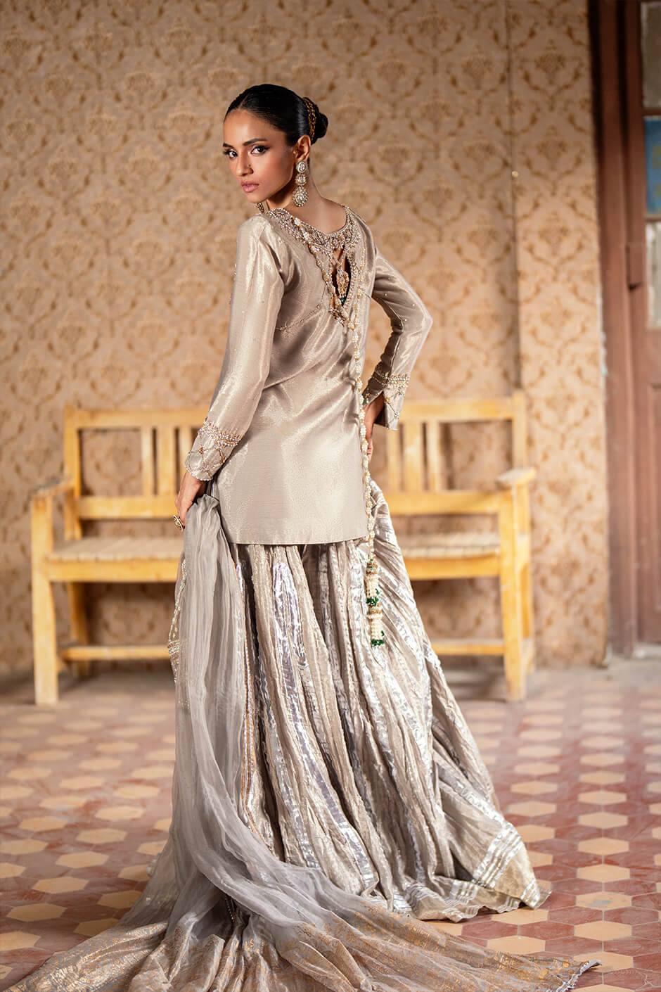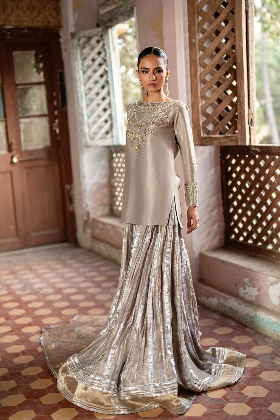Radiating festive charm, this metallic ensemble is a vision of refined elegance. The shirt is beautifully adorned with intricate hand embellishments along the neckline and sleeves, exuding quiet luxury. Paired with crushed gharara pants woven with delicate touches of gota, this ensemble is a graceful nod to tradition.