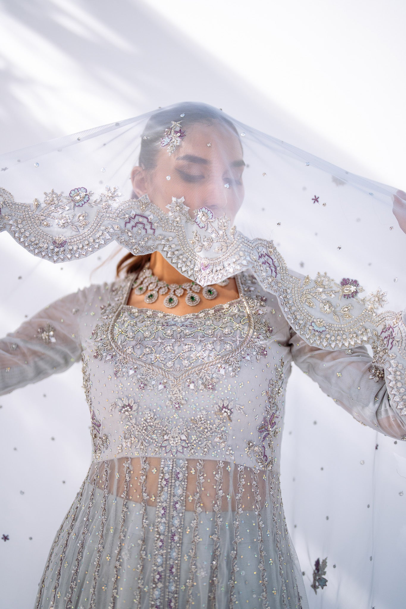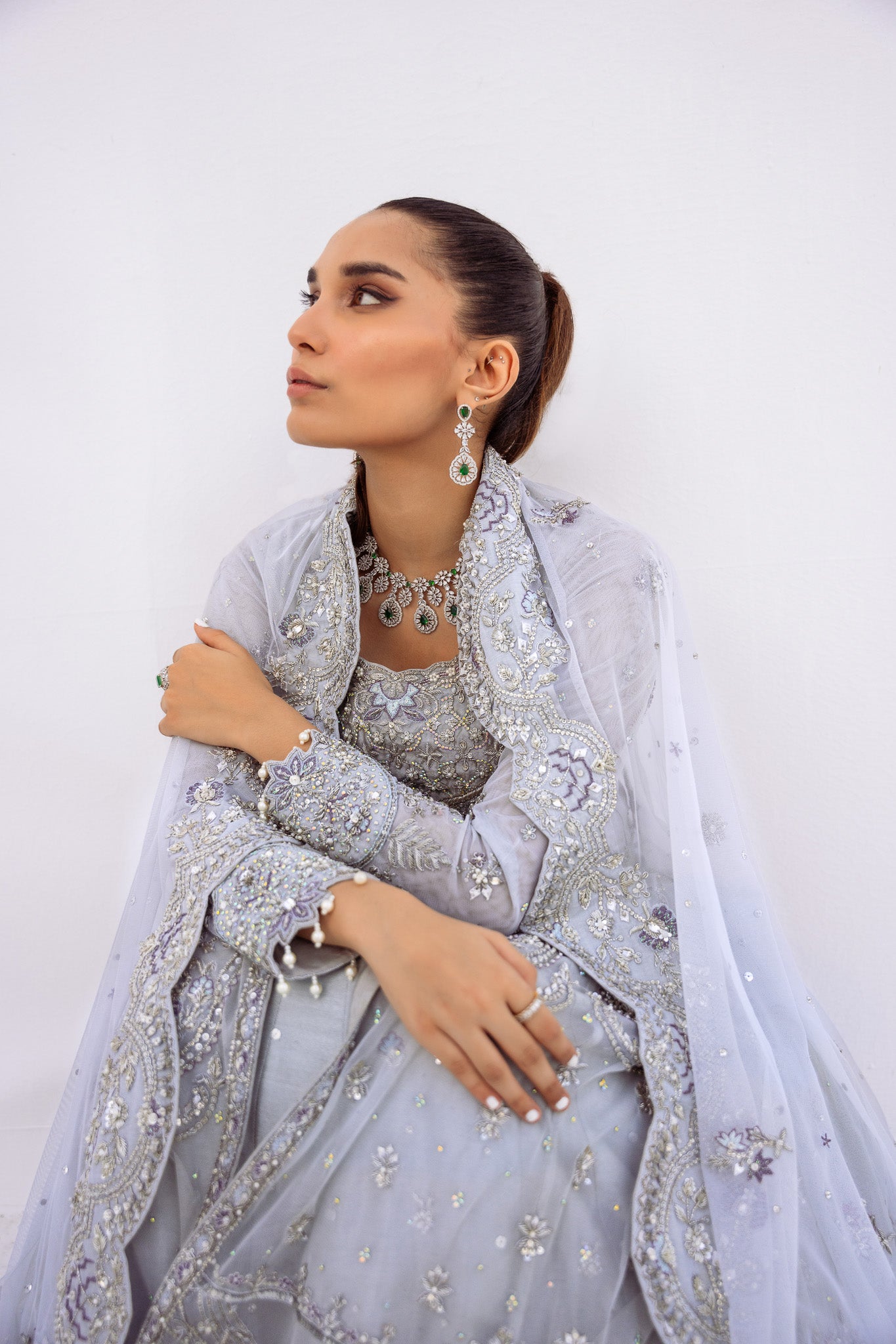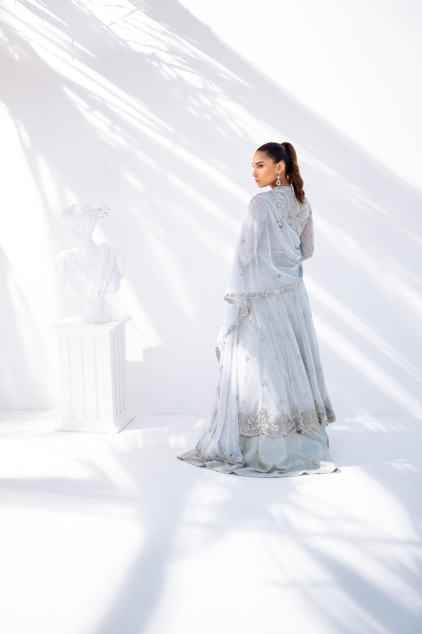 Presenting our Carolina blue pishwas, a vision of elegance and artistry.The bodice is richly adorned with exquisite handwork details of kora,dabka, and zardozi, creating a mesmerizing focal point. The flared kalidar showcases a captivating pattern inspired by Moroccan artwork, infusing the ensemble with an artistic touch. To enhance the silhouette, it is paired with a lama tissue sharara, delicately embellished with light chann booties, perfectly complementing the opulent pishwas. The ensemble is completed with a gracefully draped dupatta, featuring a heavy border with hints of purple resham on one side and a light border on the other three sides.