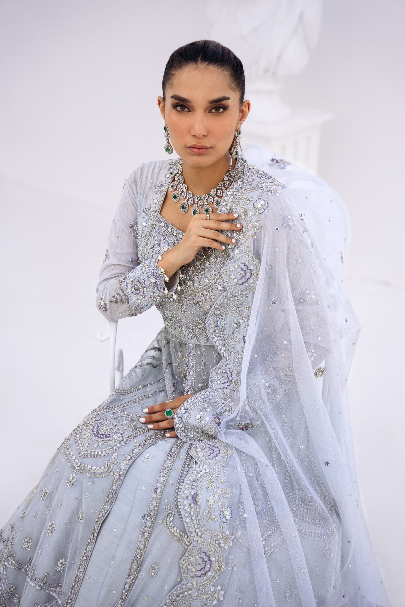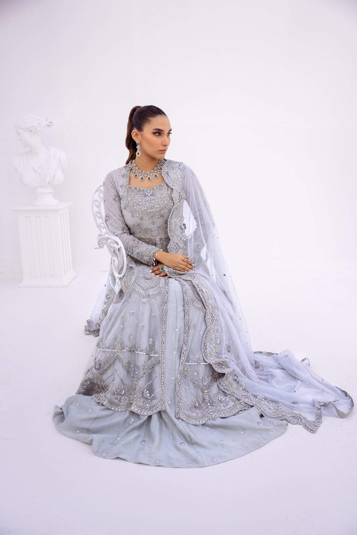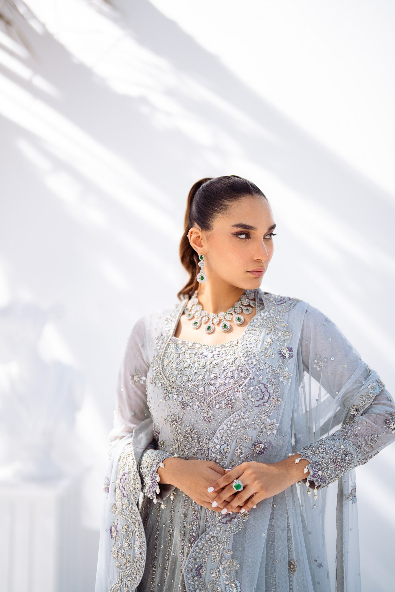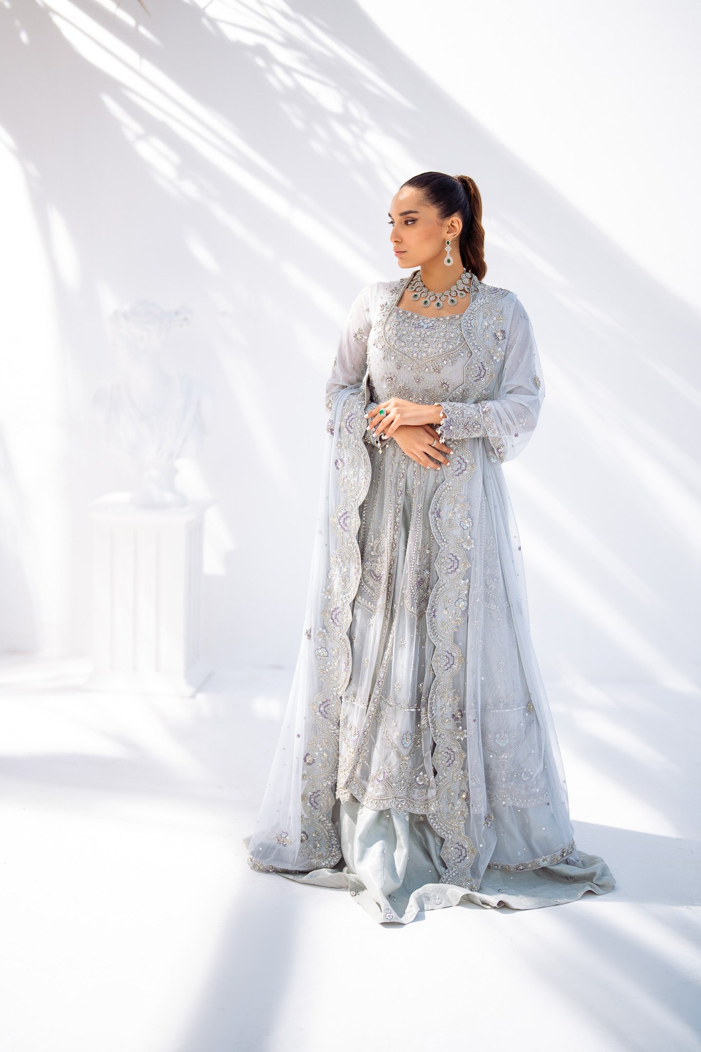 Presenting our Carolina blue pishwas, a vision of elegance and artistry.The bodice is richly adorned with exquisite handwork details of kora,dabka, and zardozi, creating a mesmerizing focal point. The flared kalidar showcases a captivating pattern inspired by Moroccan artwork, infusing the ensemble with an artistic touch. To enhance the silhouette, it is paired with a lama tissue sharara, delicately embellished with light chann booties, perfectly complementing the opulent pishwas. The ensemble is completed with a gracefully draped dupatta, featuring a heavy border with hints of purple resham on one side and a light border on the other three sides.