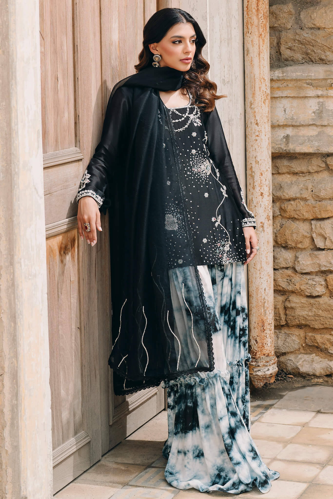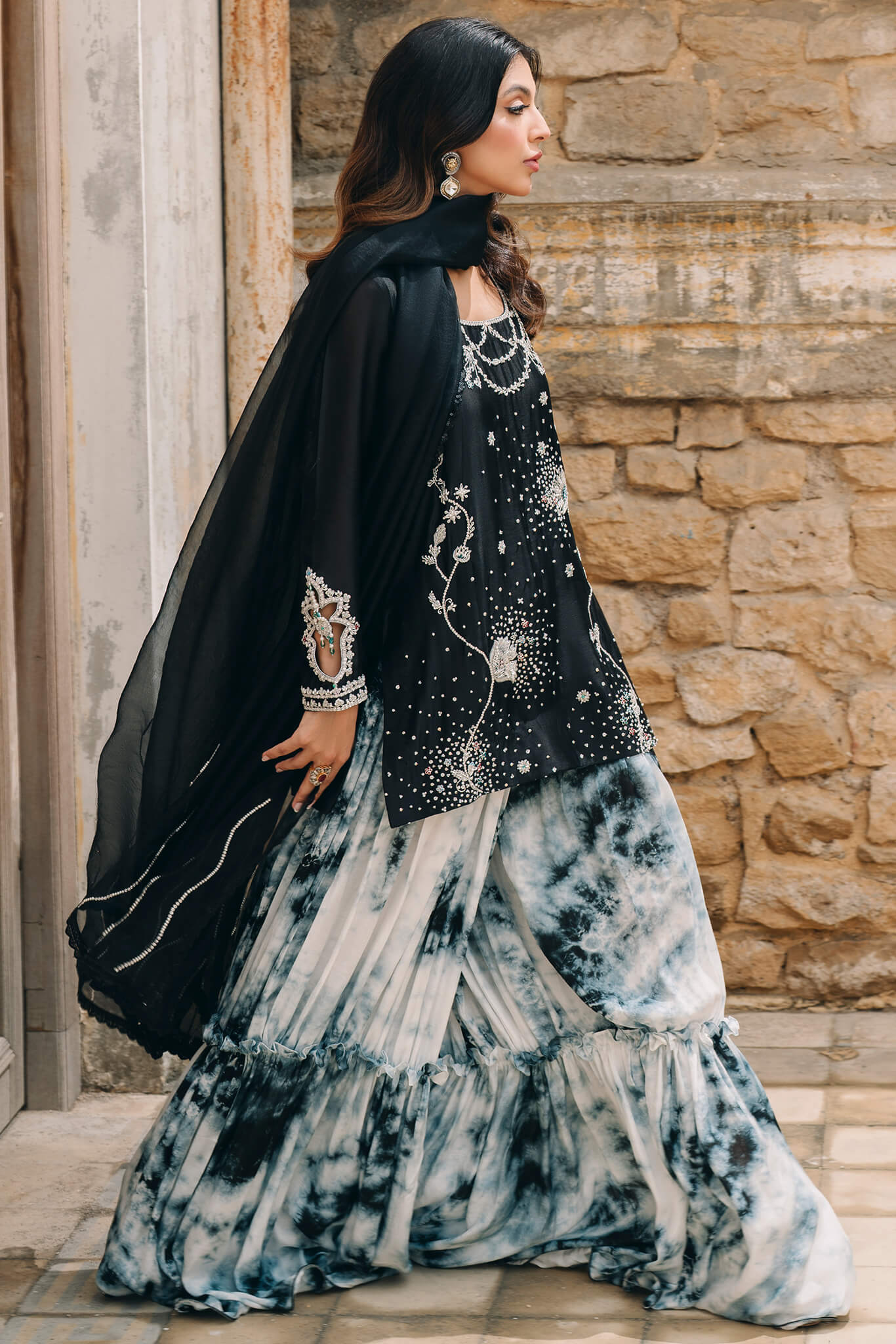 Elevate your style with this striking black outfit, paired with a modern tie-dye gharara that adds a vibrant edge. The shirt dazzles with intricate hand embellishments of kora dabka, zardozi, and a sequined spray, while the sleeves showcase exquisite cutwork details. Complementing the ensemble, a cascading dupatta with
