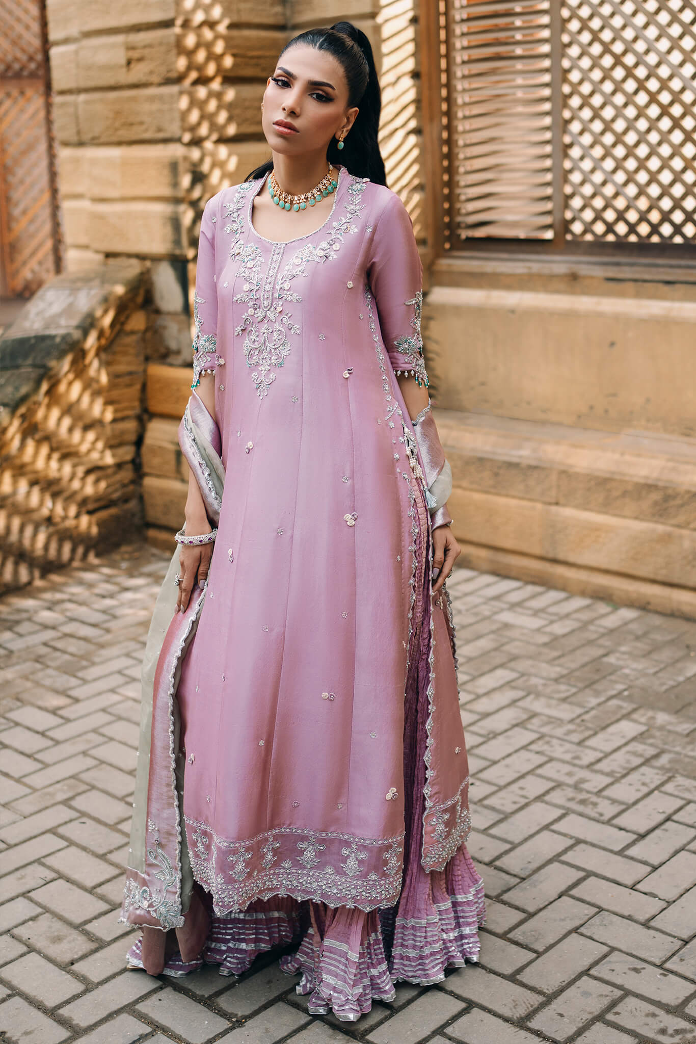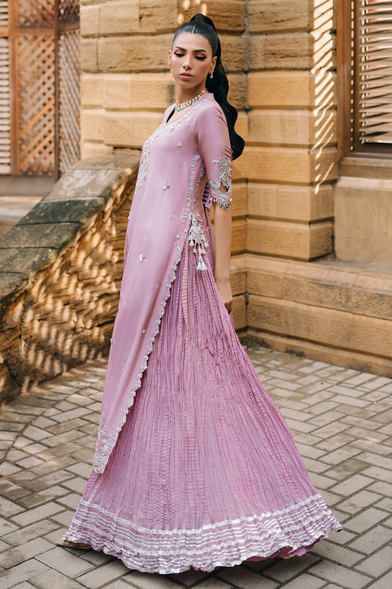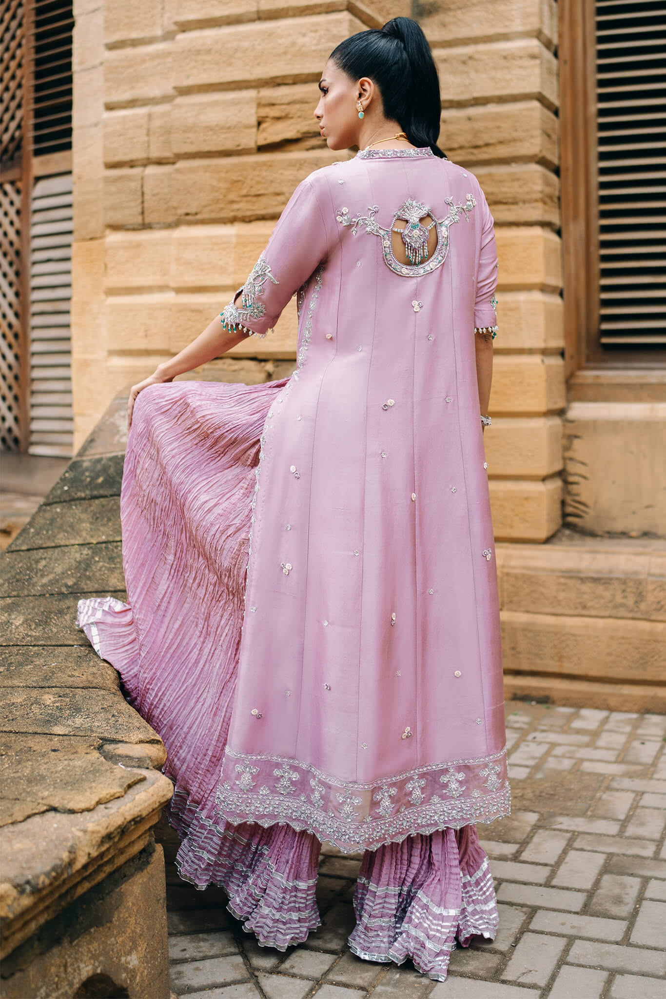 Tania,' a mauve masterpiece that exudes modern elegance.The airline shirt features a hand-detailed neckline and booties, with borders shimmering in Swarovski and zardozi