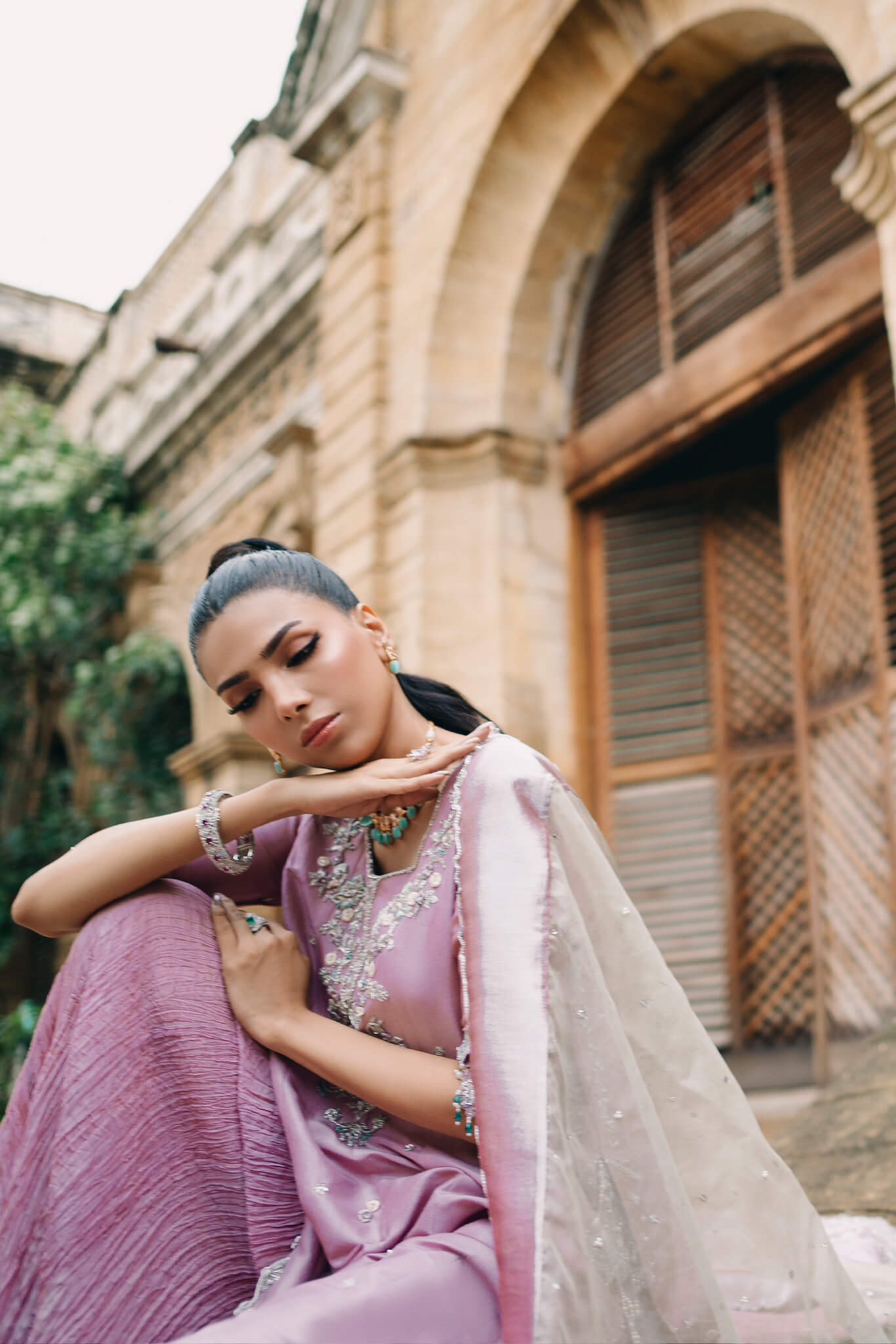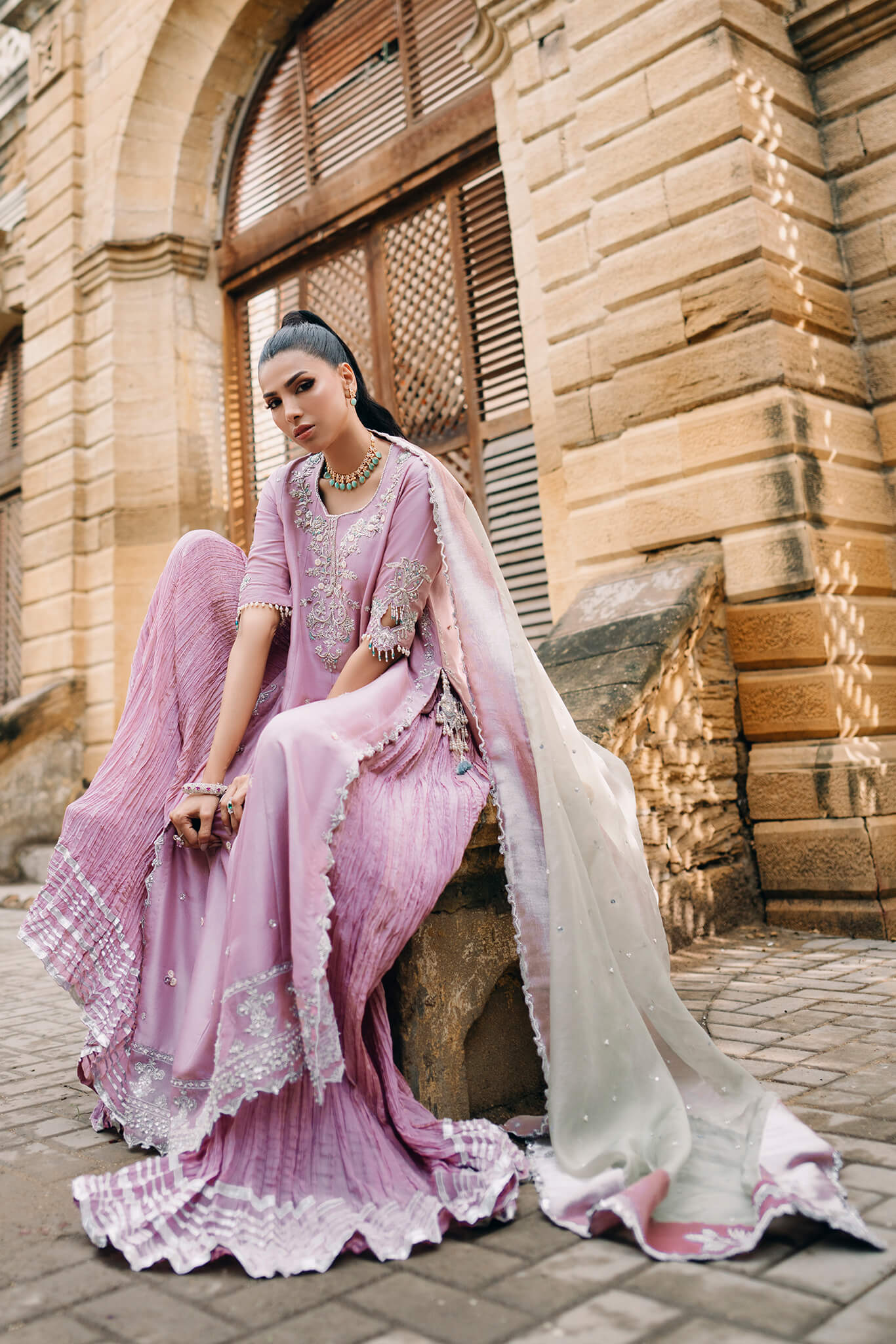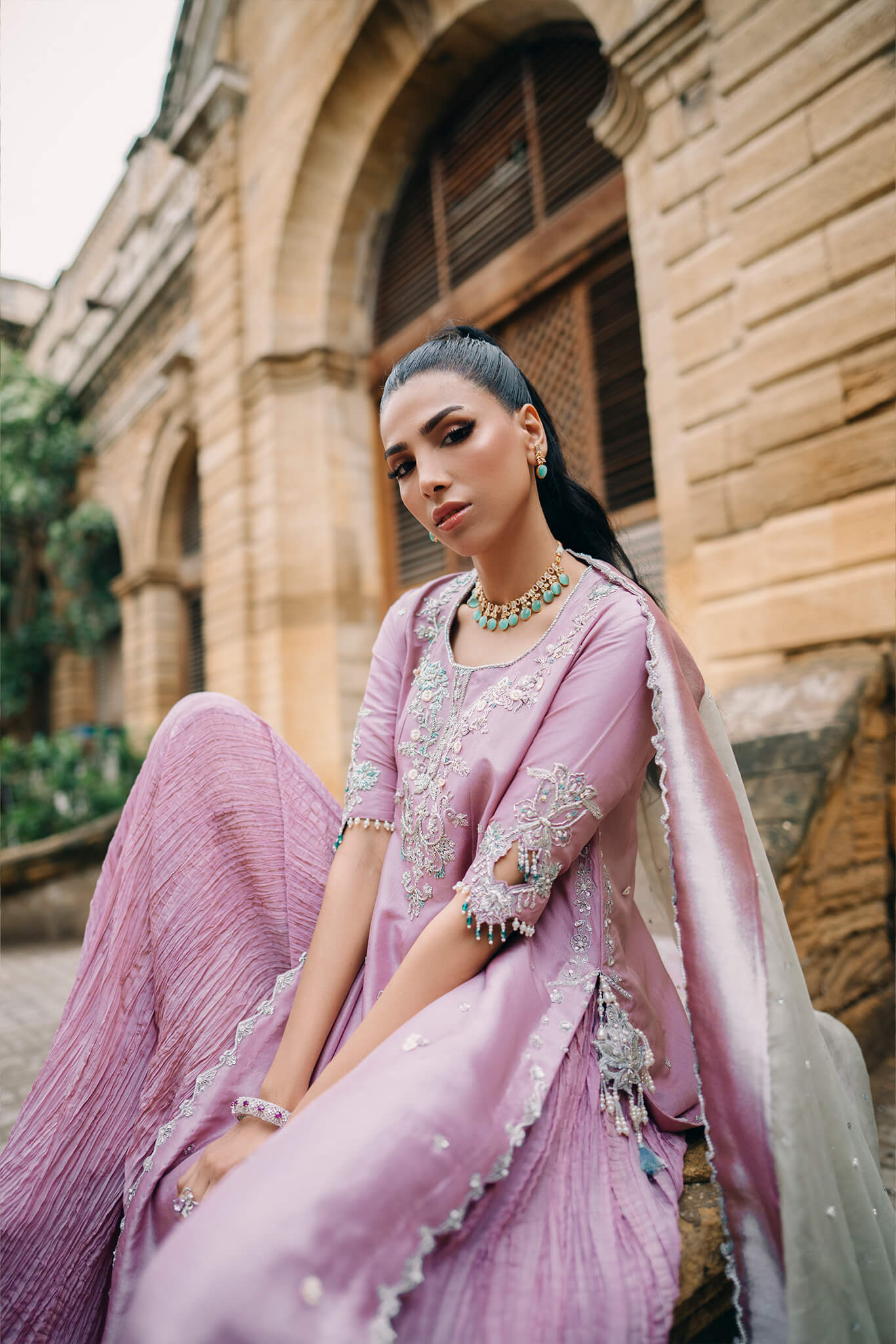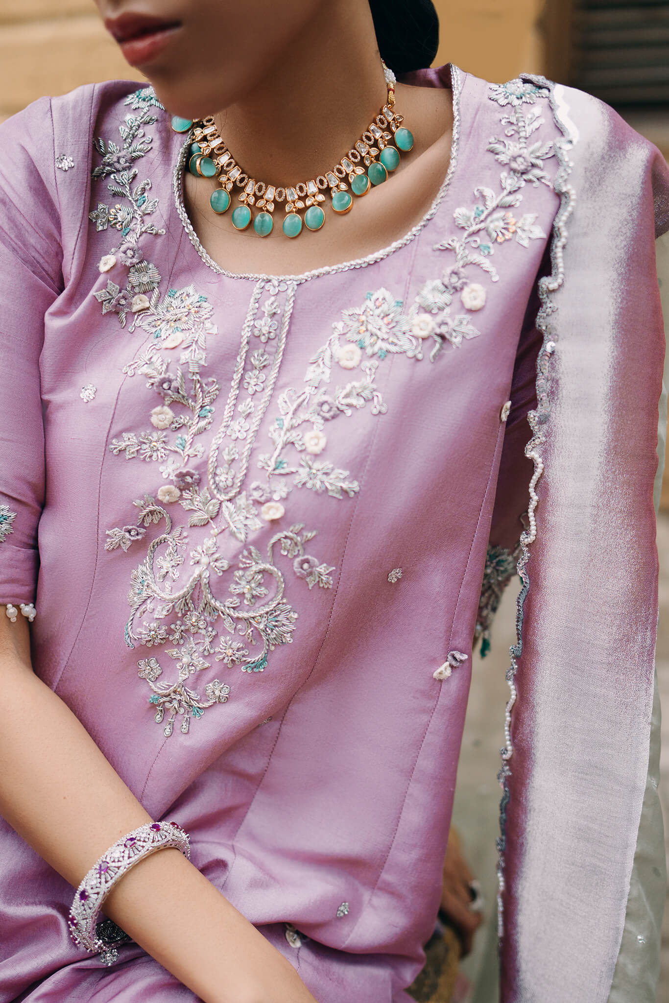 work . Paired with crushed pants and a contrasting mint organza dupatta, 'Tania' offers a strikingly flattering silhouette and a fresh, captivating look.