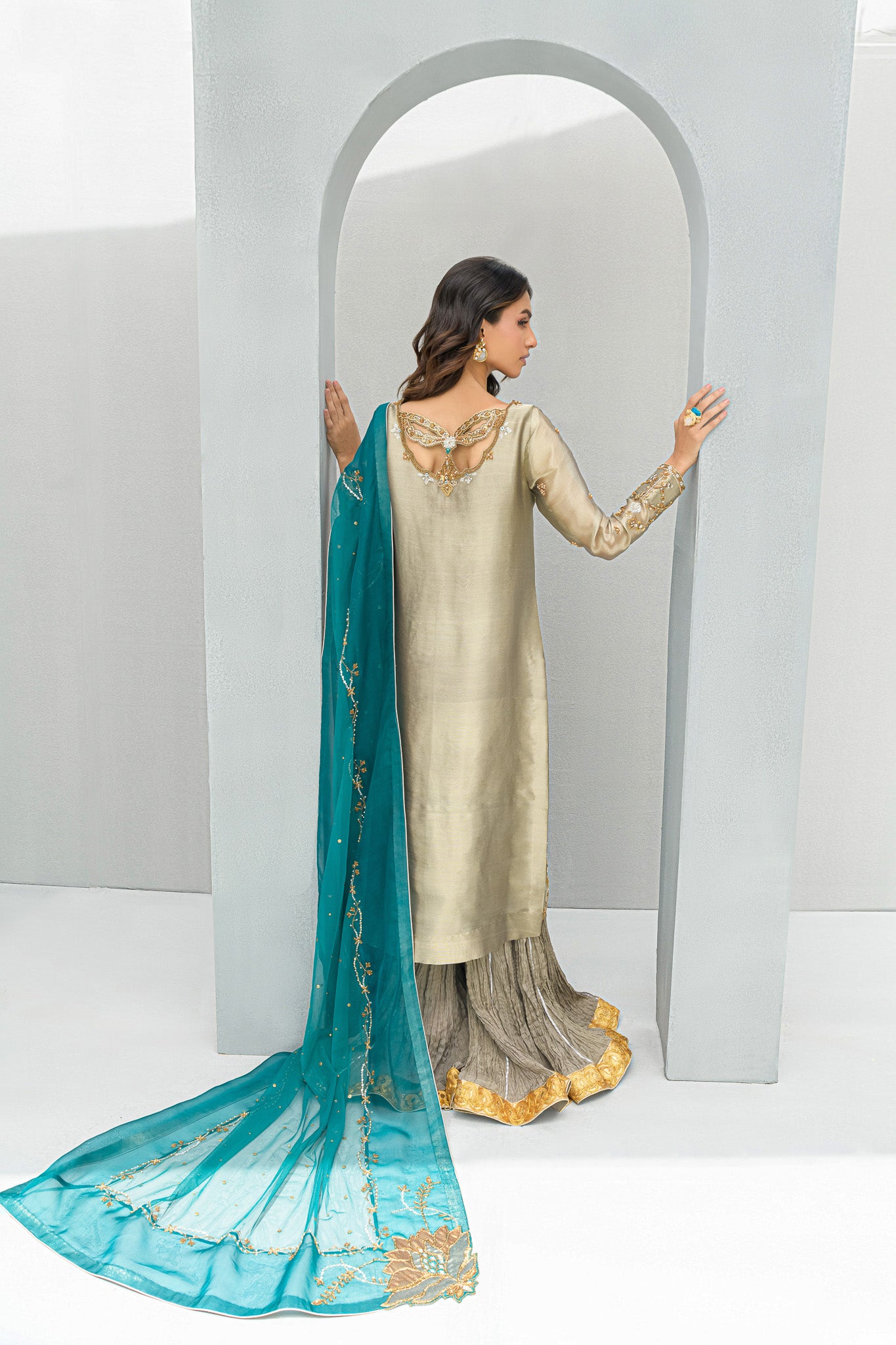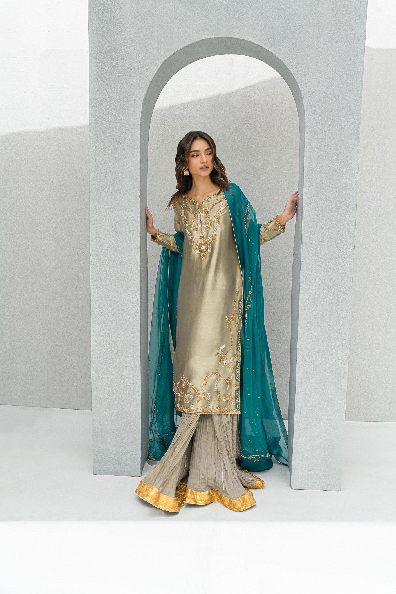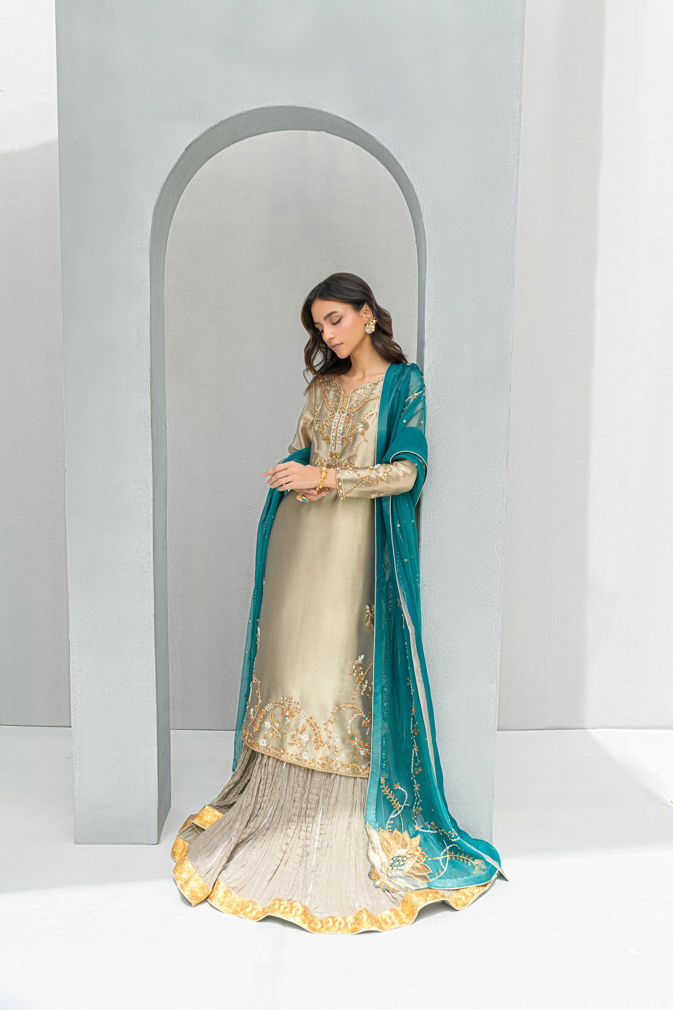 shirt fabric : lama tissue Colour: gold Dupatta colour : bottle green